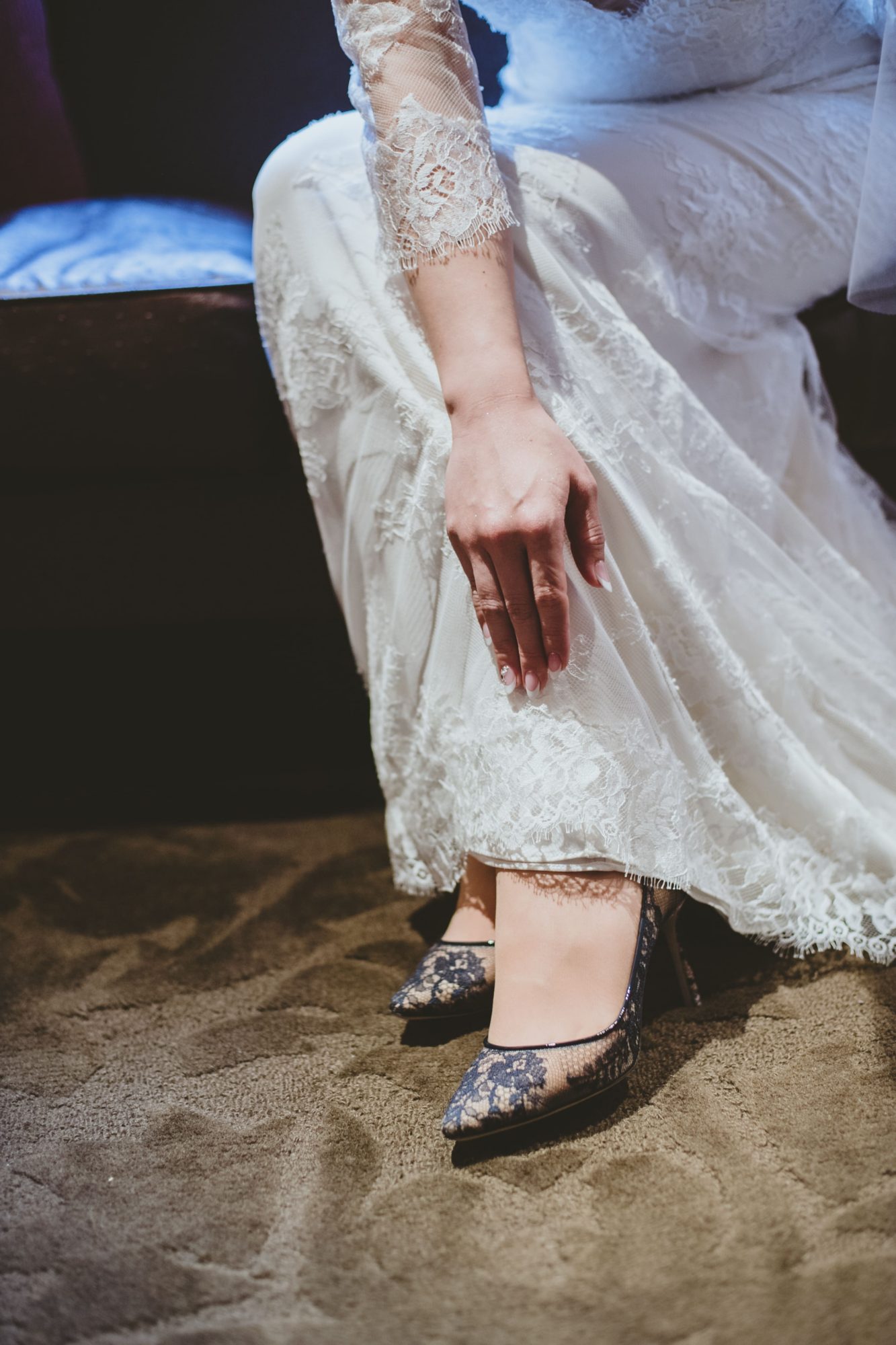 ウェディングシューズにはもともとのテーマカラーに選ばれていたネイビーレースのJIMMY CHOOのシューズ。