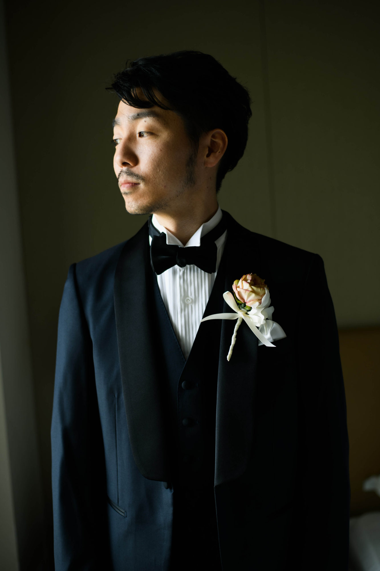 ご新郎様は、ご自身のお身体に、ぴったりとサイズを合わせたご新郎様だけのオーダータキシードに