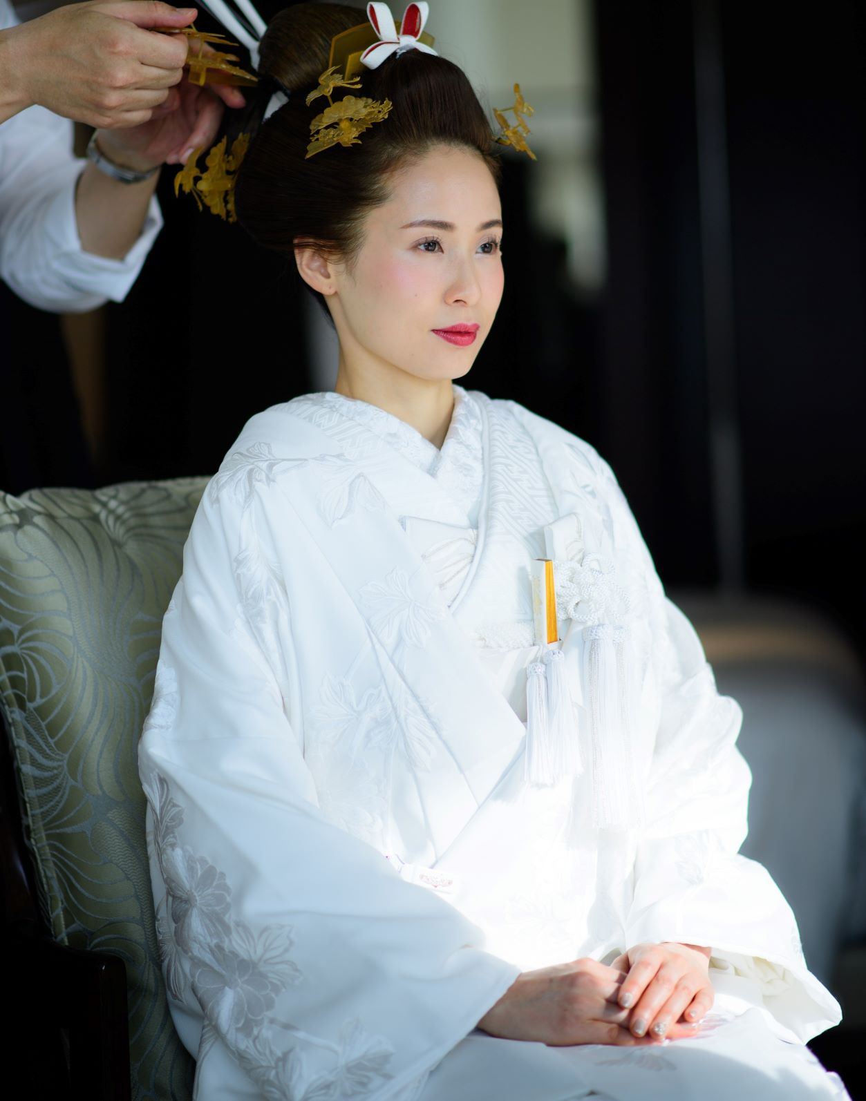 コーディネートには、胸元に百合の葉やつぼみが銀糸刺繍で施された筥迫や懐剣を合わせ、より気品ある印象に。衿元には立体感のある白糸刺繍の半衿を合わせることで、白無垢の光沢感のある艶やかな生地の美しさをより印象付けます。そして、髪型はこの日に向けて伸ばされたご自身の地髪で日本髪を結い上げられました。