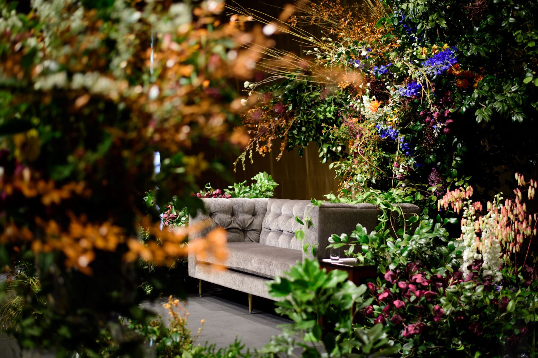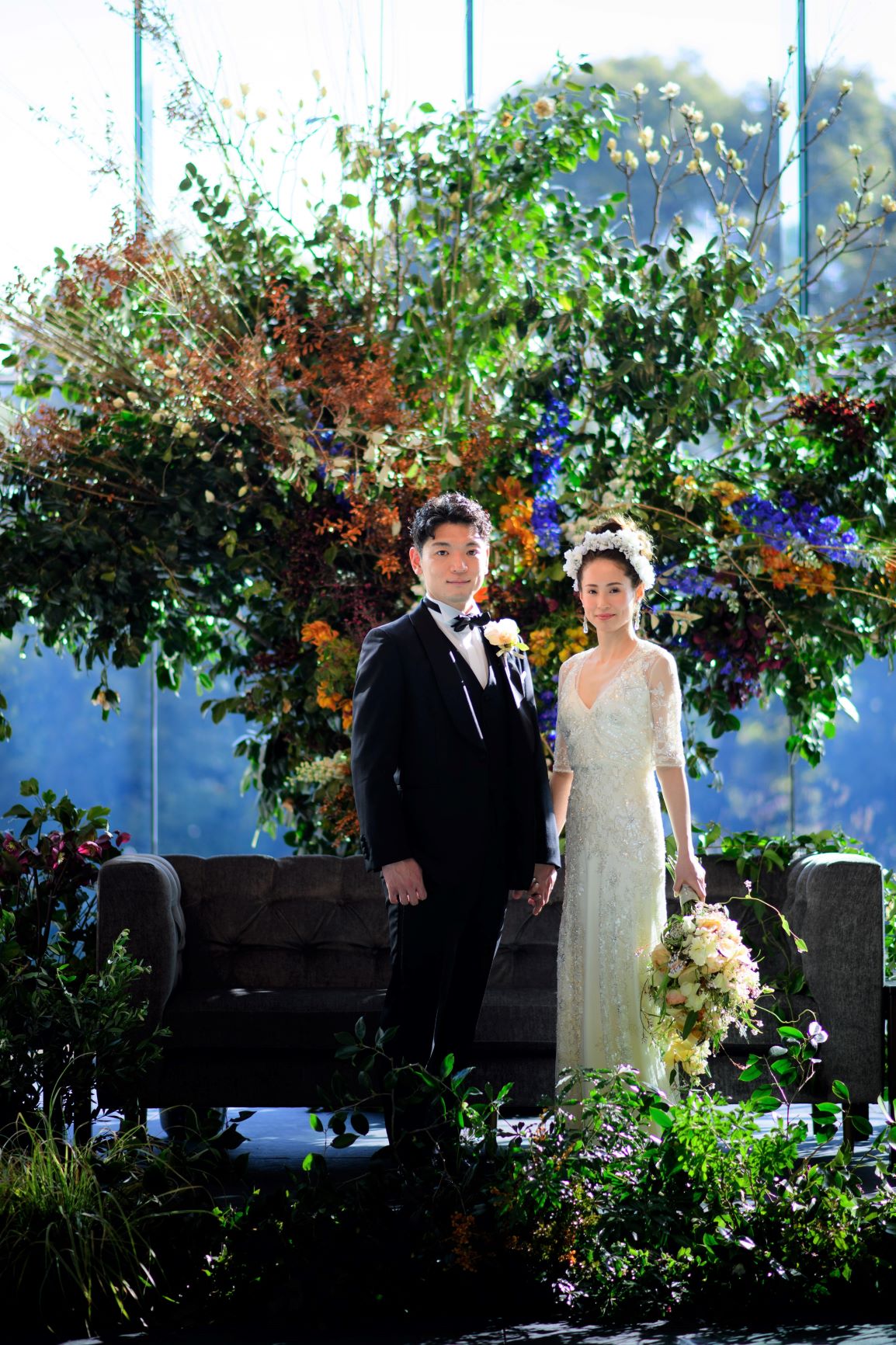 いよいよ、ゲストへのお披露目の時。重厚感のある和装からの大胆なイメージチェンジに、披露宴の扉が開くまでの瞬間、何よりもご新婦様自身の胸が高鳴ります。扉が開き、落ち着いた照明の中で、主役であるお二人だけにスポットライトが当たります。繊細なビーディングを煌めかせながら、水の流れをイメージした絨毯をゆっくりと歩む‥その姿はまるで水面を泳ぐ白鳥のように優雅で、息をのむ美しさに思わず心を奪われます。また、ゲストの注目を集めるシーンはそれだけはありません。お二人が高砂のソファの前に立たれたと同時に葵西のピクチャーウィンドウを覆うカーテンがゆっくりと上がると、会場の雰囲気が一変するのです。瑞々しい葉や花々に溢れんばかりの自然光が差し込み、朝を迎えたばかりの森林にいるかのような神秘的な光景が目の前に広がります。そして、その瞬間ドレスを纏ったご新婦様は、照明の下でのゴージャスな見え方とは異なる、透明感と幸福感に溢れるオーラに包まれます。