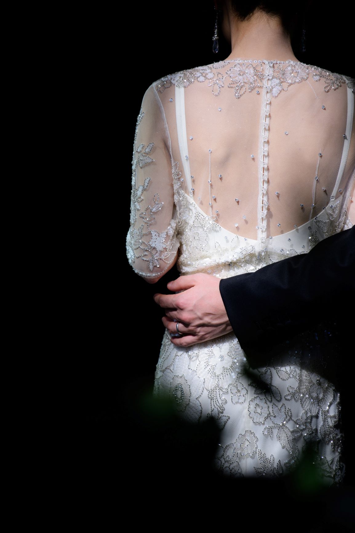 パレスホテル東京の披露宴会場の中でも一番の広さを誇る葵西。お色直しでは存在感のあるプリンセスラインやAラインのウェディングドレスも検討されていたというご新婦様。ただ、その一方で、マーメイドラインやスレンダーラインに対する憧れもお持ちでいらっしゃいました。会場での見え方やご自身の憧れなど様々の想いが交錯する中で、出逢っていただいた一着。それは、Jenny Packham(ジェニー パッカム)の”faith”と名付けられたウェディングドレスでした。なめらかな曲線美と、ビーディングで描かれたフワラー刺繍が特徴のエレガントな一着。主役としての華やかさや存在感を纏いつつも、憧れであった細身のシルエットを叶えます。また、職人の手刺繍によって繊細さを極めたドレスのディティールからは、白無垢にも通ずるご新婦様の“上質さ”へのこだわりを感じました。