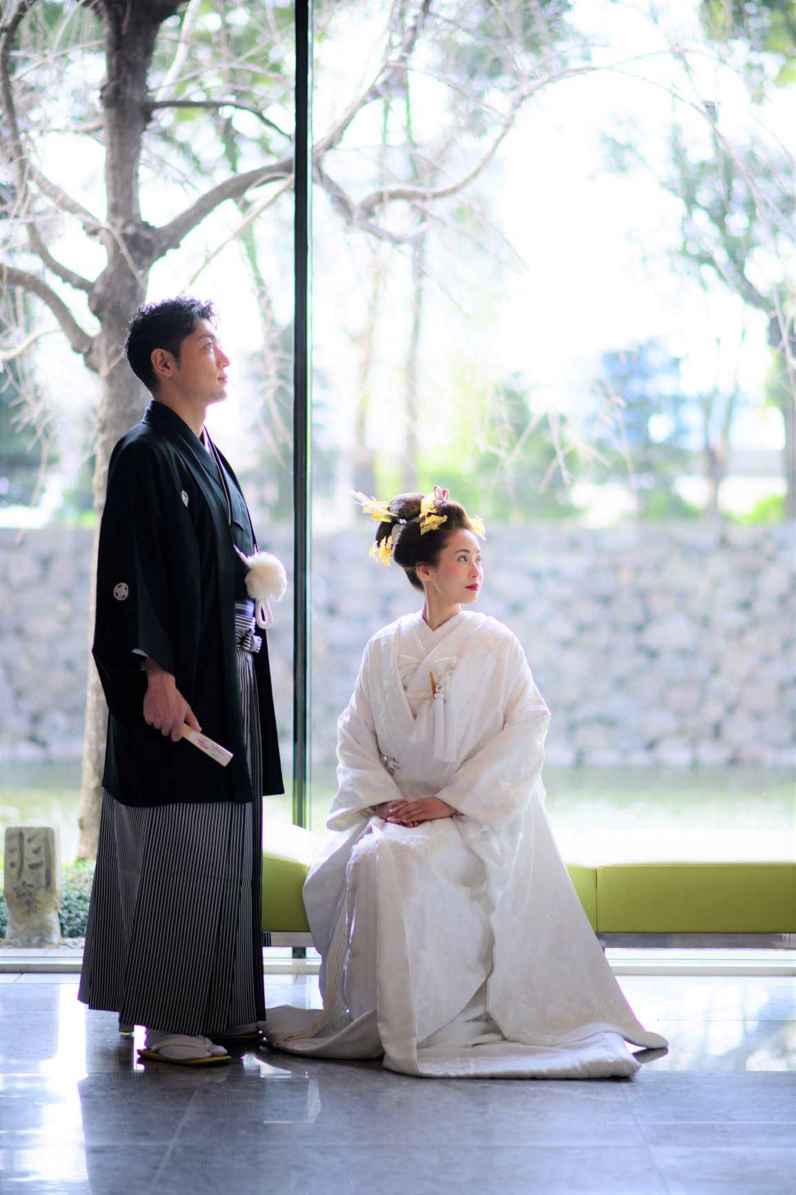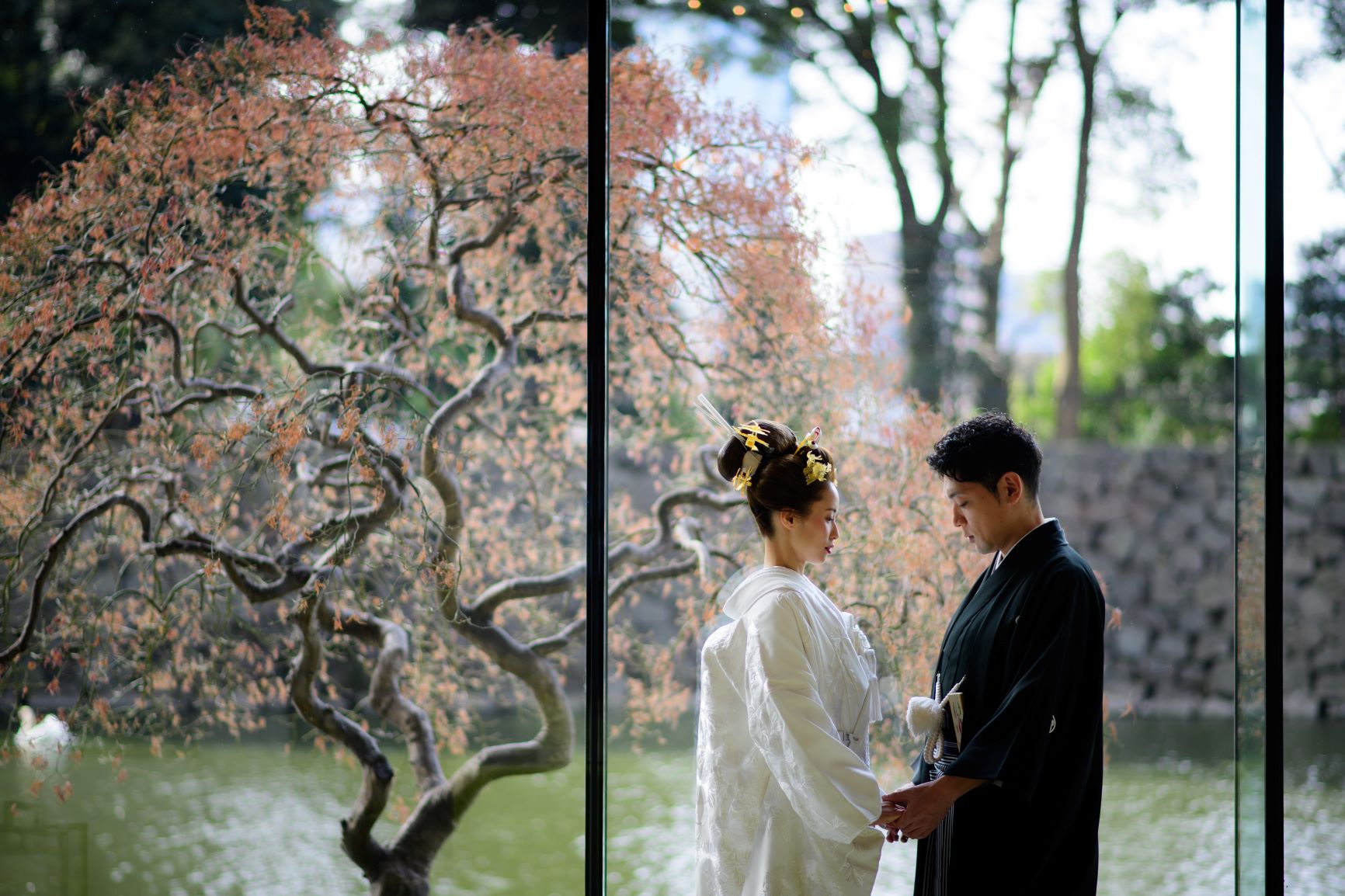 自然光がたっぷりと差し込むパレスホテル東京のピクチャーウインドウから望める皇居の景色をバックに、白無垢や紋付羽織袴をお召いただき、和モダンなお写真を残していただくのはいかがでしょうか