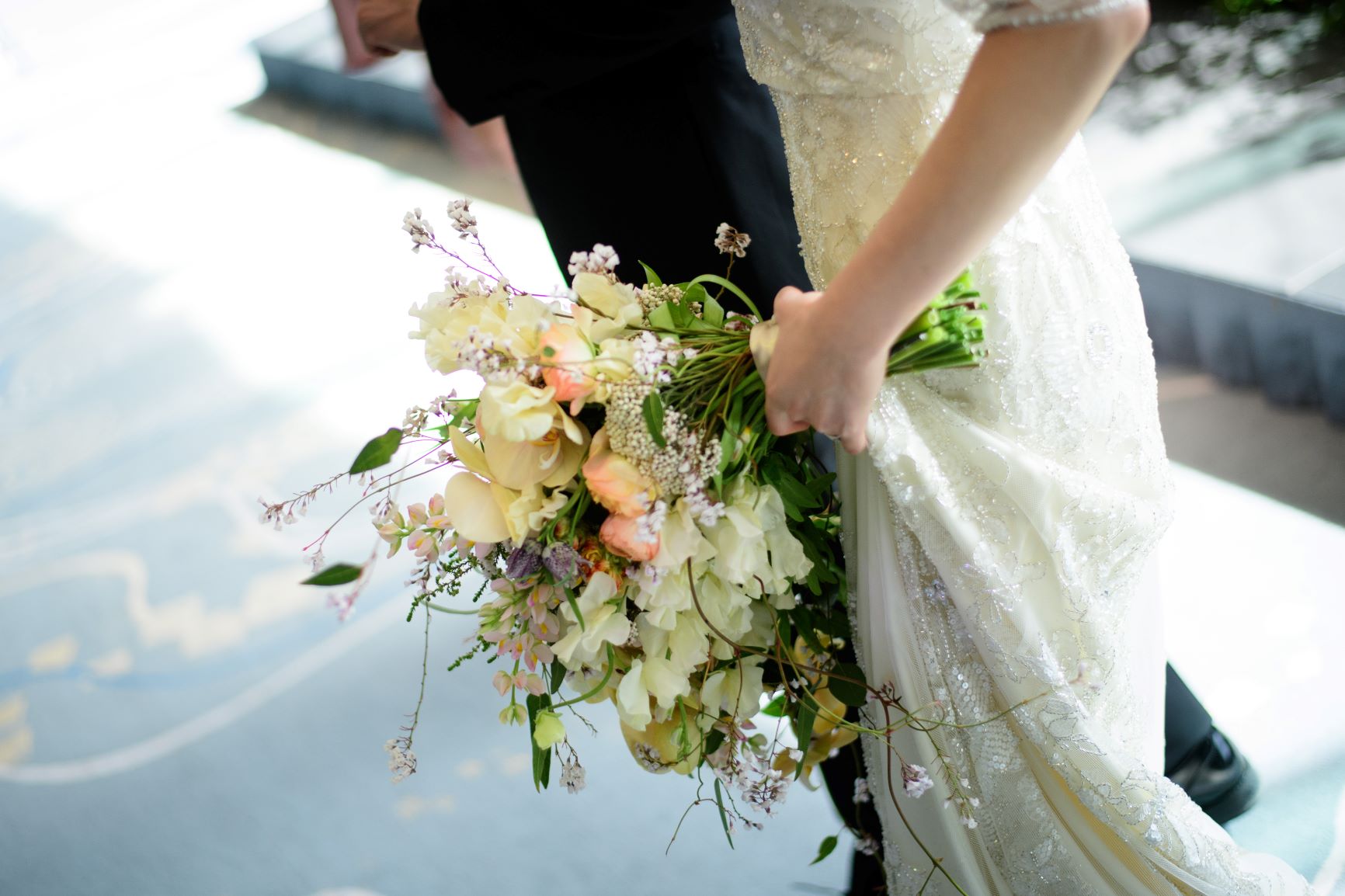 すっきりとしたスレンダーラインのウェディングドレスに大振りのナチュラルなブーケを合わせるコーディネートは、大人花嫁らしいモダンでスタイリッシュなブライズスタイルを叶えます