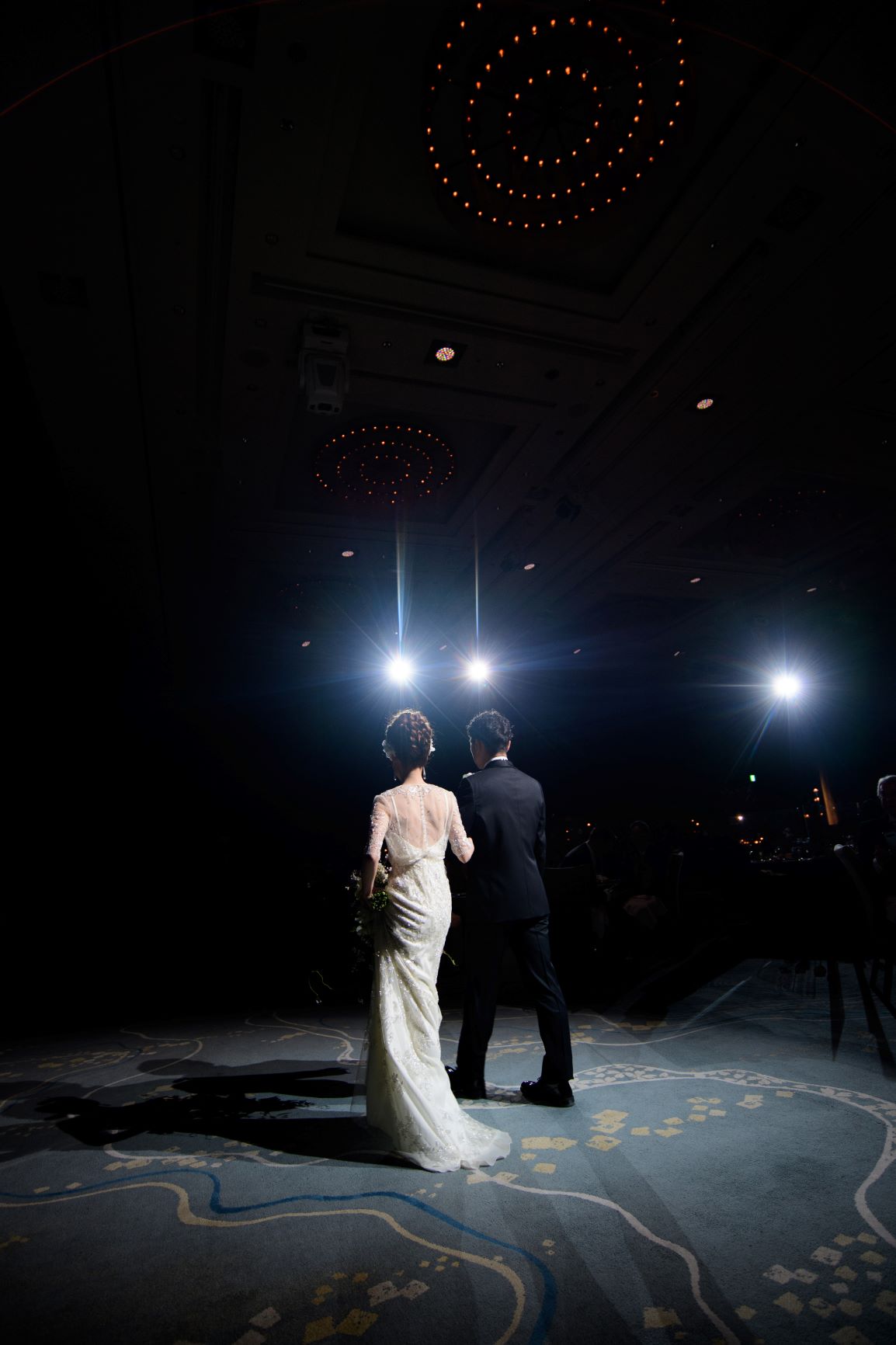パレスホテル東京・葵西でのお色直しでジェニーパッカムのスレンダーラインのウェディングドレスとブラックフォーマルのタキシードを身に纏い、ご入場された新郎新婦様
