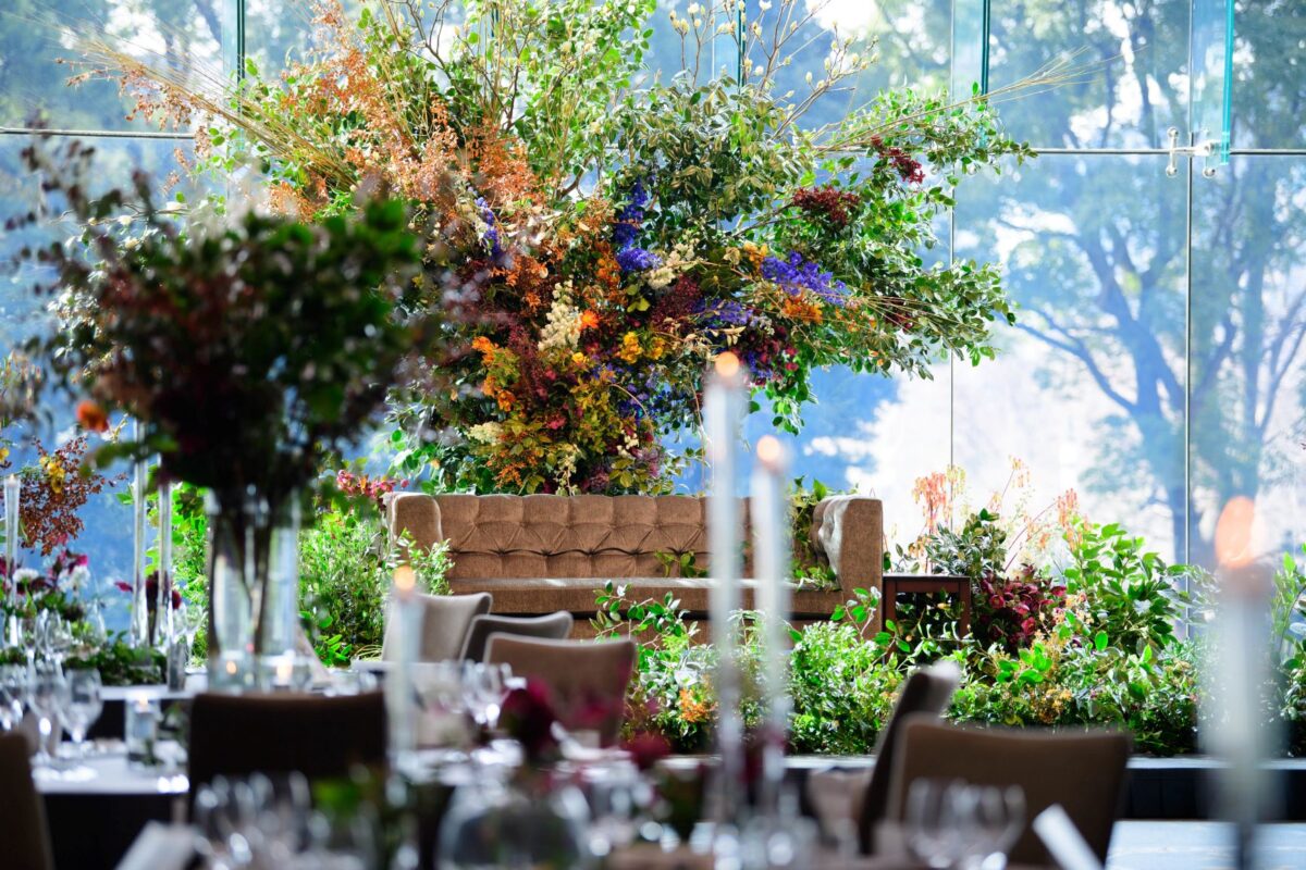 ラグジュアリーな煌めきを放つスレンダーラインのウェディングドレスと、グリーンを基調とした存在感のある会場装花は、パレスホテル東京の天井高で広々とした披露宴会場の中でも圧倒的なインパクトを与えます