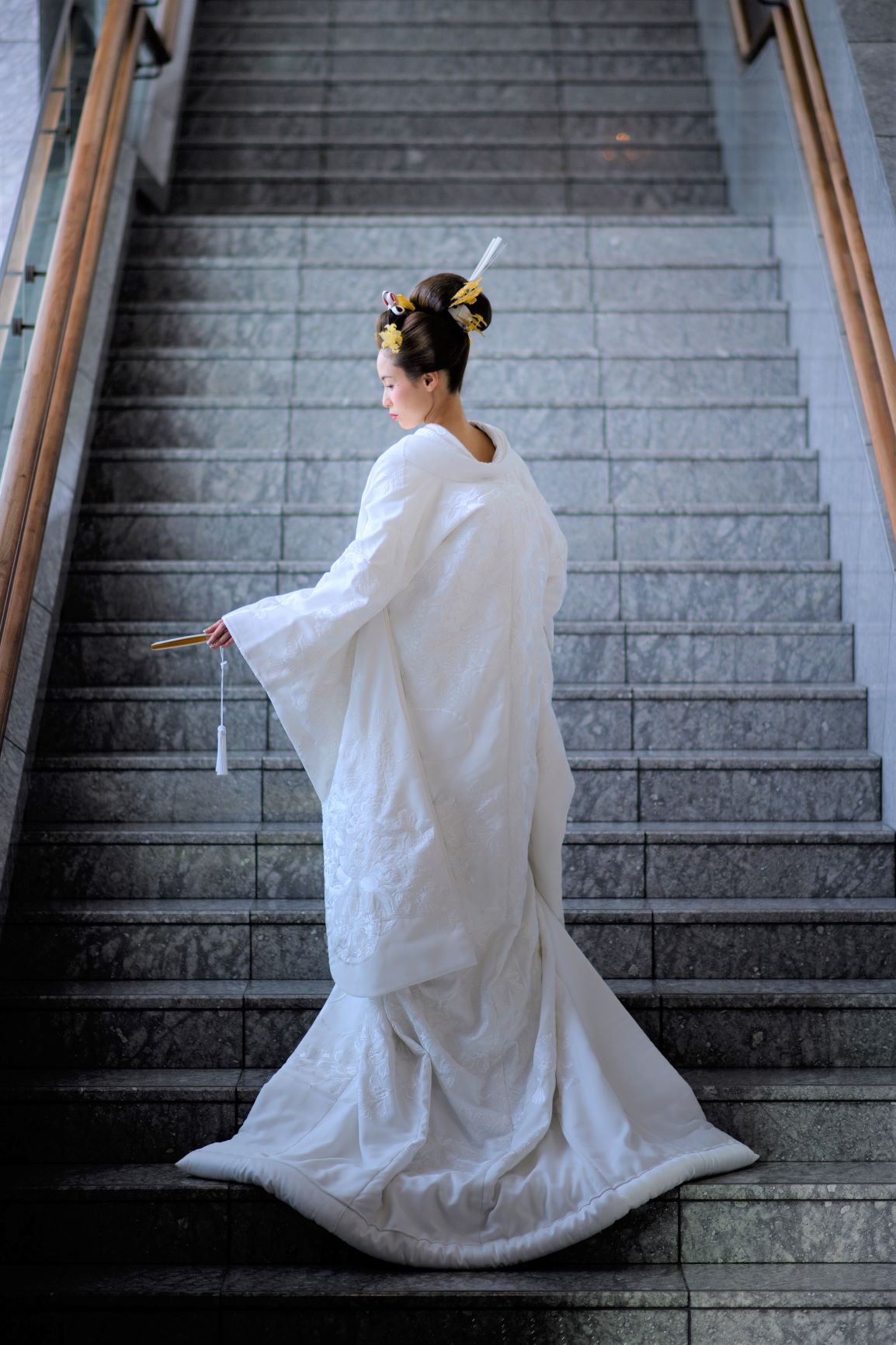 パレスホテル東京の人気撮影スポットである大階段でのお写真など、前撮りやフォトウェディングでも写真映えする総絵羽模様の白無垢をお召しになられたご新婦様