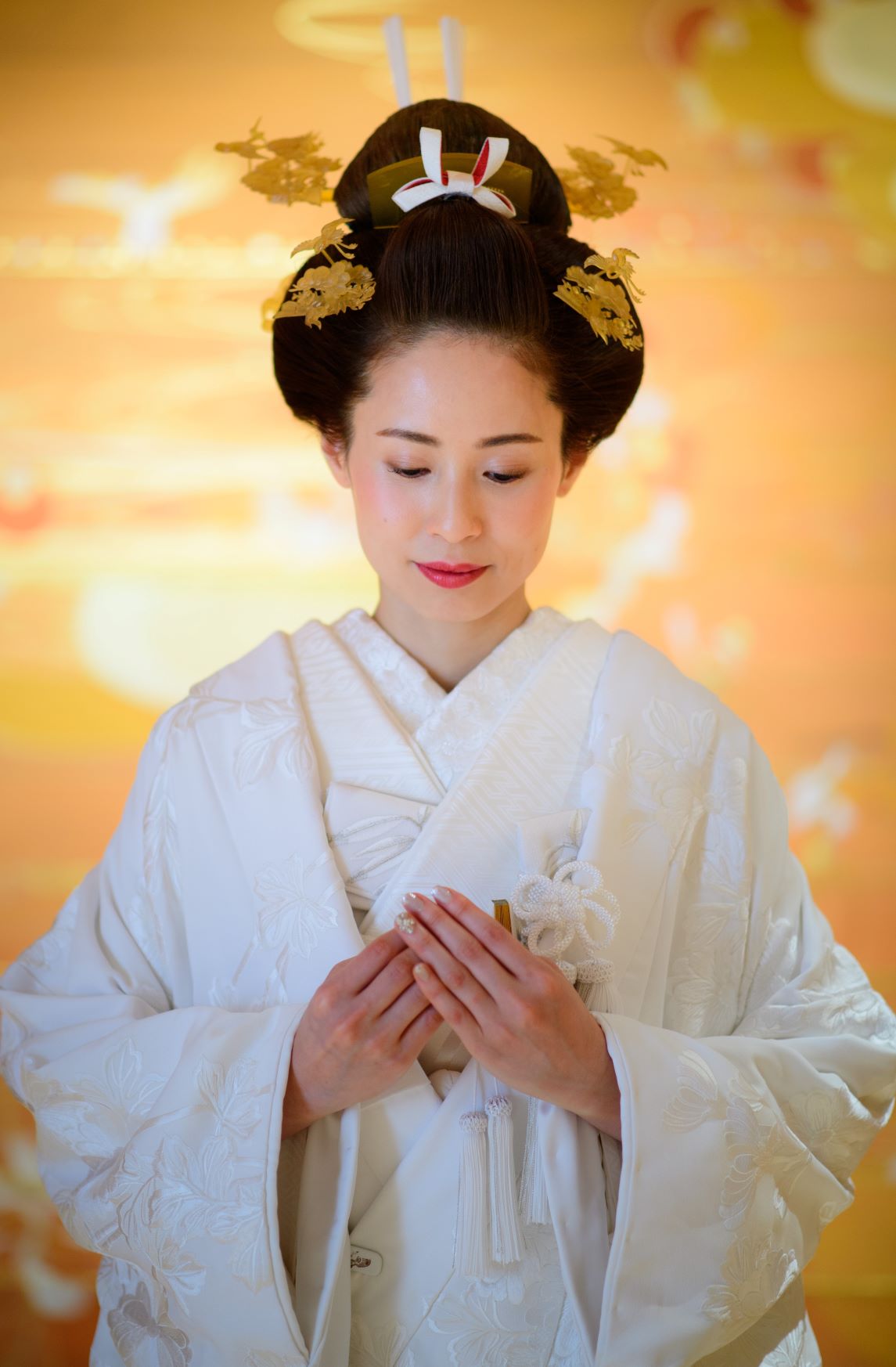 ホテルウェディングでありながらも、本格的な神前式が叶うパレスホテル東京の神殿で、高貴で凛とした印象が魅力的な純白の白無垢をお召しになられたご新婦様