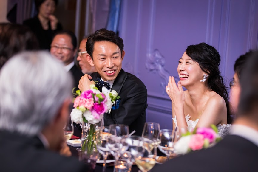 挙式でのノーブルで上品な雰囲気から、大人の余裕さえ感じる遊び心あるスタイリングにがらっと印象を変えました。ジョエルロブション