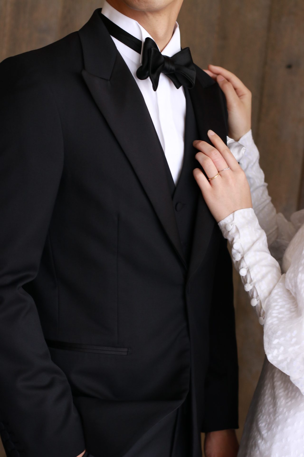 タキシードと小物、身に纏うその全てを着こなしのルールに則り拘ることで、結婚式という特別な一日に相応しい装いに。