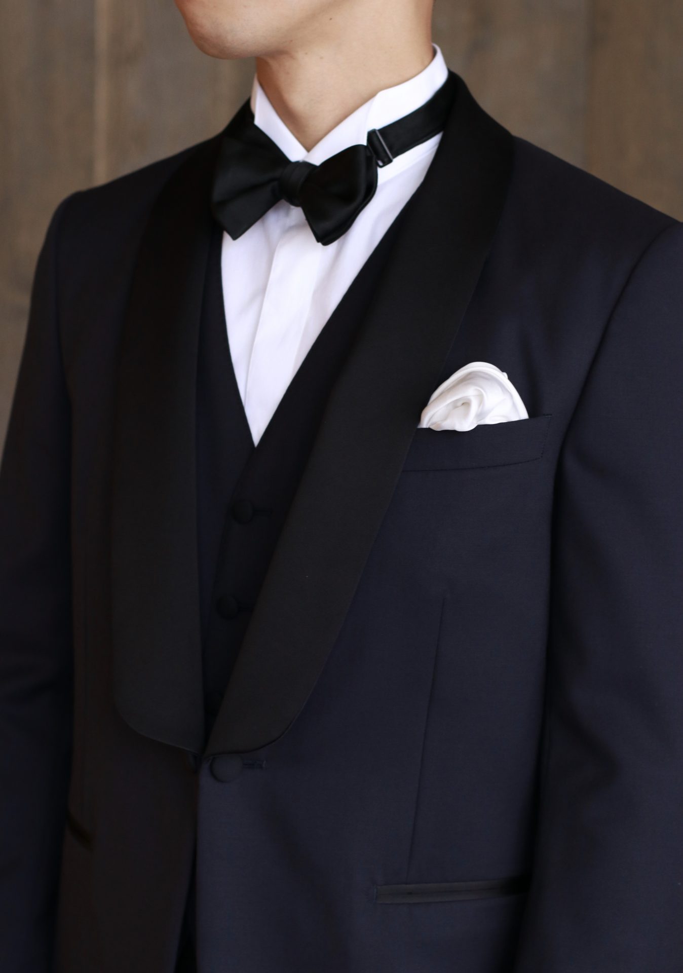 ミッドナイトブルーのタキシードはショールカラーで優しい雰囲気となり、クラシックな結婚式を叶えるに相応しいフォーマルなタキシードです。