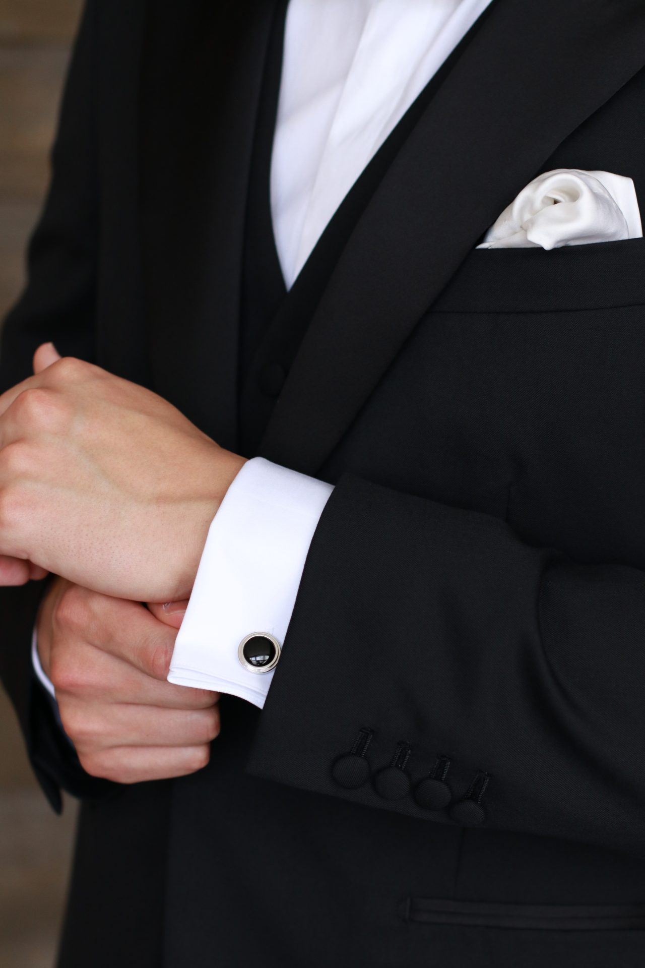 【カフリンクス】男性がタキシードに合わせるアクセサリーといえば、カフリンクス。そもそも、「シャツ=下着」とされており、その下着のボタンを見せない為にカフリンクスを使用します。そのなかでもブラックオニキスのカフリンクスはフォーマルスタイルのタキシードに欠かせないと言われています。袖元から覗く、カフリンクスはご新郎様が身に着ける唯一の装飾品だからこそ拘り抜いた一品をお選びください。