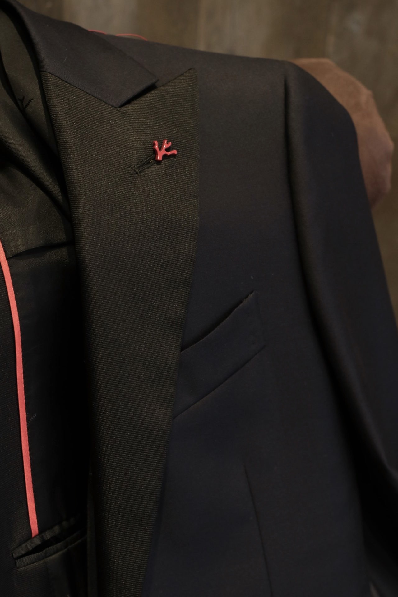 まずジャケットの特徴として挙げられるのが、スーツとは異なる拝絹(はいけん)という襟仕立て。タキシードの襟には正絹という艶やかなサテン生地を使用するため、顔周りをより華やかに魅せます。襟型にはショールカラーとピークドラペルと呼ばれる2種が存在し、ここに格式の違いはなく主に発祥の違いとなります。アメリカ発祥のショールカラーは、襟全体が丸みを帯びたデザインの為、柔らかな雰囲気とラグジュアリーな特別感を演出します。一方イギリス発祥のピークドラペルは、直線的で先鋭な襟元が男性らしい威厳のある雰囲気を醸し出すのです。是非、ご自身のなりたい男性像に合わせた襟型を選んではいかがでしょう。