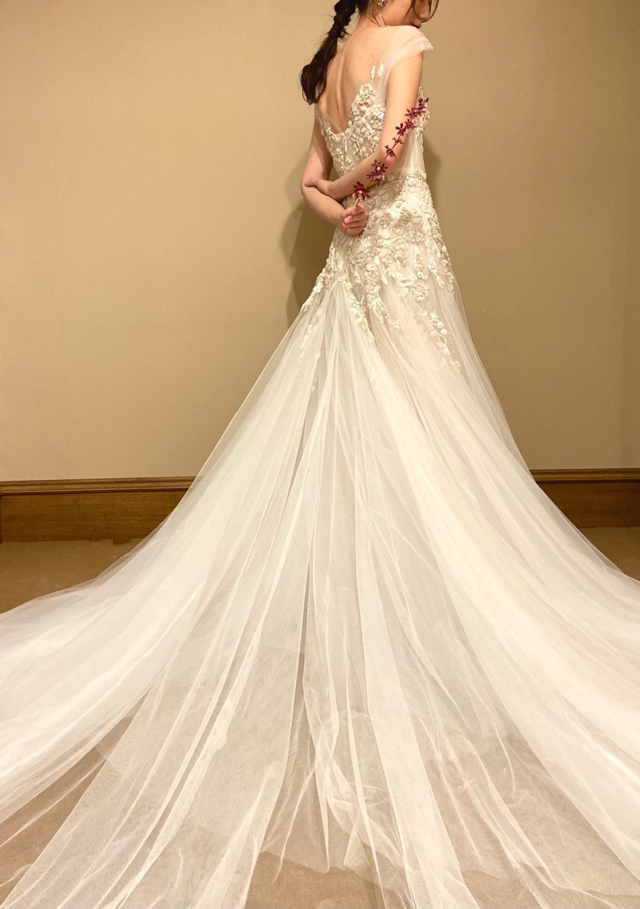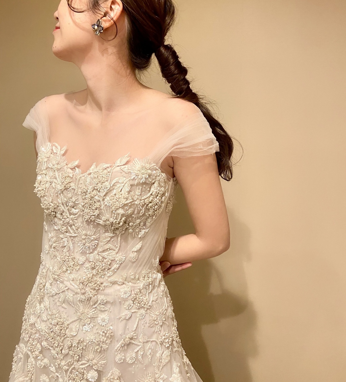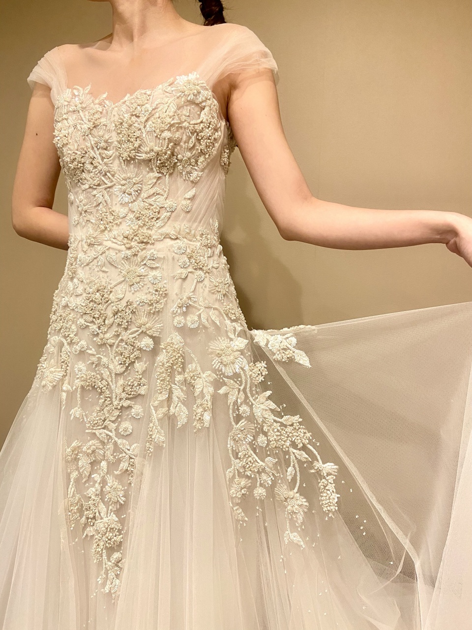 ドレス全体に惜しみなく散りばめられたヴィンテージテイストの刺繍は、まるでアートのように、ただそこに佇むだけで息をのむほどの美しさを放ちます。女性らしいしなやかな曲線を最大限に活かしたドレスは彼女たちだからこそなしえるデザイン。繊細なファブリックの上に一つ一つ丁寧にあしらわれたゴージャスなビーディングは、女性らしい柔らかさと芯の強さを引き出してくれます。MARCHESA(マルケーザ)の世界観を余すことなく詰め込んだドレスを身に纏えば、ご新婦様の真の美しさをより一層際立たせることでしょう。