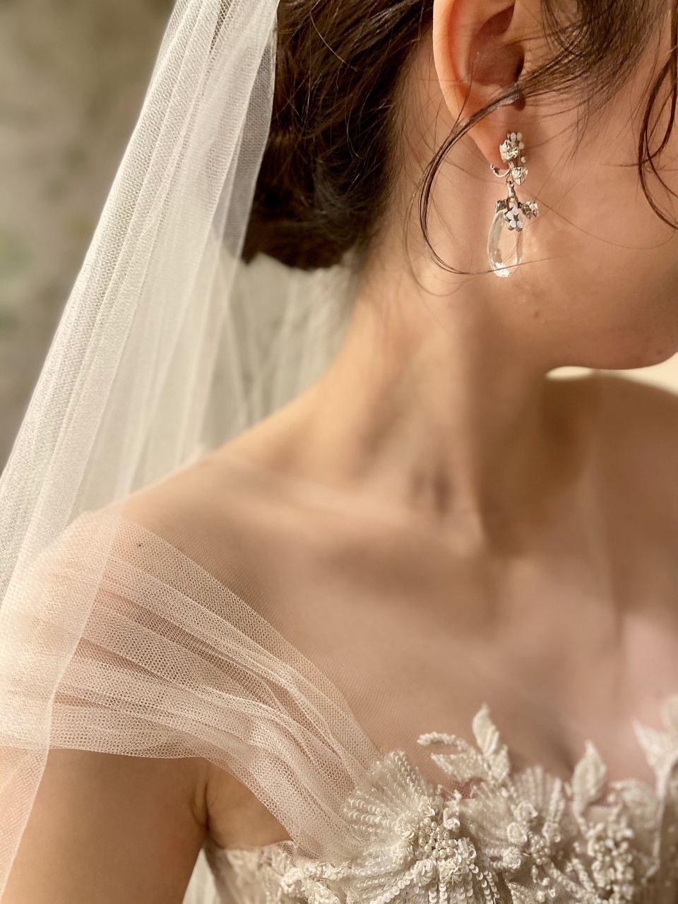 セレモニーでは、ふんわりとゆるやかにまとめたヘアに小ぶりなクリスタルのイヤリング、デコルテにそっとかかるソフトチュールの上から無地のベールをさらりと合わせた透明度の高いピュアなコーディネートを。耳元で戯れるイヤリングがチャペルの柔らかな自然光をたっぷりと浴びたとき、さらに透明感溢れる神秘的なご新婦様像を演出します。笑顔に満ちた表情はゲストの皆様のお気持ちも幸福感でいっぱいにすることでしょう。