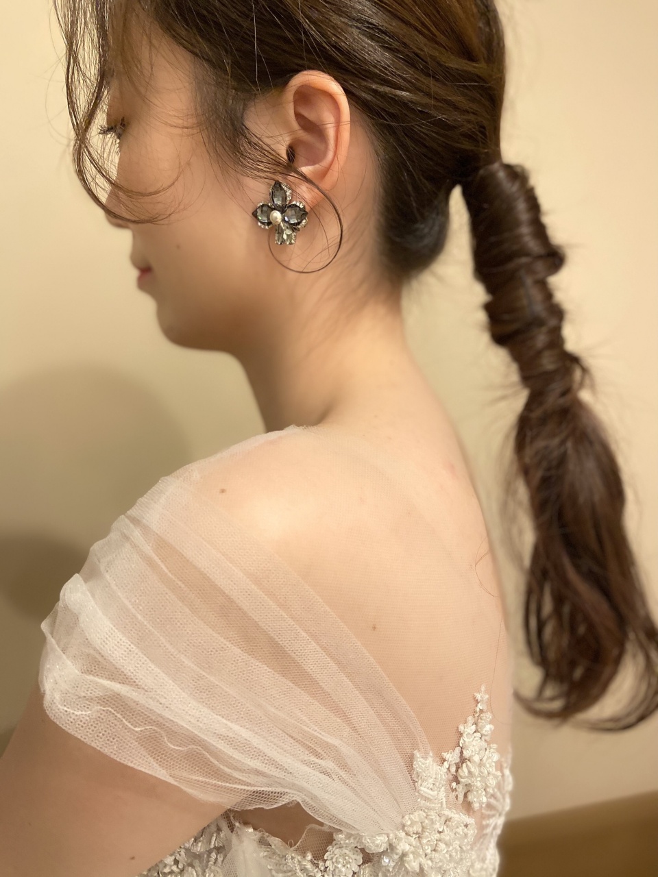 ご披露宴からはタイトに一束にまとめたローポニーにブラックのフラワーモチーフのイヤリングを合わせた女性心をくすぐるスタイリングはいかがでしょうか。前髪やおくれ毛にカールをつけ、ドレスの持つ凛とした印象の中にも愛らしさや遊び心を取り入れて頂くのもおすすめです。ぜひあなただけのコーディネートを。