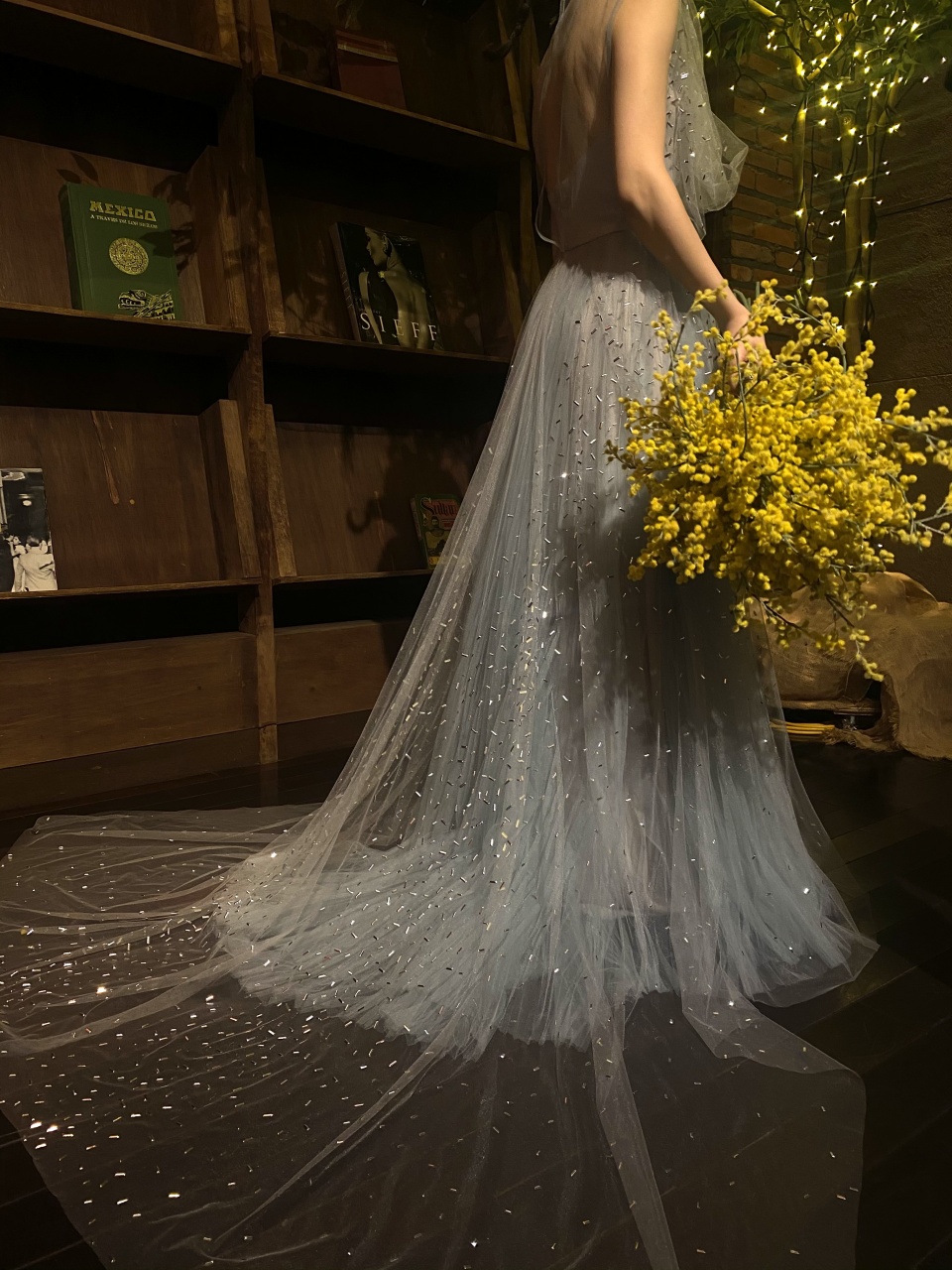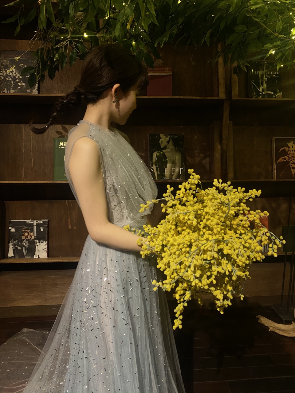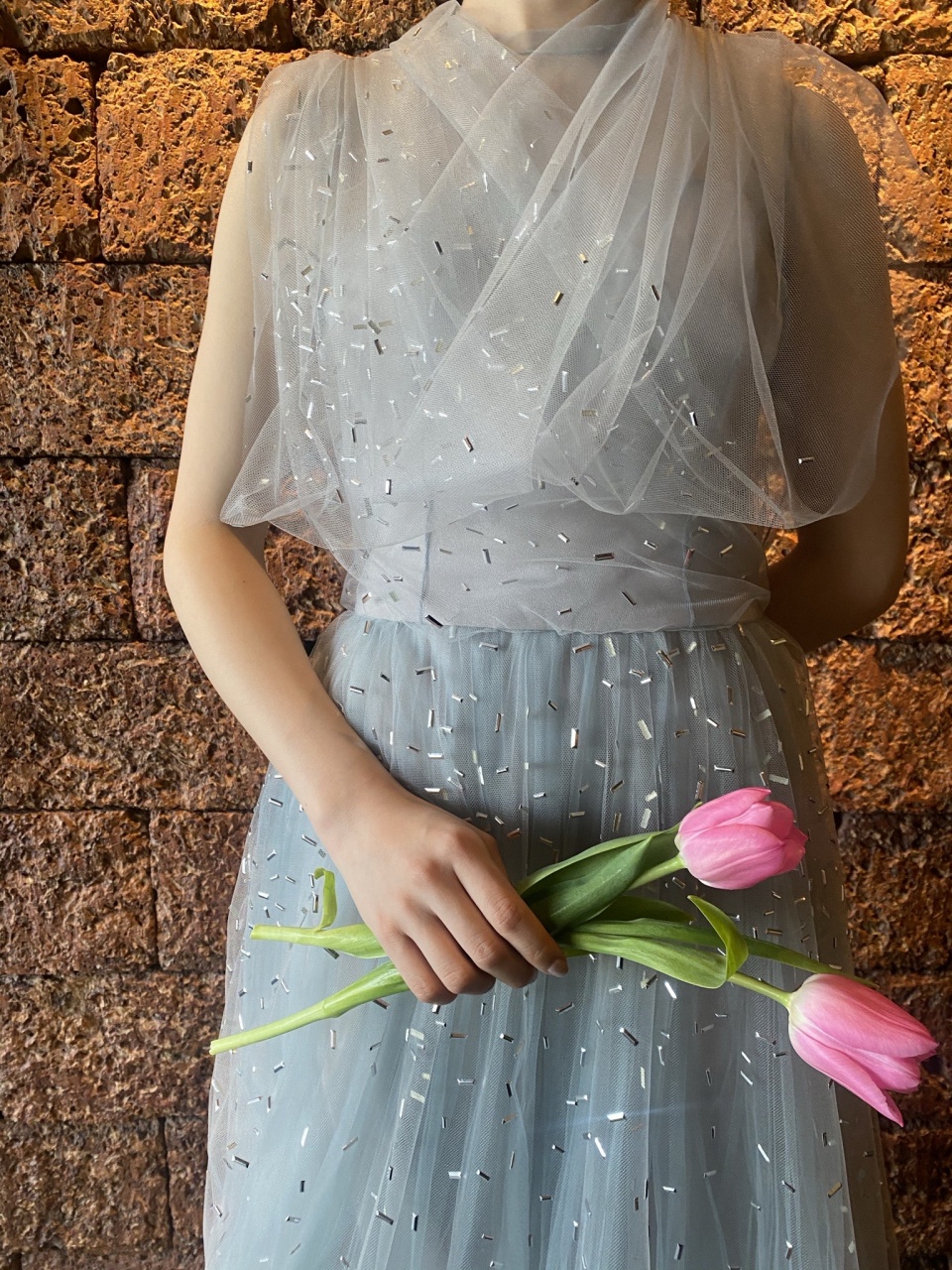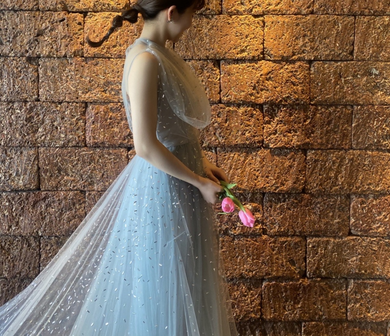 まるで空気を纏ったかのような爽やかさと透明感を感じさせるダスティブルーは、洗練された大人のウェディングパーティーにふさわしい一着です。もとはストンと落ちるスレンダーラインのドレスでしたが、お色直しドレスとしての華やかさをプラスするために、チュールのボリュームをアップ。触れるのもためらうほどの繊細なチュールは花嫁を優しく包み込み、そこに惜しみなく散りばめられた長方形のビーディングが、甘さの中にスパイスを感じさせてくれます。くすんだカラーに、スパンコールやビーズ、刺繍ではない新しいモチーフのシルバーの光がポイントになることでモダンに仕上げつつ、首元から柔らかく重なり合う流れるチュールのデザインで女性らしい印象も兼ね備えた唯一無二のデザイン性は、センスあふれるワンランク上のコーディネートをお楽しみいただけます。