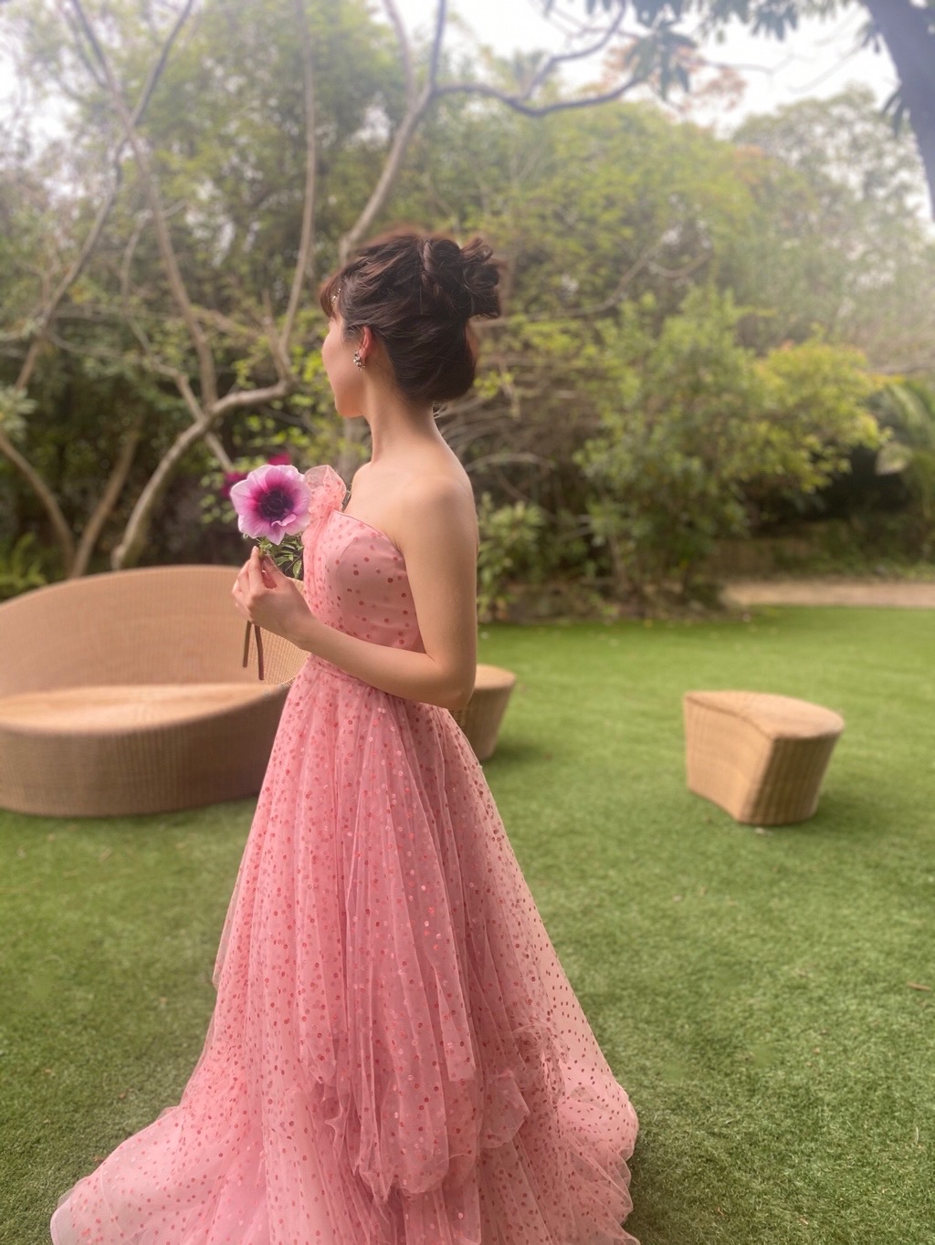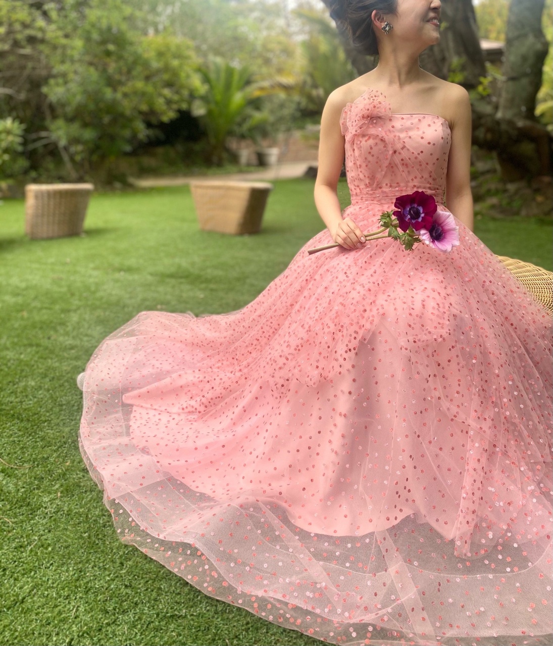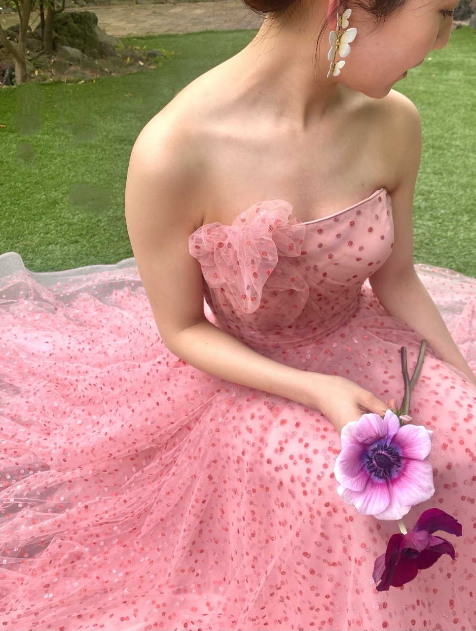 軽やかで今にも踊り出したくなるような程よい丈感のスカートは、カジュアルで自由なパーティーを楽しみたい花嫁にぜひお召しいただきたいおすすめの一着。ガーデンウェディングでお召しいただくと、爽やかな一面に広がるグリーンとドレスの持つ甘く可憐なピンクとのコントラストが、ゲストの皆様の目を引きつけます。穏やかな陽光に包まれて愛にあふれた祝福を受けながら、グリーンの上を自由に舞うその姿は、まさに幼いころに憧れた物語のヒロインのように、お二人、そしてゲストの皆様の心にも印象的に刻まれるでしょう。