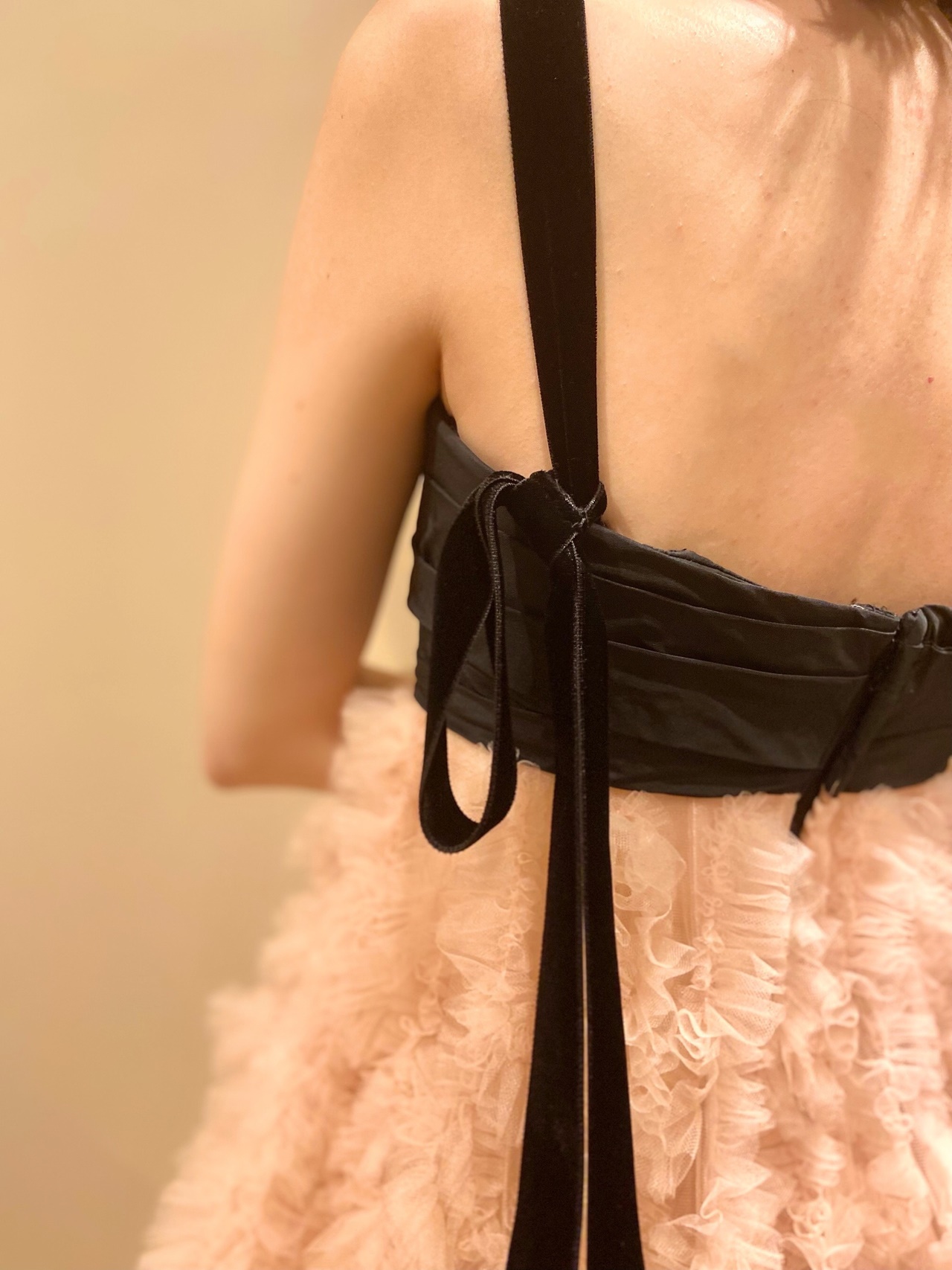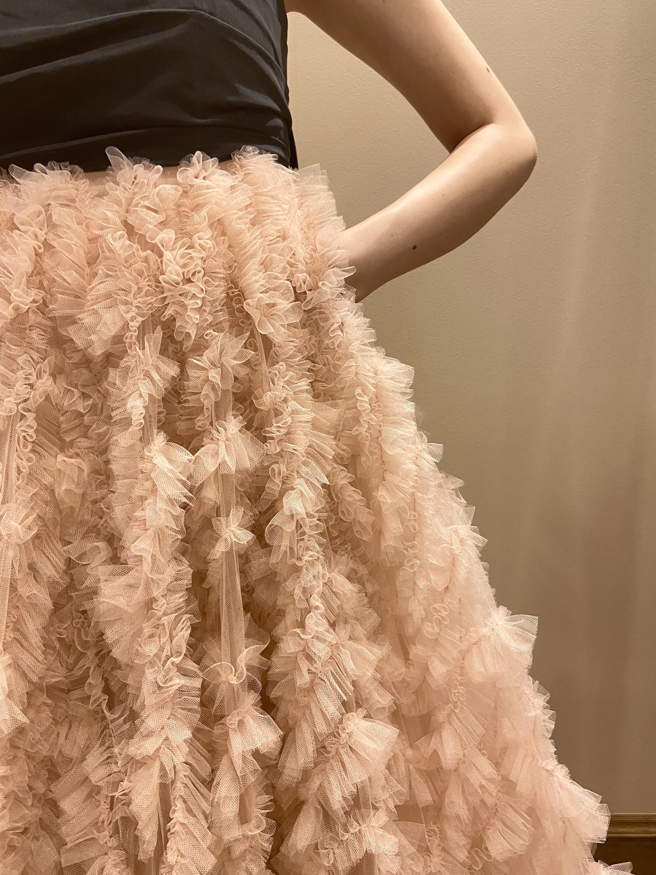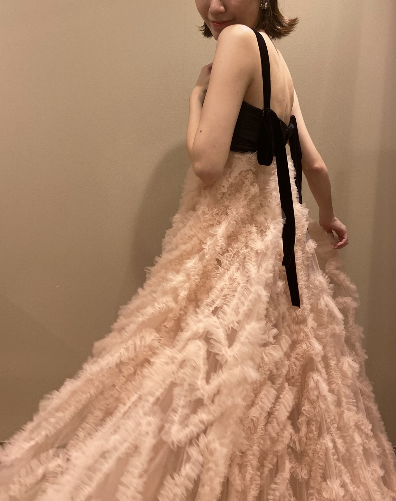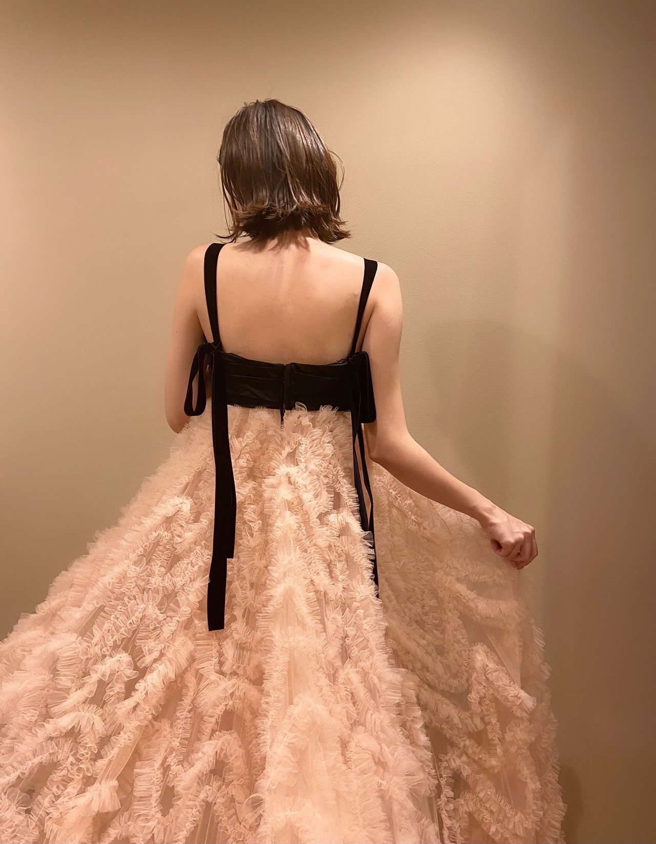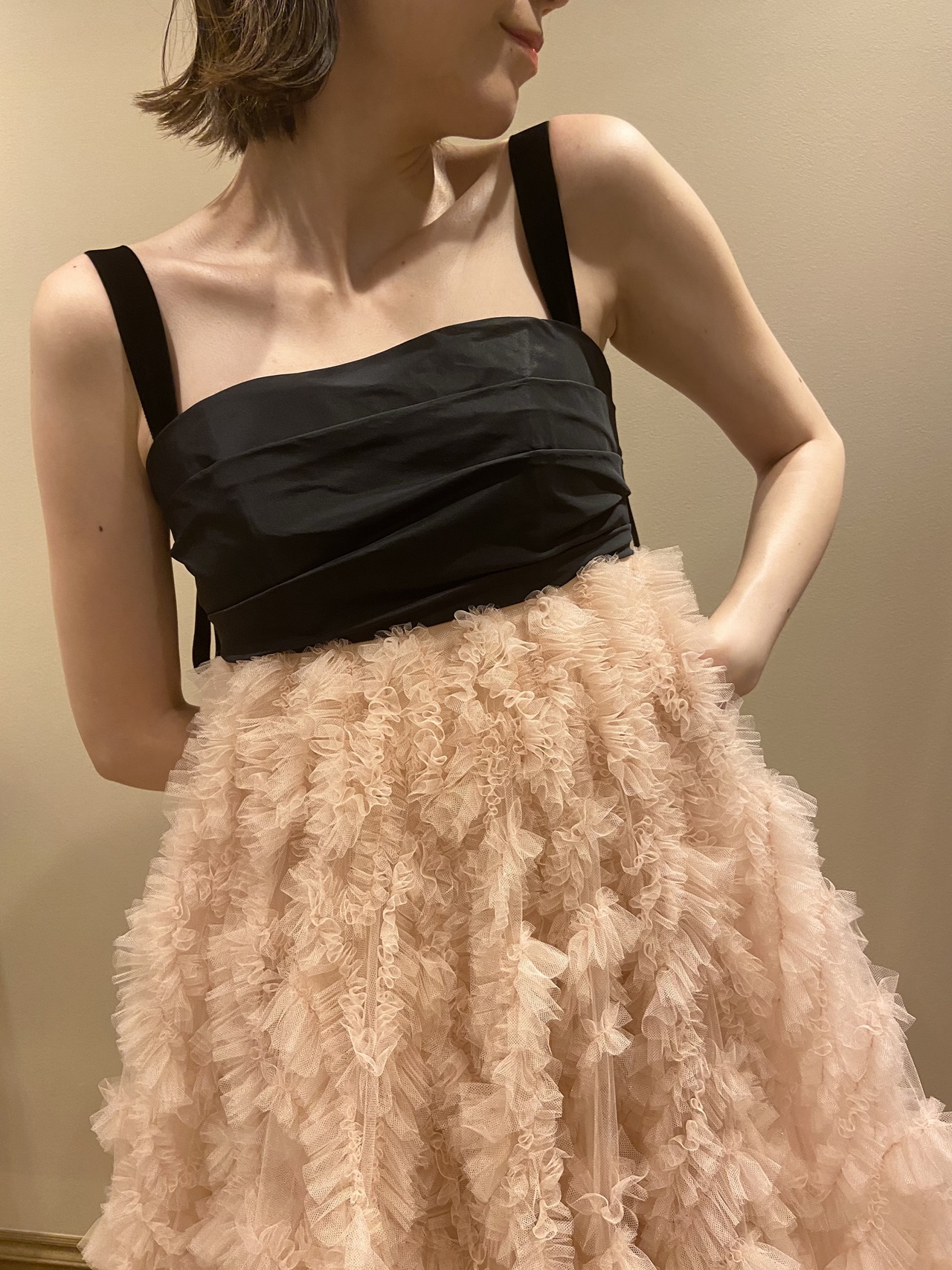 キャッチーで愛らしいスカートを彩るニュアンスカラーのピンクベージュは柔らかく上品な雰囲気を、対照的に上半身のブラックは、スタイルを引き締めクールでありながら優雅な魅力を感じさせます。福岡店の提携式場であるウィズザスタイル フクオカの温かみのあるブラウンベースのパーティー会場でお召しいただくと、そのコントラストは何ともロマンティックな印象とともに、身に纏うご新婦様の柔らかな女性らしさを引き立てることでしょう。たとえば温もりある穏やかな日差しが降りそそぐ秋の昼下がりのパーティーでお召しいただくと、吹き抜けの中庭からテラス越しに差し込む自然光が繊細なチュールスカートの透明感やエアリー感をより一層高めてくれます。頬を赤らめたようなロマンティックなブラッシュピンクのカラーはうっとりするような愛らしさを演出し、ご新婦様の仕草までをも可憐に演出してくれることでしょう。