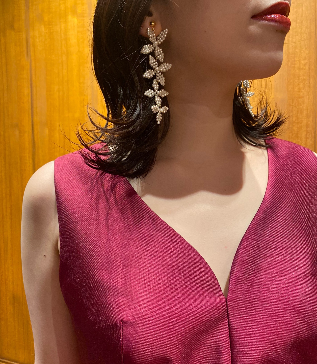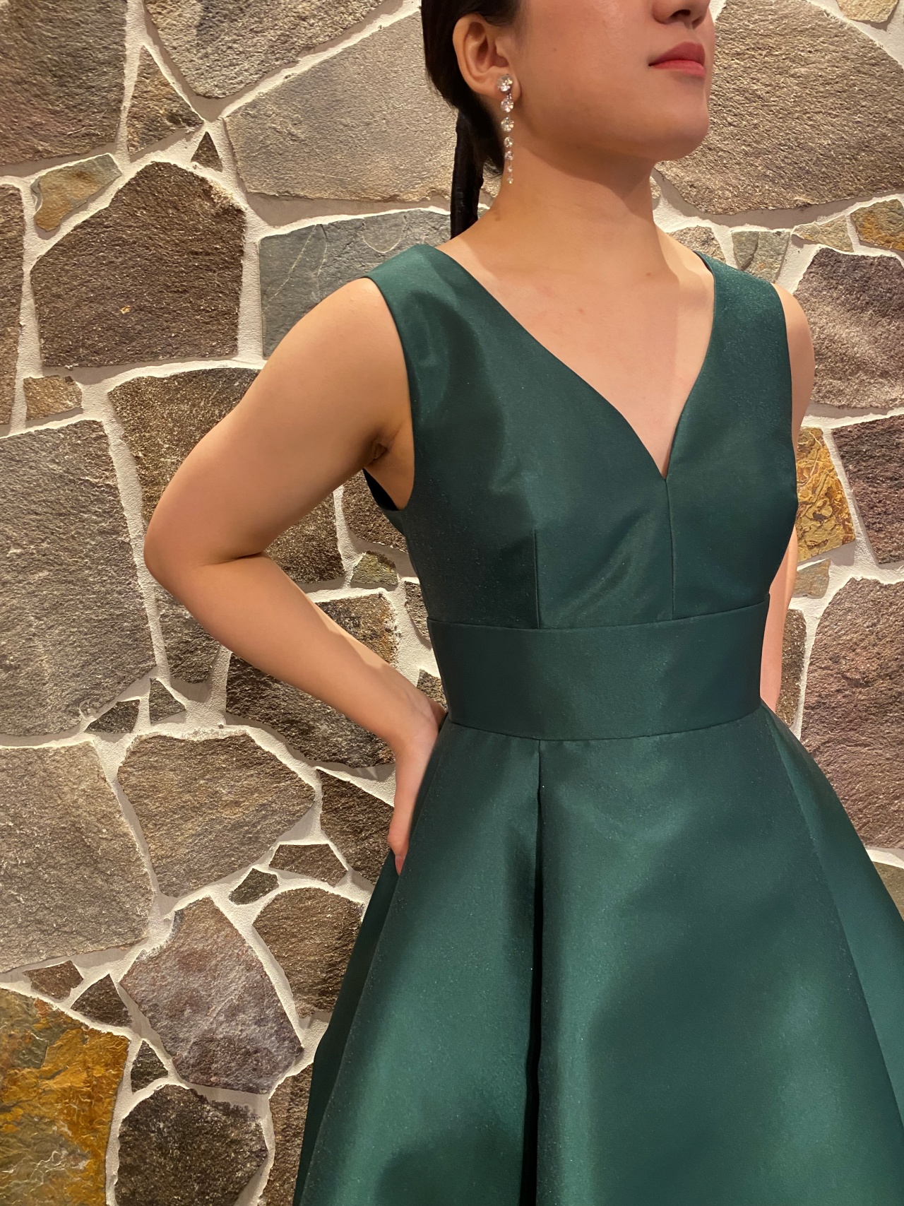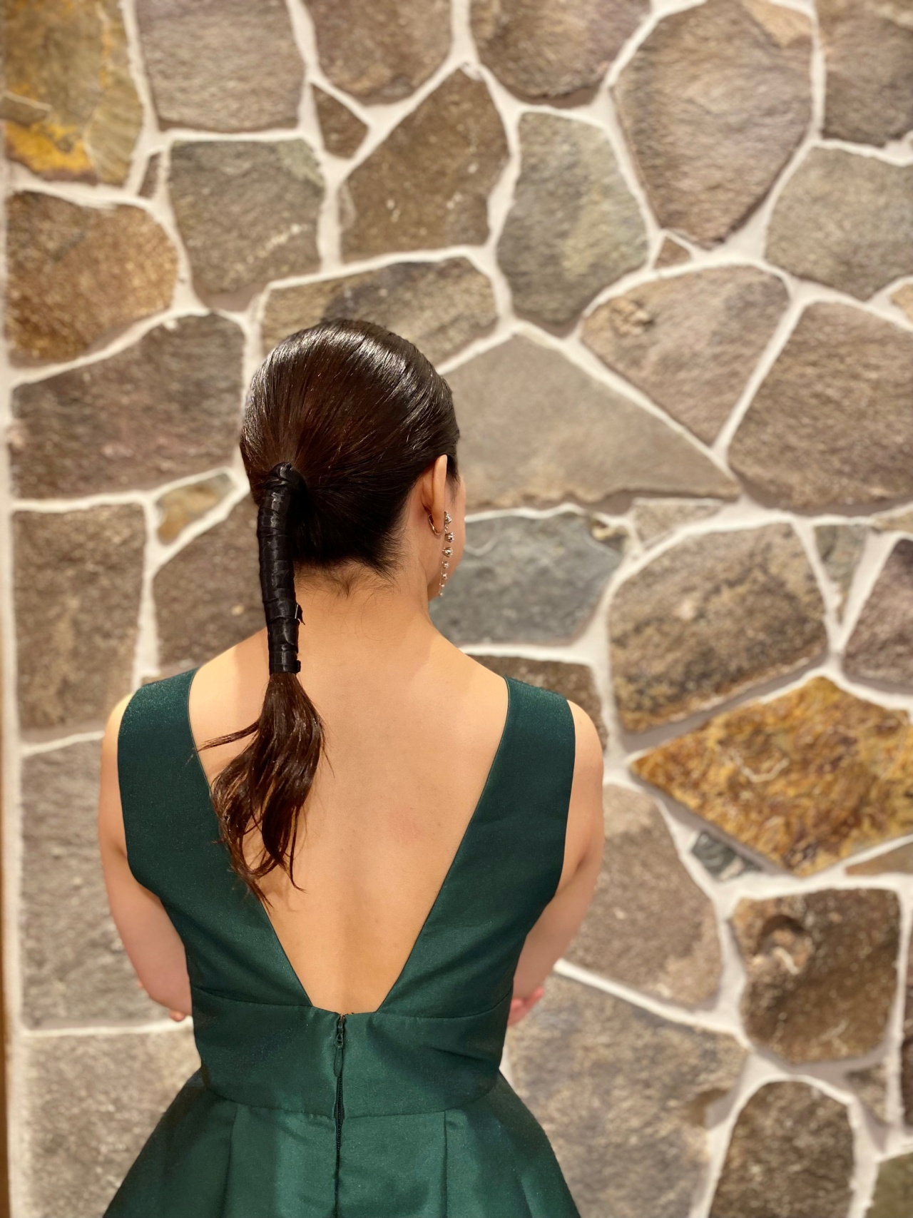 ダークグリーンのカラードレスには大ぶりなシルバーのイヤリングを合わせスタイリッシュに着こなしていただくのはいかがでしょうか。世界のアクセサリーシーンをリードするJENNIFER BEHR(ジェニファー ベア)は、ひとつひとつ手作業で丁寧に作られる、繊細さを極めたラグジュアリー感が魅力のアクセサリーブランドです。7粒のクリスタルが連なり繊細でありながらも存在感を放つシャープなイヤリングは、歩むたびに上品に揺れ、光を浴びることで輝きと煌めきを放ちます。ヘアスタイルは凛としたスタイリッシュさを高めるようなタイトなローポニーを合わせ、黒のリボンでミニマムにまとめることで洗練された印象に。