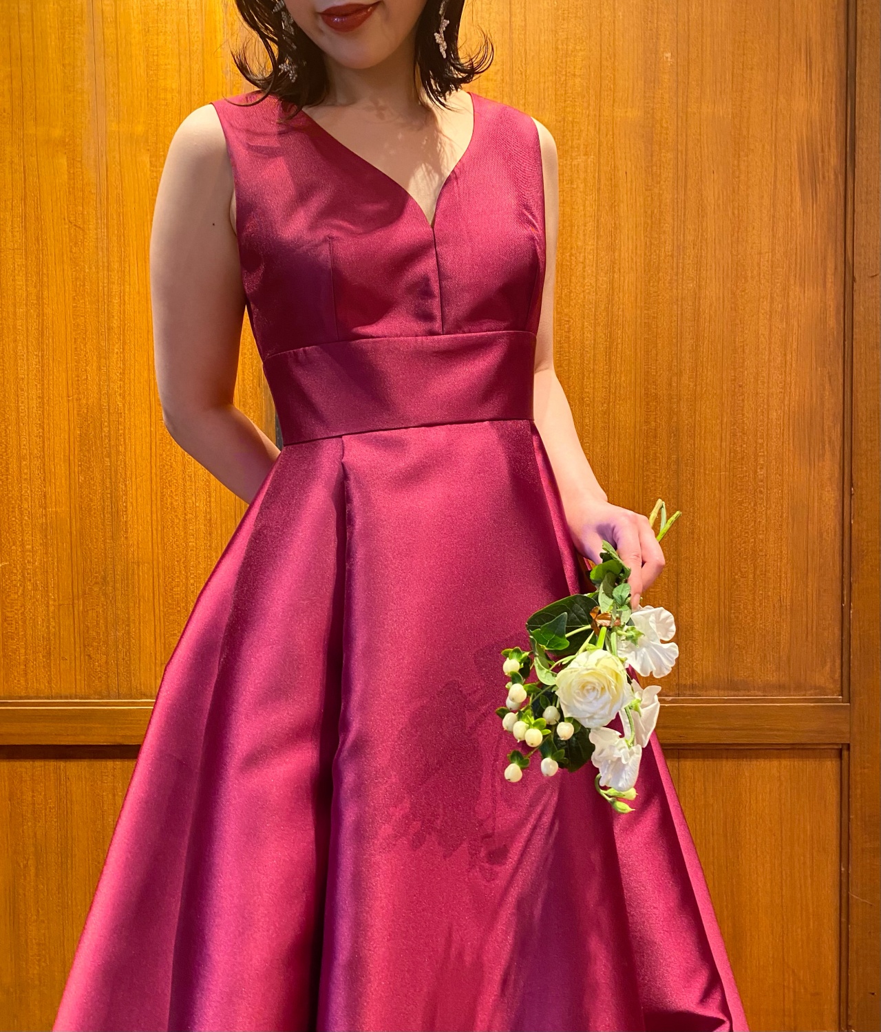 ボルドーは女性らしいエレガントさを出したい方におすすめ。ベビーパールをふんだんに使用したフラワーモチーフのイヤリングは、センスフルなデザインが魅力のA.B.ELLIEで(エイビーエリー)から新たに入荷した一点です。世界中の花嫁に愛されるエイビー エリーはトレンド感の中にイノセントな世界観がつまっており、一つ一つハンドメイドで作り上げられるアクセサリーは、耳元を優しく華やかに演出してくれます。ハンドメイドならではの繊細であたたかみを感じるイヤリング、ゆるやかで作りこみすぎないダウンスタイルで、リラクシーで優しげな存在感を放つコーディネートは、ウィズ ザ スタイル フクオカのシックで落ち着きを感じるバンケットにもぴったりです。特別な日だからこそ、飾りすぎないエフォートレスなコーディネートを纏い、エレガントなオーラを放って。