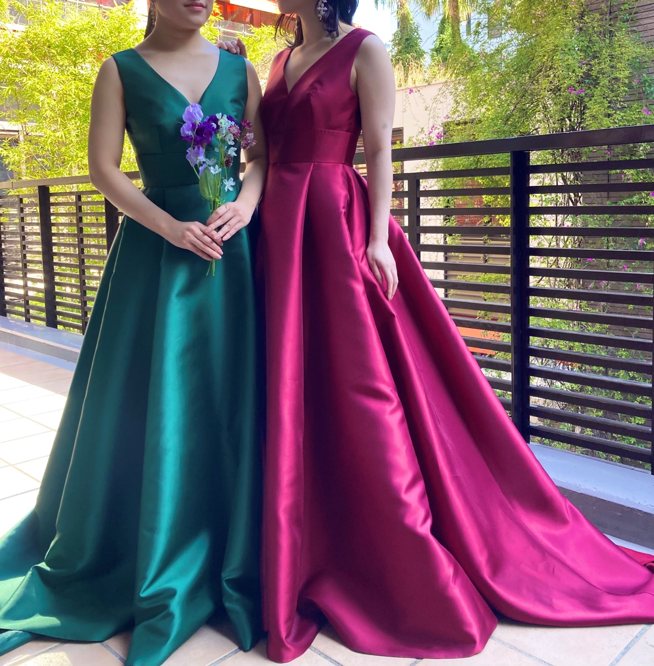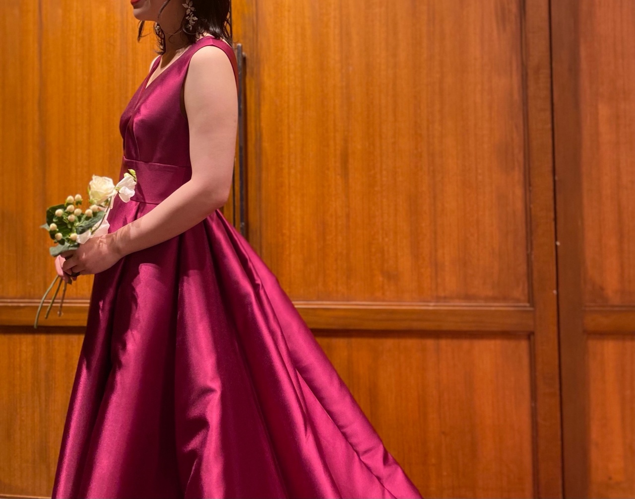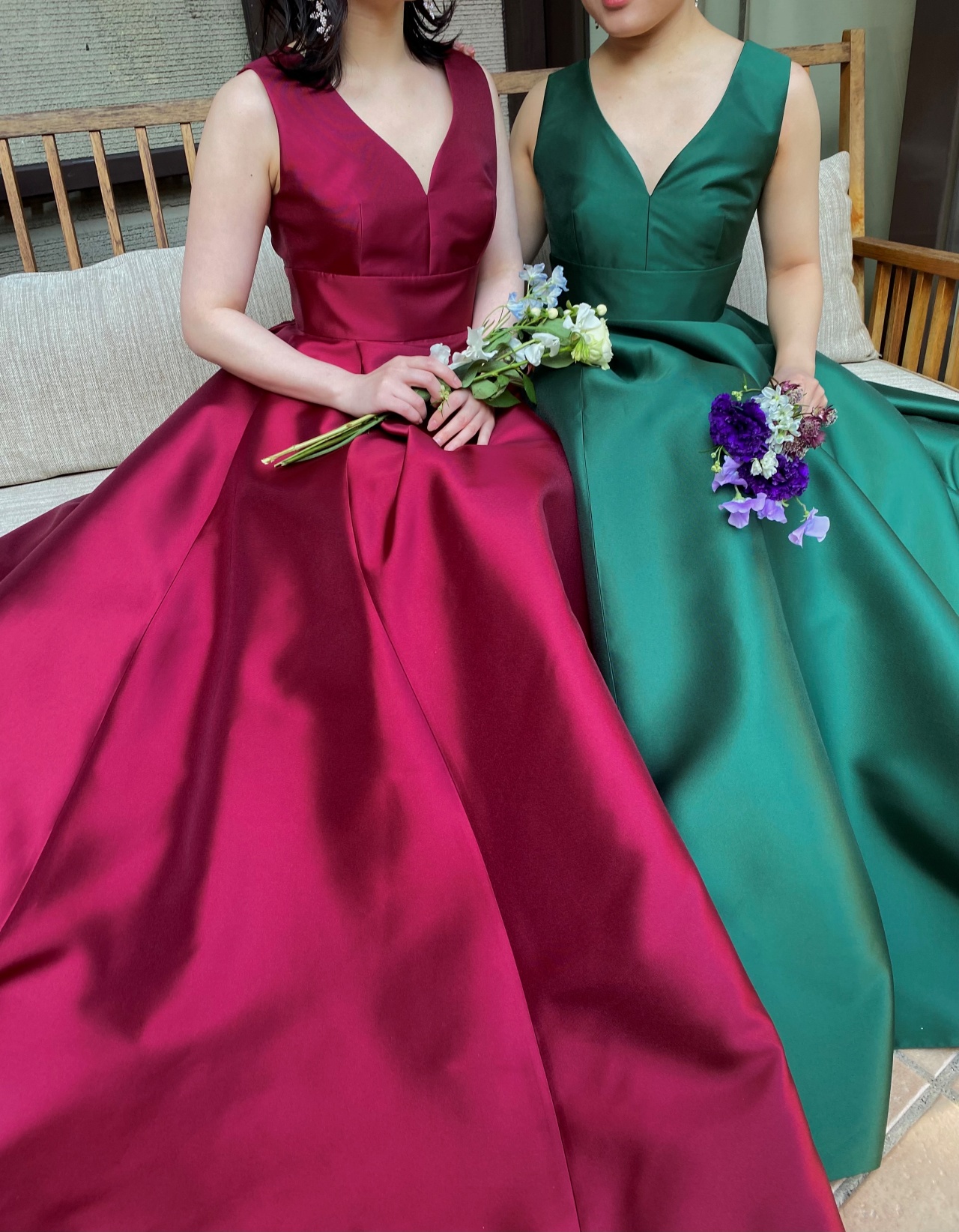 トリートメゾンの2021Pre Collection より届いた深みのあるトーンが目を惹くAラインのサテンのカラードレスは、ダークグリーンとボルドーの2色展開。緩やかな曲線を描き胸元に沿うように計算された深みのある胸元のカッティングは、決して大胆な印象ではなく、女性らしい上品なデコルテを演出します。ウエストラインを高く設計することで日本人女性の体形に美しくフィット。深くたっぷりと取ったタックは腰元をすっきりと見せ、裾元に向かって贅沢に広がるAラインはドレスらしいシルエットを叶えながらも甘すぎないスタイリッシュさを感じさせてくれます。まさにこれまでの歴史の中で日本の花嫁のスタイルを知り尽くしたトリート メゾンだからこそ体現できる、絶妙なバランス、シルエット、細部にまでこだわって完成した一着です。福岡店の提携式場であるウィズ ザ スタイル フクオカのTHE WEST GALLERY(ザ ウエストギャラリー)は、都心にありながらも、ゲストを邸宅に招いたようなプライベート空間を叶えることのできるバンケットルームです。テラスから差し込むあたたかな自然光は、光沢のあるサテン素材のカラードレスをより上品な印象に引き立たせてくれます。屋内でお召しいただくとシックな印象を感じさせ、併設のテラスにて澄んだ空気とグリーンに包まれると、ドレスの艶やかな光沢感がフレッシュな印象さえも感じさせてくれます。爽やかな風に吹かれながら、ゲストの皆様と思い出話に花を咲かせ、自由な時間ををゆったりと楽しんでいただくのはいかがでしょう。