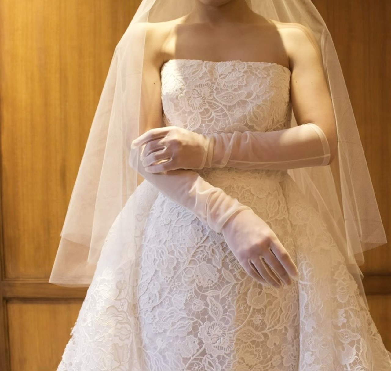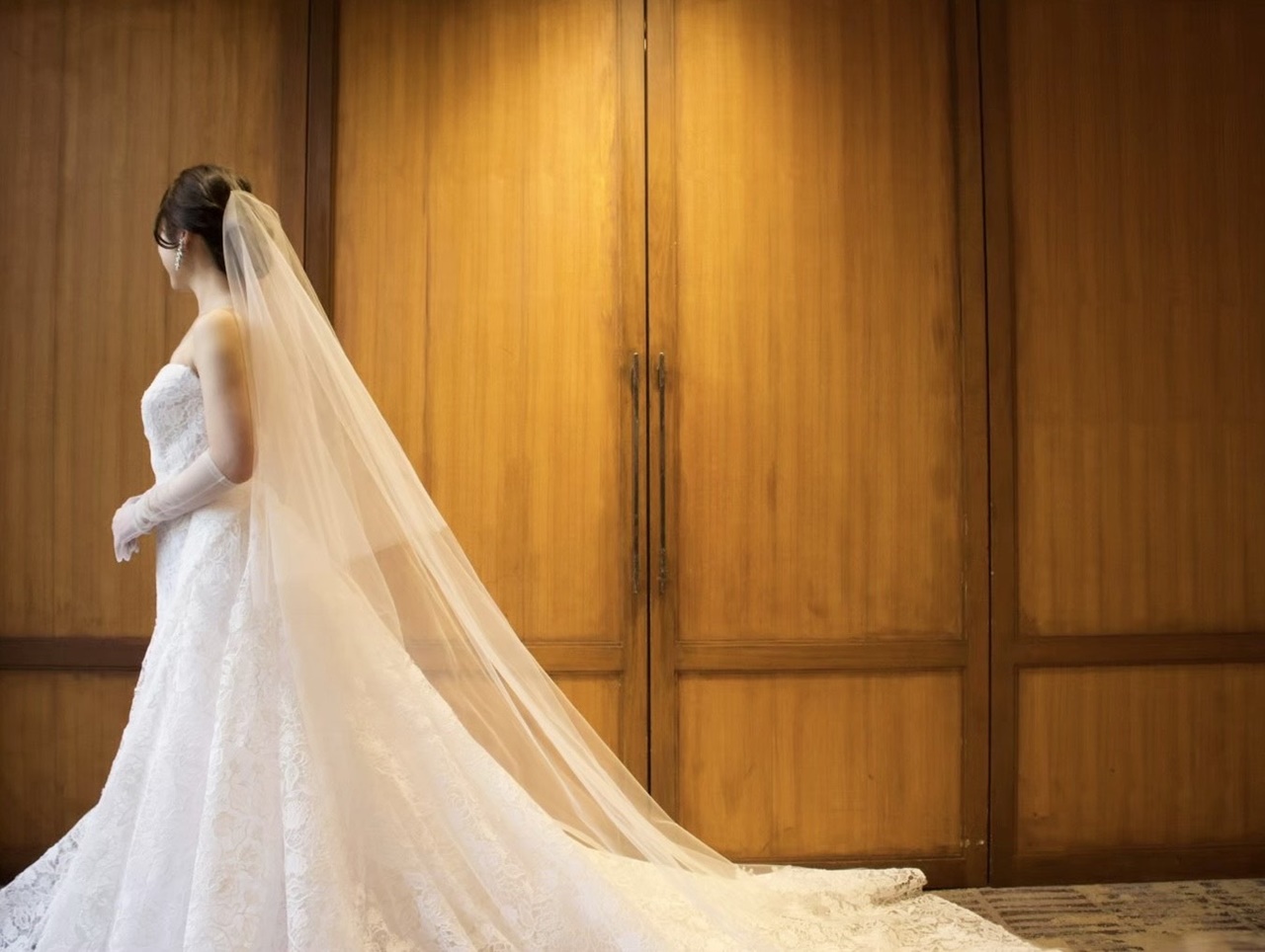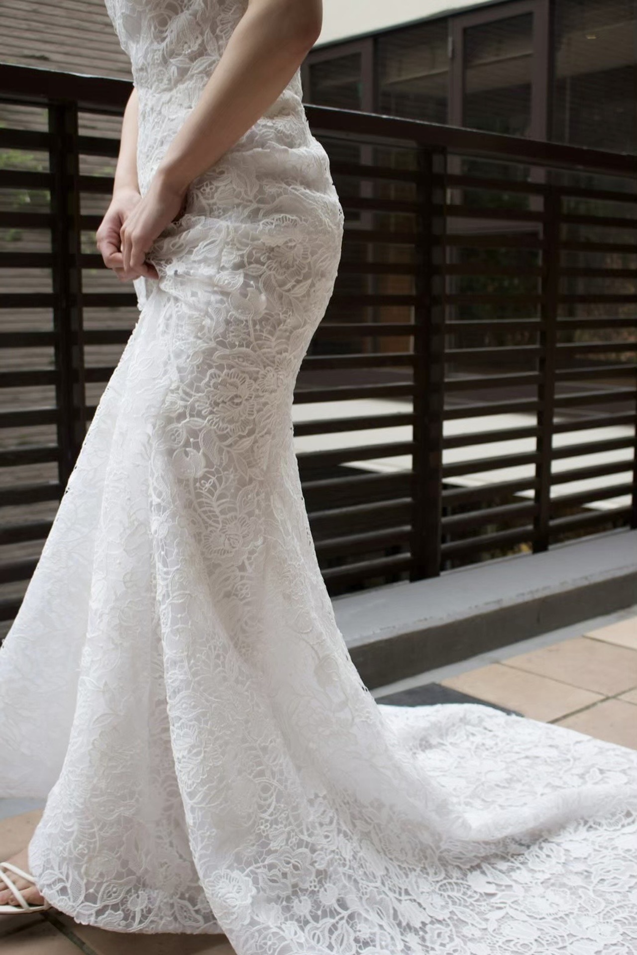 ひとつひとつ丁寧に紡がれ、リーム アクラの繊細なファブリックを隅々まで惜しみなく贅沢にあしらったウェディングドレス。2wayでお楽しみいただけるこちらのドレスは、挙式ではオーバースカートを合わせたスタイルで。ウエストから流れるように綺麗に広がるスカートは、身に纏えば思わず見惚れてしまうほどの華やかで気品漂うオーラを放ちます。目を惹かれるほどの圧巻のレースが圧倒的な存在感を醸し出し、チャペルから差し込む光に包まれた姿は、きっとゲストの記憶に残ること、間違いありません。ボタニカル調の様々なフラワーモチーフやリーフモチーフからなる贅沢で優雅なシルエットは、新婦様の歩みをより一層華やかに演出してくれることでしょう。シルバーとパールが優しく輝くイヤリングと、空気を纏ったかのような透明感あるロングベールとオーガンジーのグローブが、ゴージャスなシルエットのドレスをどこか優しく柔らかな印象へと導いてくれます。ウィズ ザ スタイルで叶うウェディングは、上質でリッチな空間の中、温かく、リラックスしたムードを楽しめる、ゲストの皆様にとっても穏やかなくつろぎの時間。だからこそ上質なドレスがマッチするし、ウィズ ザ スタイルだからこそ、その上質でゴージャスなドレスが決して重厚すぎる印象ではなく、他では見たことのない圧倒的でありながら柔らかい華やかさを放つのです。