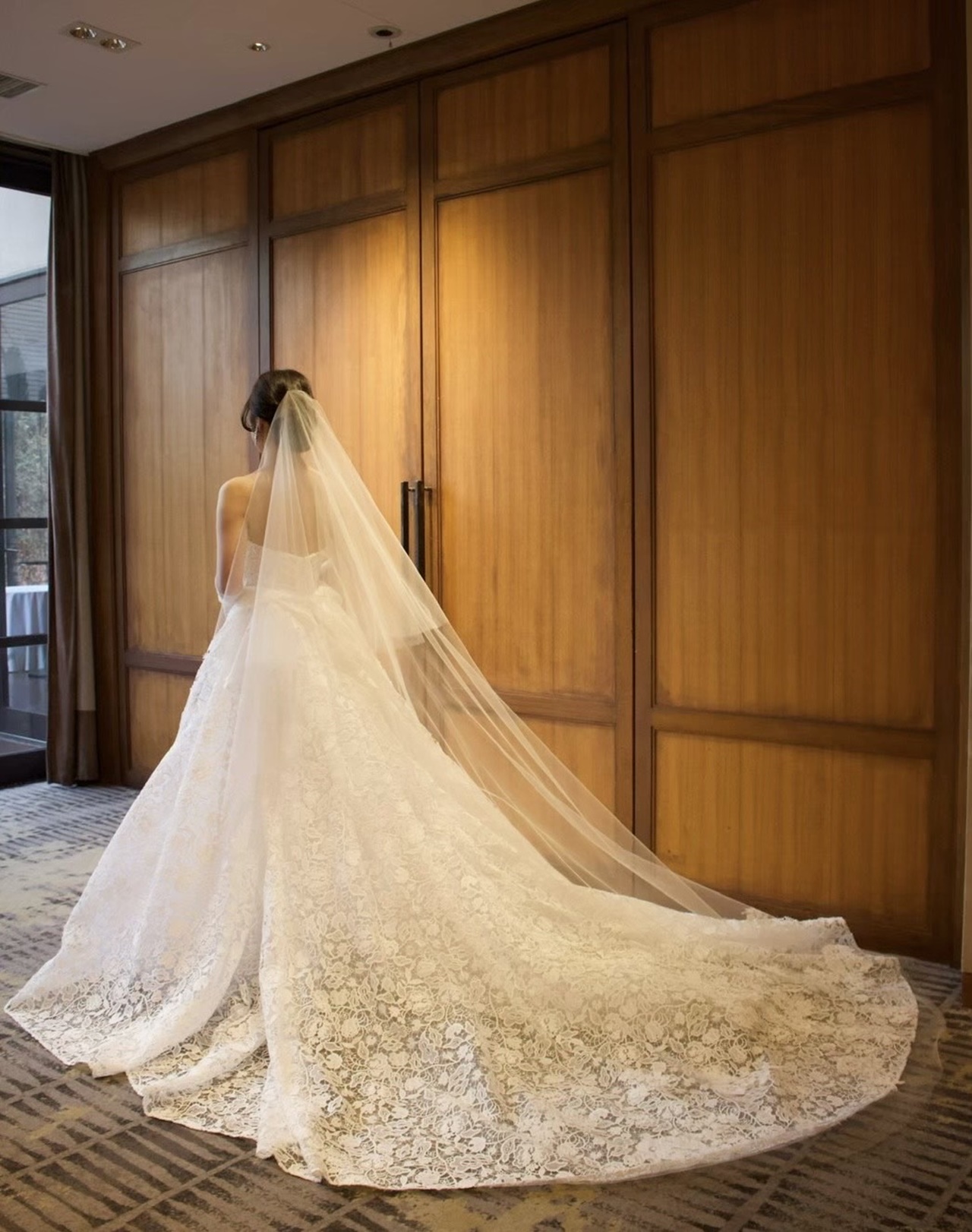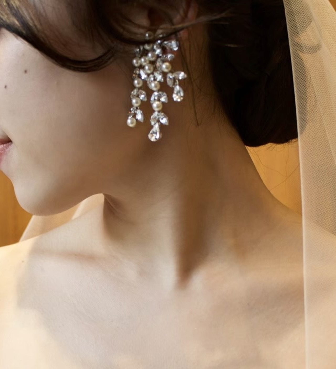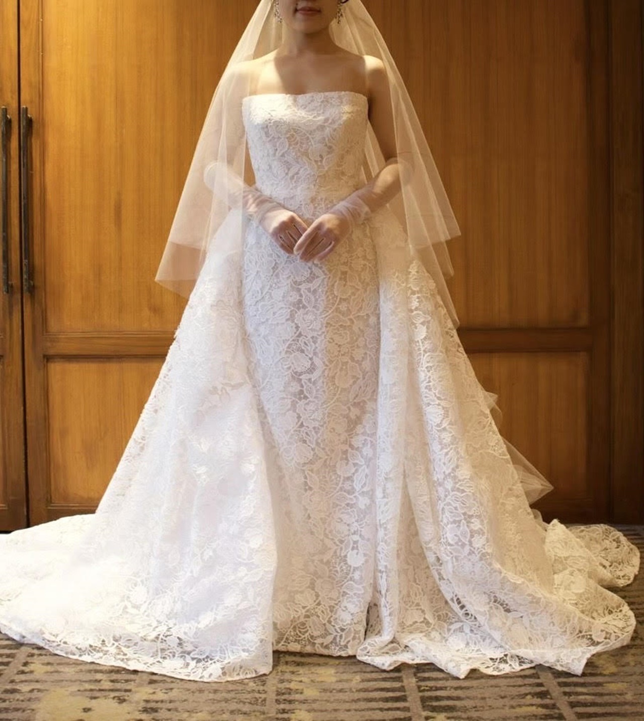 ひとつひとつ丁寧に紡がれ、リーム アクラの繊細なファブリックを隅々まで惜しみなく贅沢にあしらったウェディングドレス。2wayでお楽しみいただけるこちらのドレスは、挙式ではオーバースカートを合わせたスタイルで。ウエストから流れるように綺麗に広がるスカートは、身に纏えば思わず見惚れてしまうほどの華やかで気品漂うオーラを放ちます。目を惹かれるほどの圧巻のレースが圧倒的な存在感を醸し出し、チャペルから差し込む光に包まれた姿は、きっとゲストの記憶に残ること、間違いありません。ボタニカル調の様々なフラワーモチーフやリーフモチーフからなる贅沢で優雅なシルエットは、新婦様の歩みをより一層華やかに演出してくれることでしょう。シルバーとパールが優しく輝くイヤリングと、空気を纏ったかのような透明感あるロングベールとオーガンジーのグローブが、ゴージャスなシルエットのドレスをどこか優しく柔らかな印象へと導いてくれます。ウィズ ザ スタイルで叶うウェディングは、上質でリッチな空間の中、温かく、リラックスしたムードを楽しめる、ゲストの皆様にとっても穏やかなくつろぎの時間。だからこそ上質なドレスがマッチするし、ウィズ ザ スタイルだからこそ、その上質でゴージャスなドレスが決して重厚すぎる印象ではなく、他では見たことのない圧倒的でありながら柔らかい華やかさを放つのです。