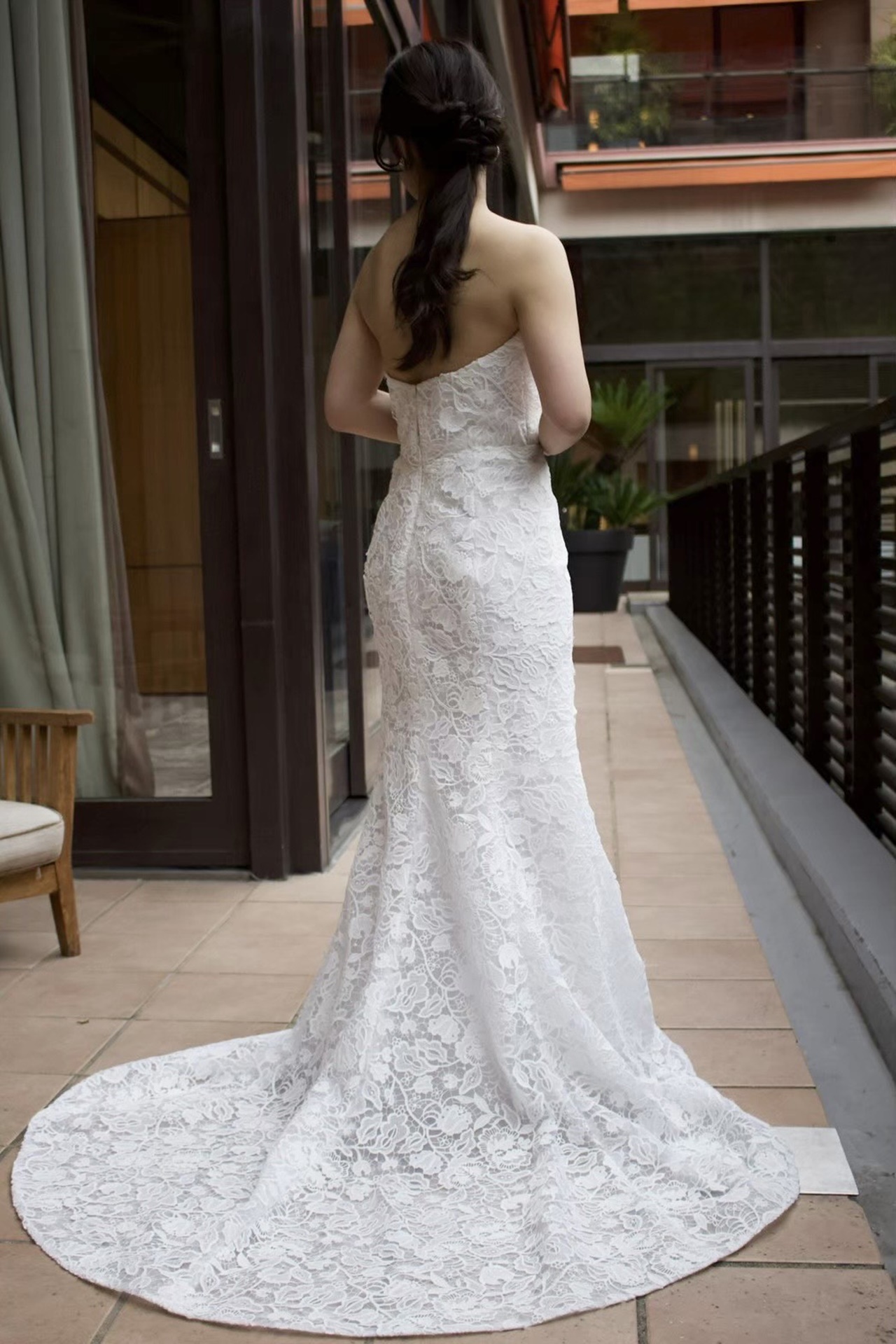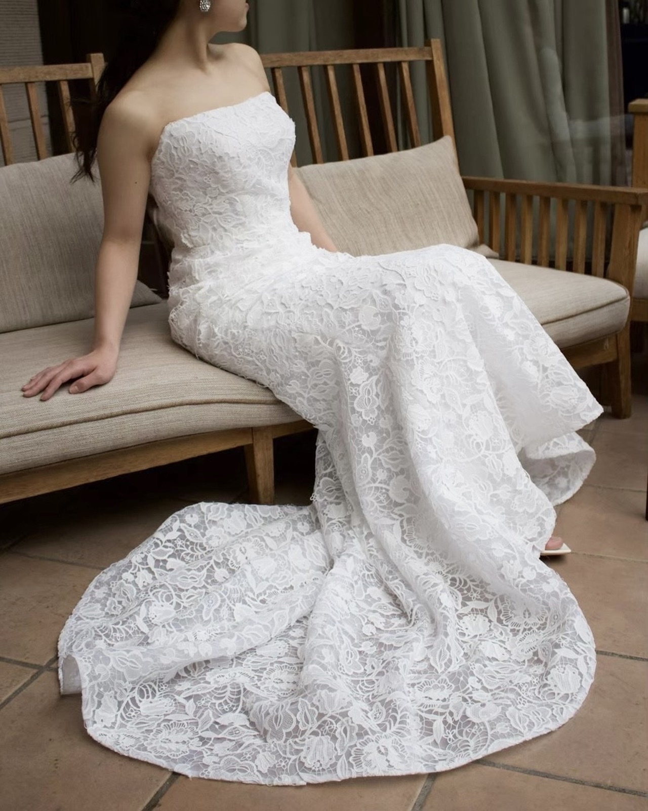 ゲストとの距離もぐっと近く、楽しいひとときをお過ごしいただける披露宴からはオーバースカートを外してシルエットチェンジをしてみてはいかがでしょうか。テラスで自由な時間を楽しめるウィズ ザ スタイルだからこそ、自然体でリラックスしてお過ごしただくことのできるスレンダーラインはぴったりです。すっきりとしたシルエットの中にも、立体的で優美な後ろ姿を完成させてくれます。挙式でのドレスらしさを存分に味わえる圧倒的に華やかなプリンセスラインのシルエット、披露宴からのリラックス感のあるスレンダーラインにチェンジされた姿に、ゲストも魅了されることでしょう。披露宴でのコーディネートは、よりリラックスムードを演出できる緩めのダウンヘア。丸いモチーフのキャッチーなイヤリングは、ファッショナブルでありながら、女性らしい品を放ちます。リラックスしながらも決してカジュアルすぎることはない、エレガントさ際立つ姿を楽しんでいただけるのも、リーム アクラのドレスだからこそ。