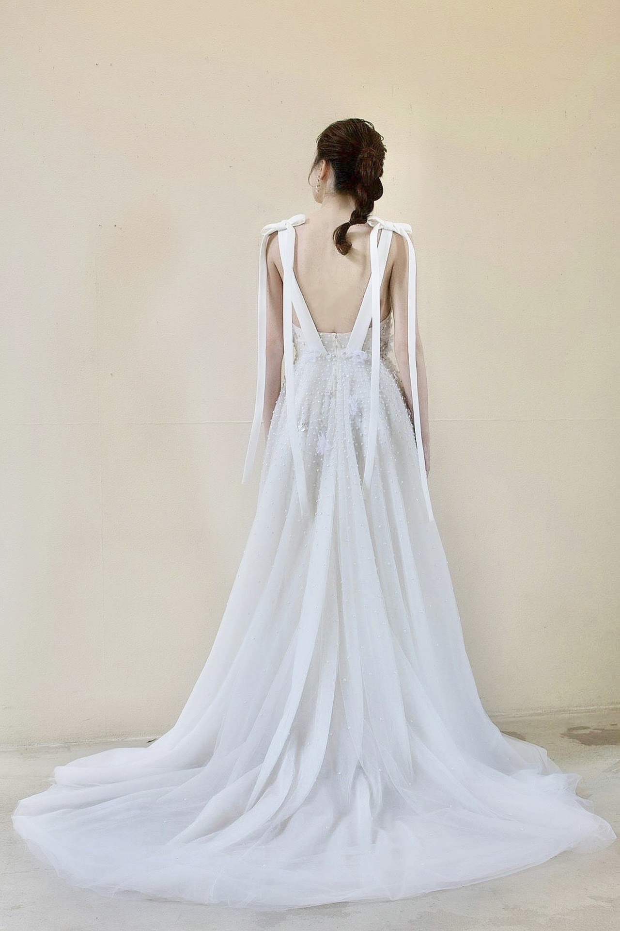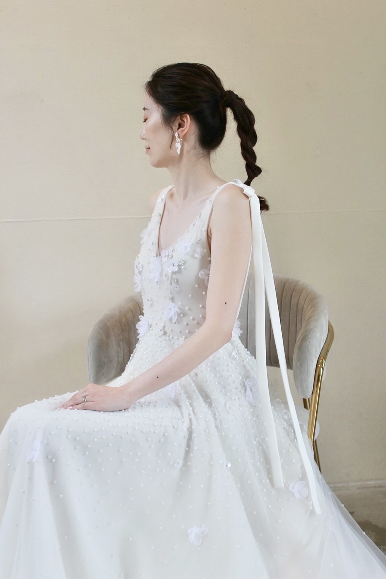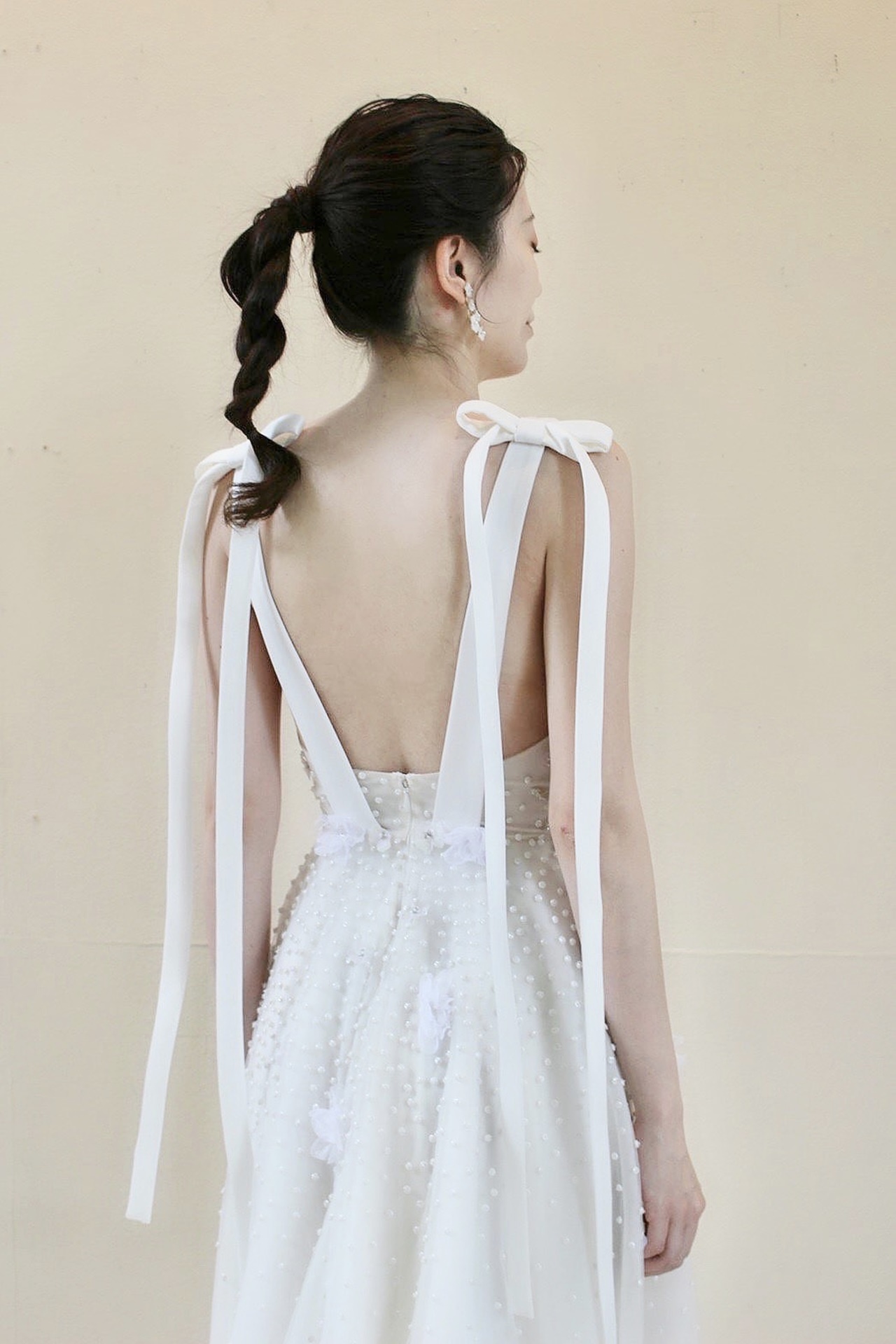 柔らかくエアリーなチュールが、流れるような広がりを描くスレンダーラインのシルエット。純粋で爽やかな透明感のあるオーラを放つこちらのドレスは、風の流れを纏い、日の光を浴びたときが本当の完成した姿。チュールの透明度や装飾のきらめきを計算しつくされています。なんとも愛らしい肩に乗るように結ばれたリボンは、花嫁が可憐に動くその姿を何倍にも魅力的に演出してくれます。歩みを進めるたびに優しい余韻を残すかのように、このドレスを纏って動くその姿こそがロマンティック。自然光が温かくふりそそぐチャペル、窓ガラスから差し込む光を浴びる開放的な披露宴会場でのパーティー、またはキャンドルの灯るナイトウェディングで…お召しになるシーンによってもまったく異なる表情を魅せてくれるウェディングドレスです。