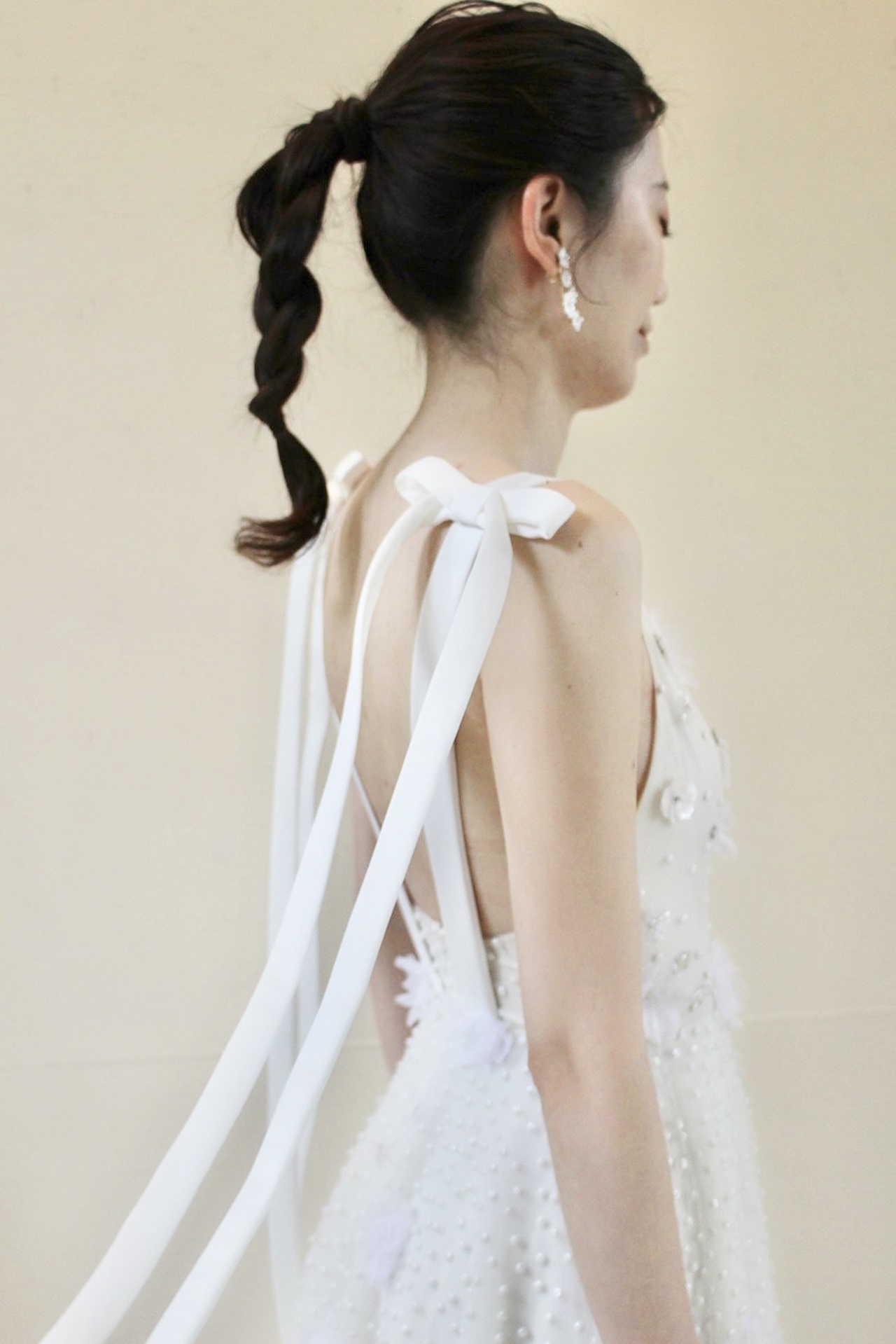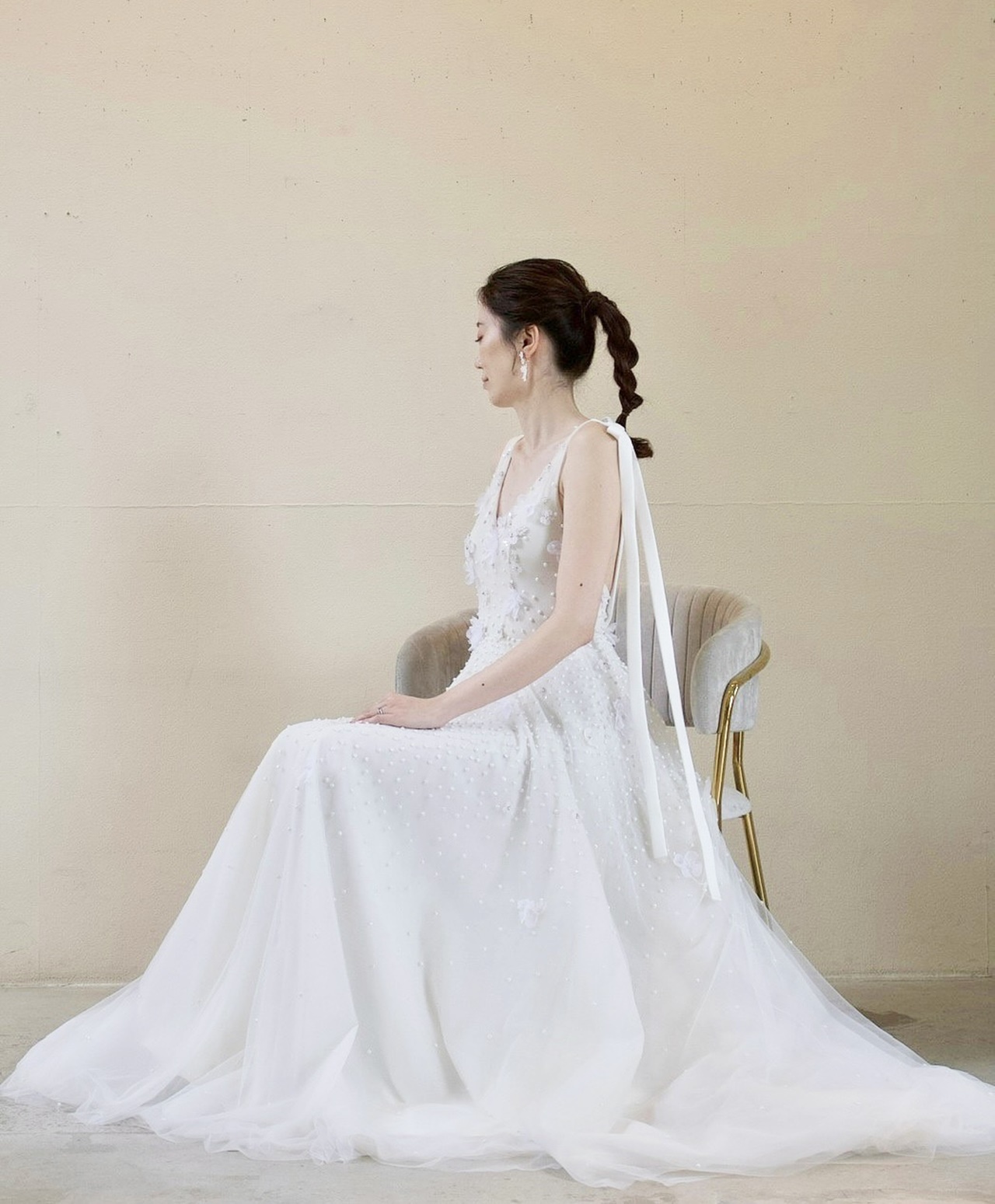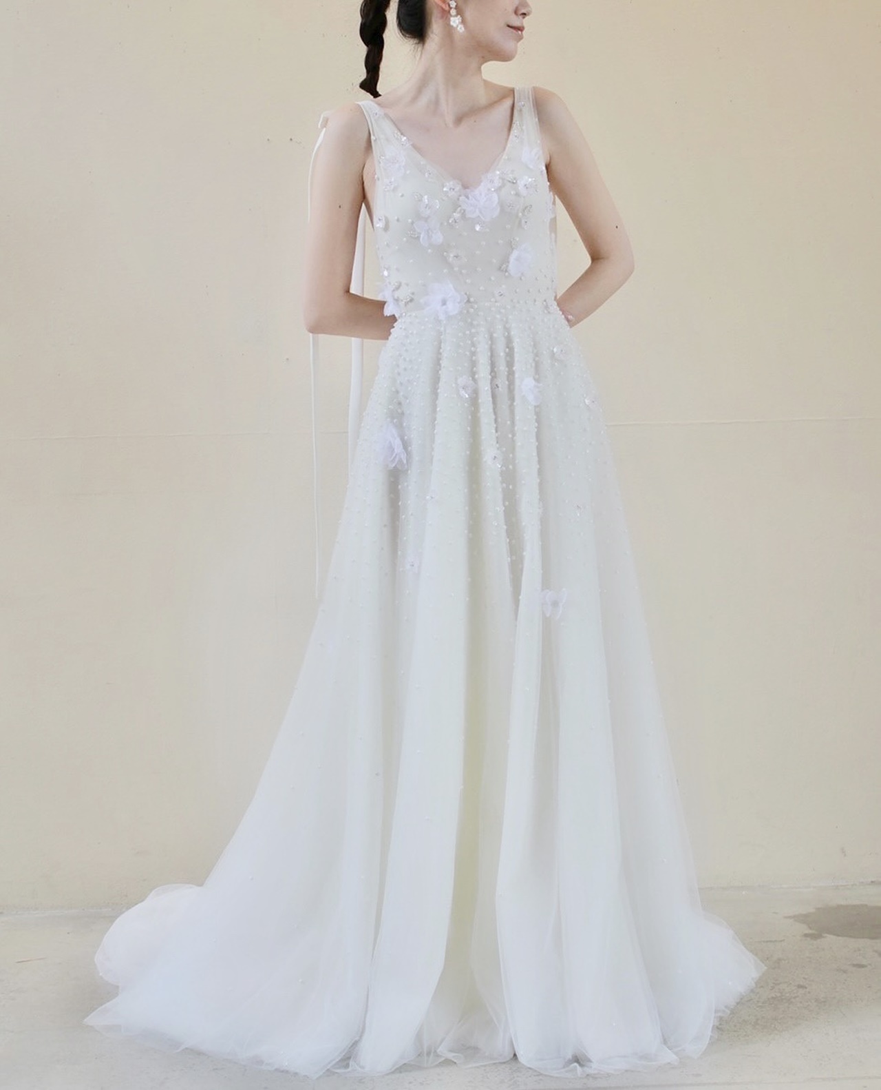 柔らかくエアリーなチュールが、流れるような広がりを描くスレンダーラインのシルエット。純粋で爽やかな透明感のあるオーラを放つこちらのドレスは、風の流れを纏い、日の光を浴びたときが本当の完成した姿。チュールの透明度や装飾のきらめきを計算しつくされています。なんとも愛らしい肩に乗るように結ばれたリボンは、花嫁が可憐に動くその姿を何倍にも魅力的に演出してくれます。歩みを進めるたびに優しい余韻を残すかのように、このドレスを纏って動くその姿こそがロマンティック。自然光が温かくふりそそぐチャペル、窓ガラスから差し込む光を浴びる開放的な披露宴会場でのパーティー、またはキャンドルの灯るナイトウェディングで…お召しになるシーンによってもまったく異なる表情を魅せてくれるウェディングドレスです。