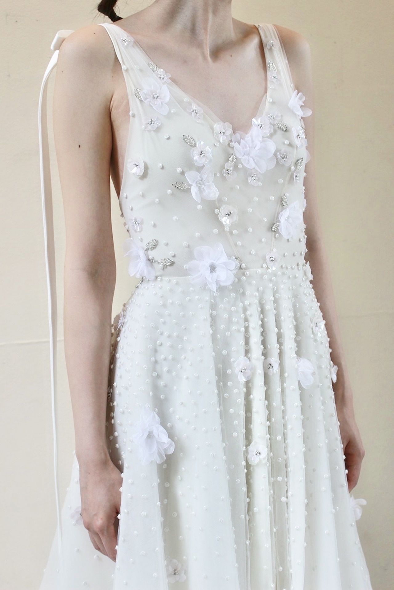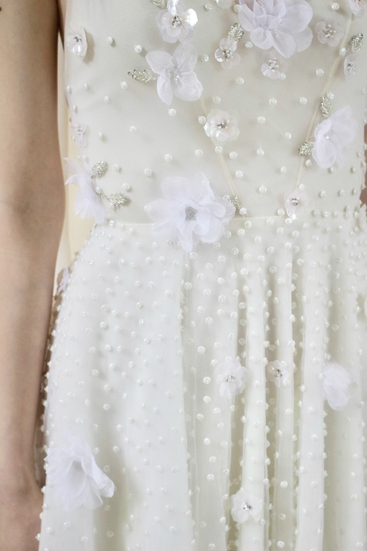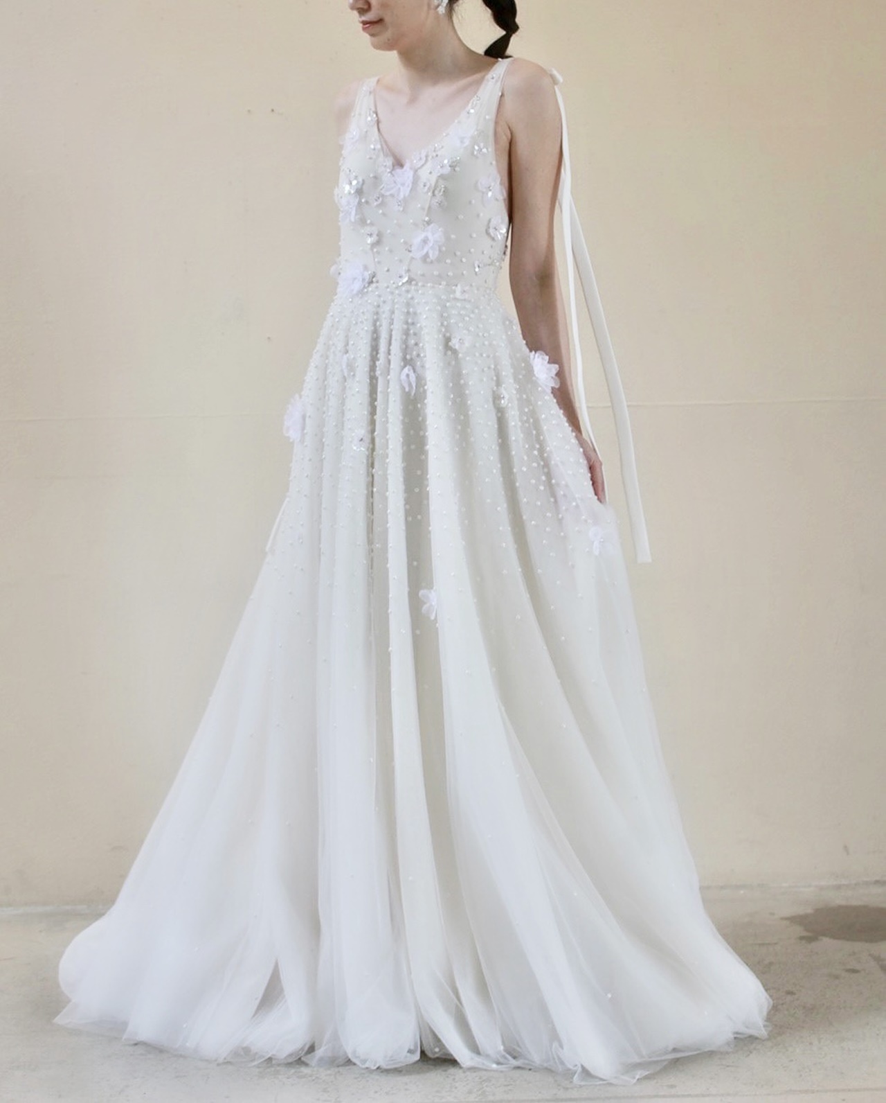 今回ご紹介するドレスは、“Barbara”と名づけられた一着。一目見ただけでうっとりと心を奪われてしまう、エレガントでロマンティックな魅力がふんだんに詰め込まれています。触れるのもためらうほど繊細で柔らかなオーガンジーで表現したフラワーモチーフは、まるで本物の花々が優しく咲き誇るかのよう。丁寧にビーズを縫い合わせ描かれたリーフモチーフ、スカートに広がるパールには一つ一つビーズが重ねられ、ロマンティックでありながらも、モダンでこれまでに出逢ったことのないキャッチーな遊び心を感じさせてくれます。