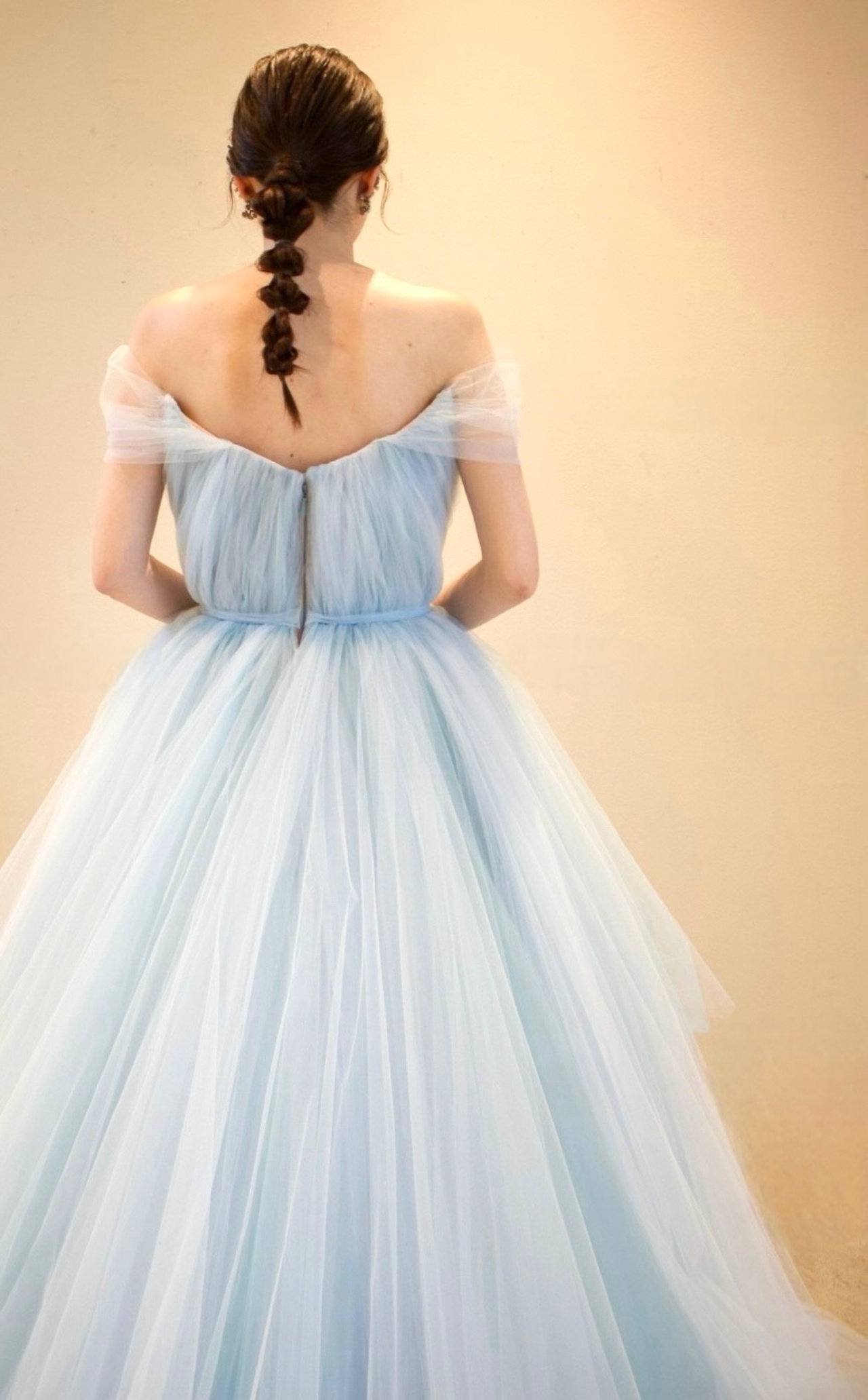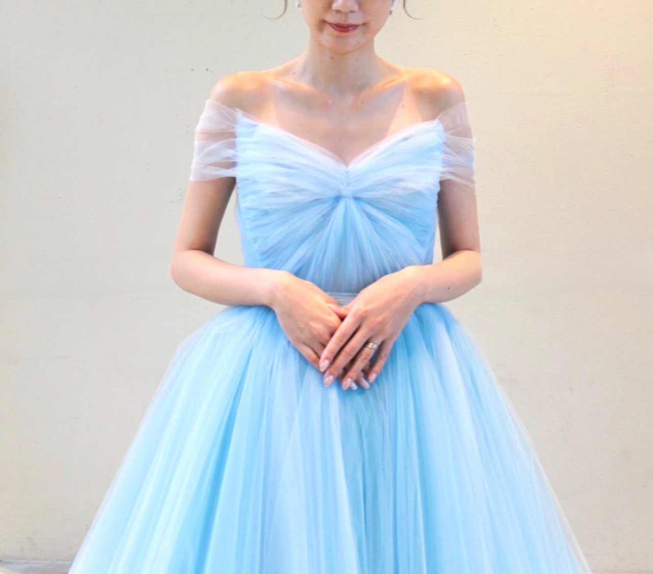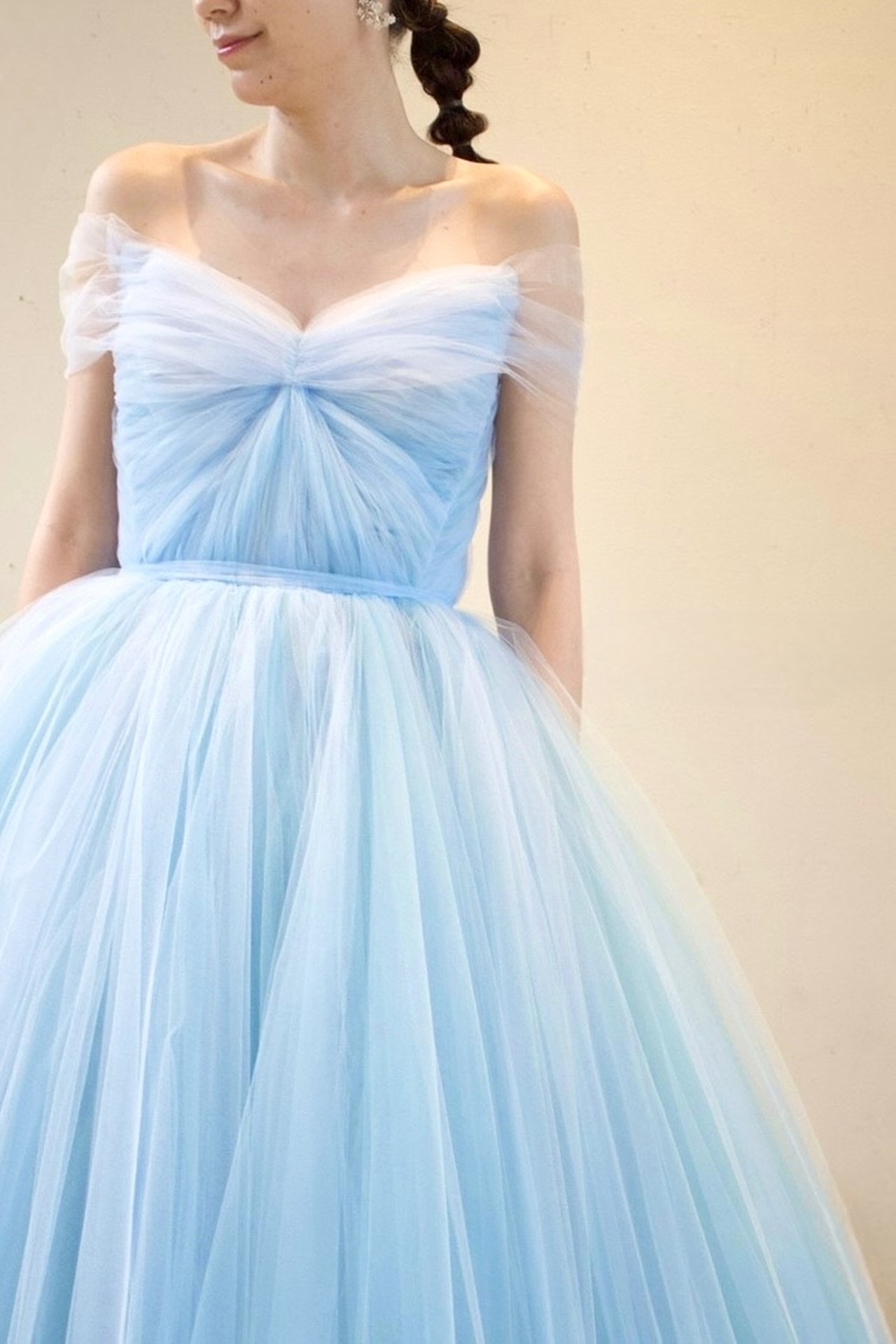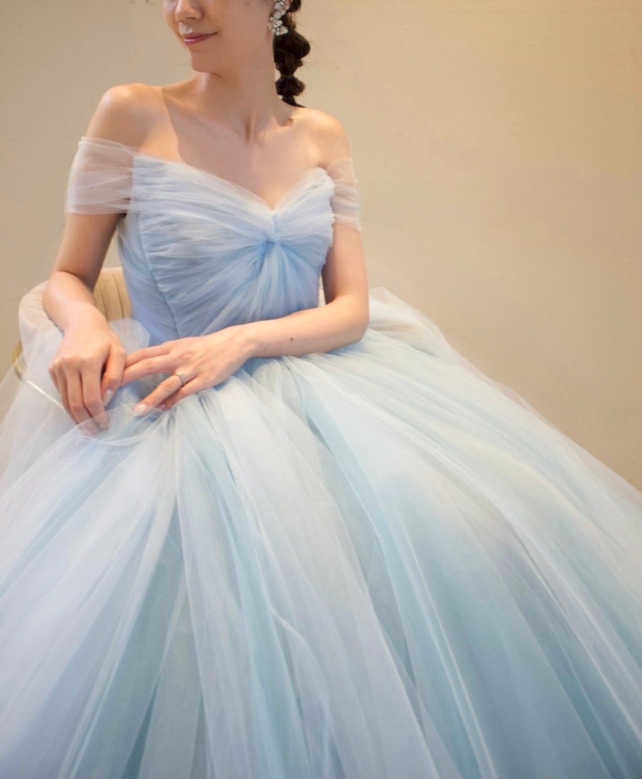 ウェディングドレスからお召し替えをされ、お色直しの再入場の扉が開いた瞬間、圧倒的な華やかさを放つこと間違いなしのカラードレス。数色のチュールが重なり創り出された、透き通るような澄んだブルーの色味は、他にはない絶妙なカラーリングです。光の加減によって柔らかなグラデーションのようにも見え、お召しいただく時間帯、シーンによっての変化も楽しんでいただけます。チュールが何層にも重なり合うことでパニエを使用せずともふわっと柔らかく広がるプリンセスラインのボリュームは、幾層にも重ねられたシルク素材と細かいディテールまでにこだわっているリーム アクラだからこそ叶えることのできる特別な一着です。シルク素材を用いることでボリュームたっぷりでありながら、とても軽い着心地が叶うため、お式当日も普段のご自身らしくリラックスしてお過ごしいただけます。スカートのフロントにはアシンメトリーにチュールの立体感がでるようなカッティングが施されており、花嫁が動くとふわりと一緒に揺れ動きます。胸元はオフショルダーのデザインがデコルテラインをすっきり綺麗に。細部までこだわり抜かれた何とも魅力的なデザインです。またご披露宴でお席にお掛け頂くと、柔らかで透明感あるチュールが花嫁を包み込み幸福感溢れる華やかさを放ちます。どんなシーンでも皆様を魅了するドレスに是非お袖を通してみませんか。