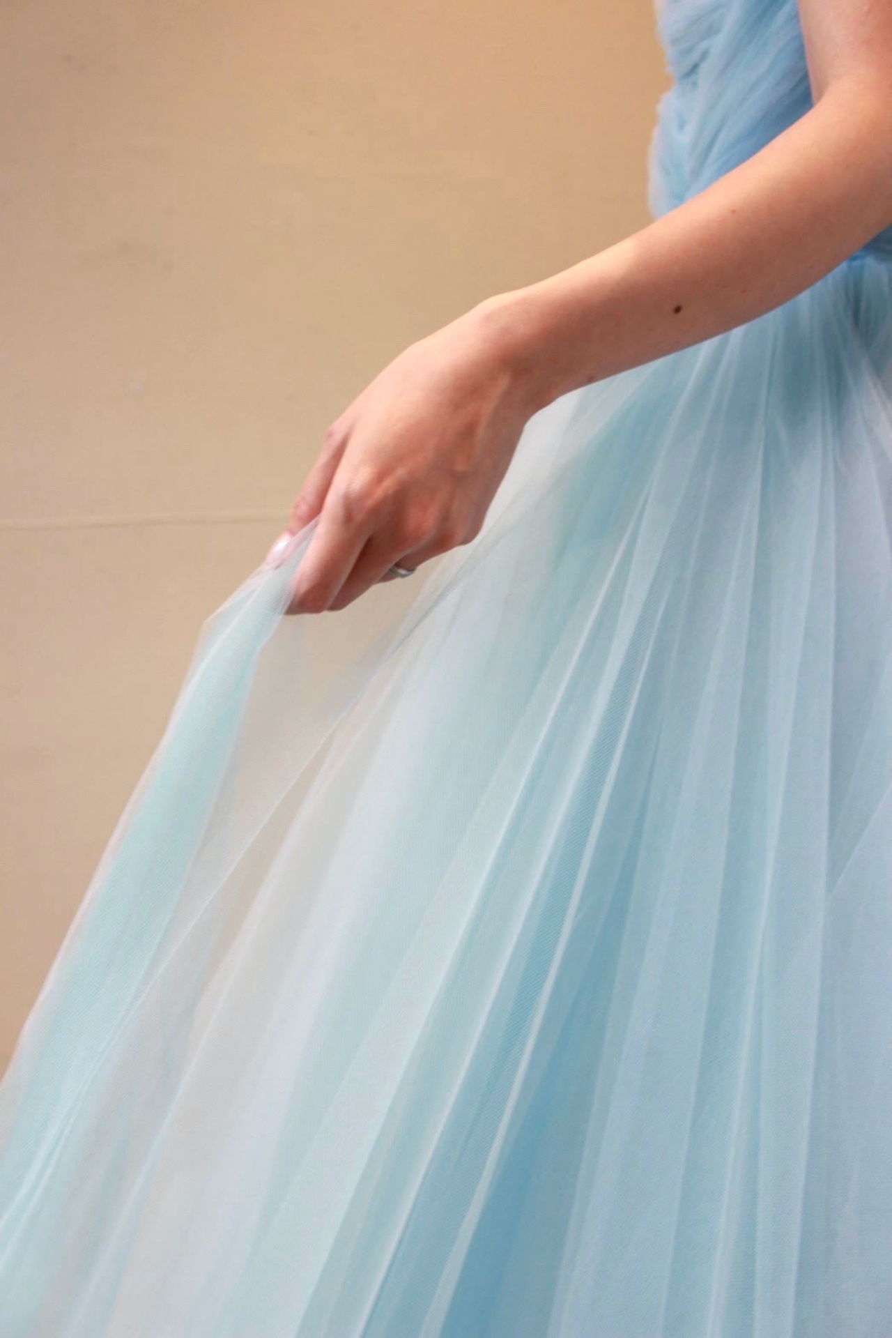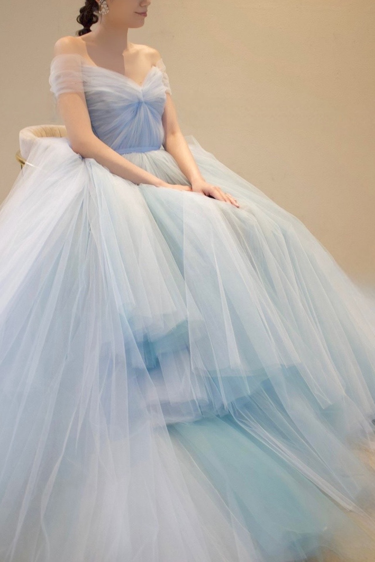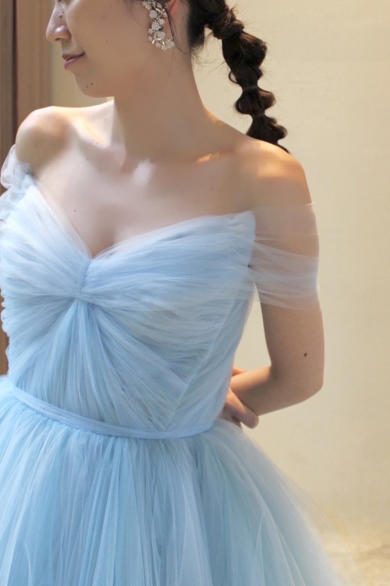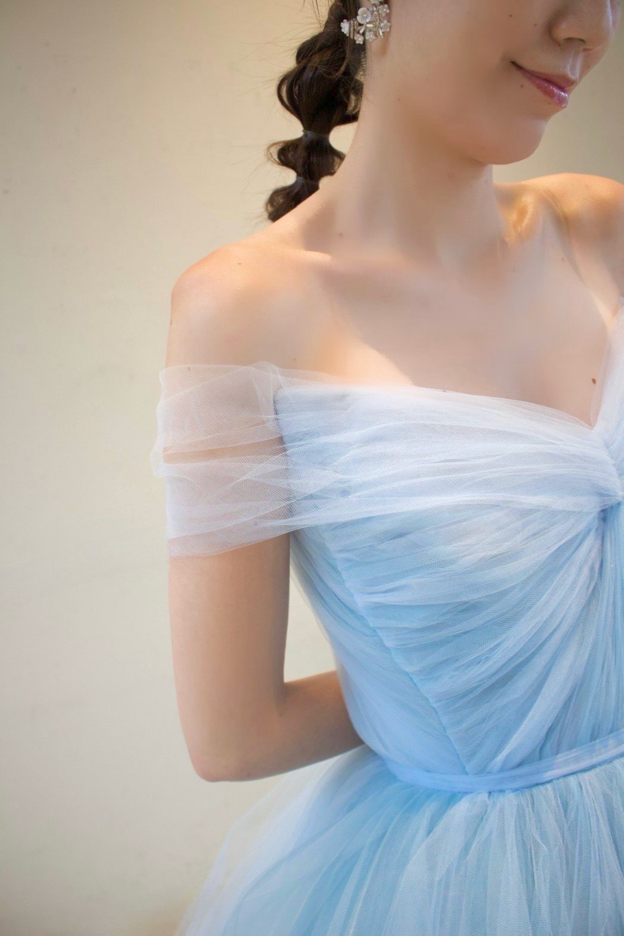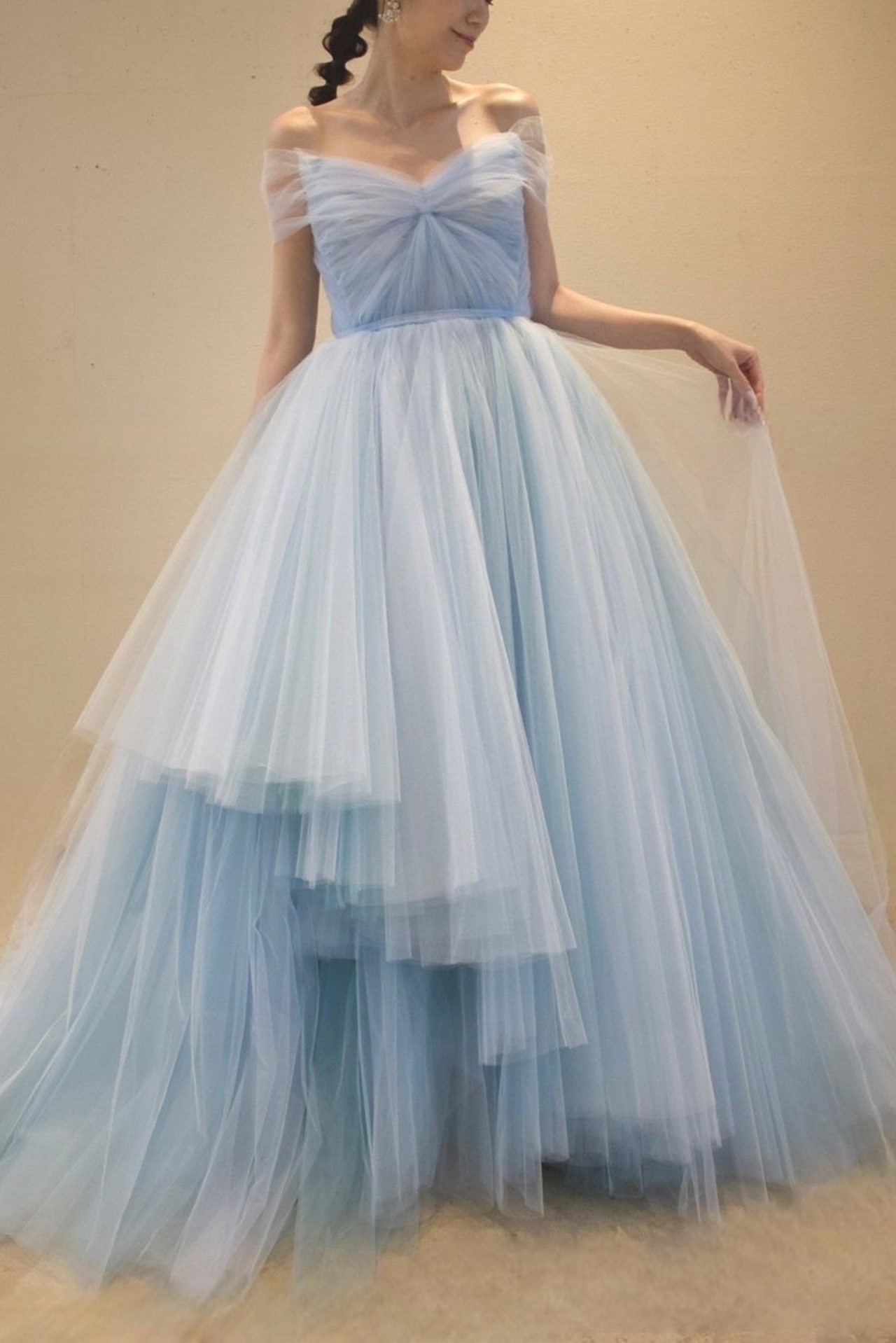 ウェディングドレスからお召し替えをされ、お色直しの再入場の扉が開いた瞬間、圧倒的な華やかさを放つこと間違いなしのカラードレス。数色のチュールが重なり創り出された、透き通るような澄んだブルーの色味は、他にはない絶妙なカラーリングです。光の加減によって柔らかなグラデーションのようにも見え、お召しいただく時間帯、シーンによっての変化も楽しんでいただけます。チュールが何層にも重なり合うことでパニエを使用せずともふわっと柔らかく広がるプリンセスラインのボリュームは、幾層にも重ねられたシルク素材と細かいディテールまでにこだわっているリーム アクラだからこそ叶えることのできる特別な一着です。シルク素材を用いることでボリュームたっぷりでありながら、とても軽い着心地が叶うため、お式当日も普段のご自身らしくリラックスしてお過ごしいただけます。スカートのフロントにはアシンメトリーにチュールの立体感がでるようなカッティングが施されており、花嫁が動くとふわりと一緒に揺れ動きます。胸元はオフショルダーのデザインがデコルテラインをすっきり綺麗に。細部までこだわり抜かれた何とも魅力的なデザインです。またご披露宴でお席にお掛け頂くと、柔らかで透明感あるチュールが花嫁を包み込み幸福感溢れる華やかさを放ちます。どんなシーンでも皆様を魅了するドレスに是非お袖を通してみませんか。