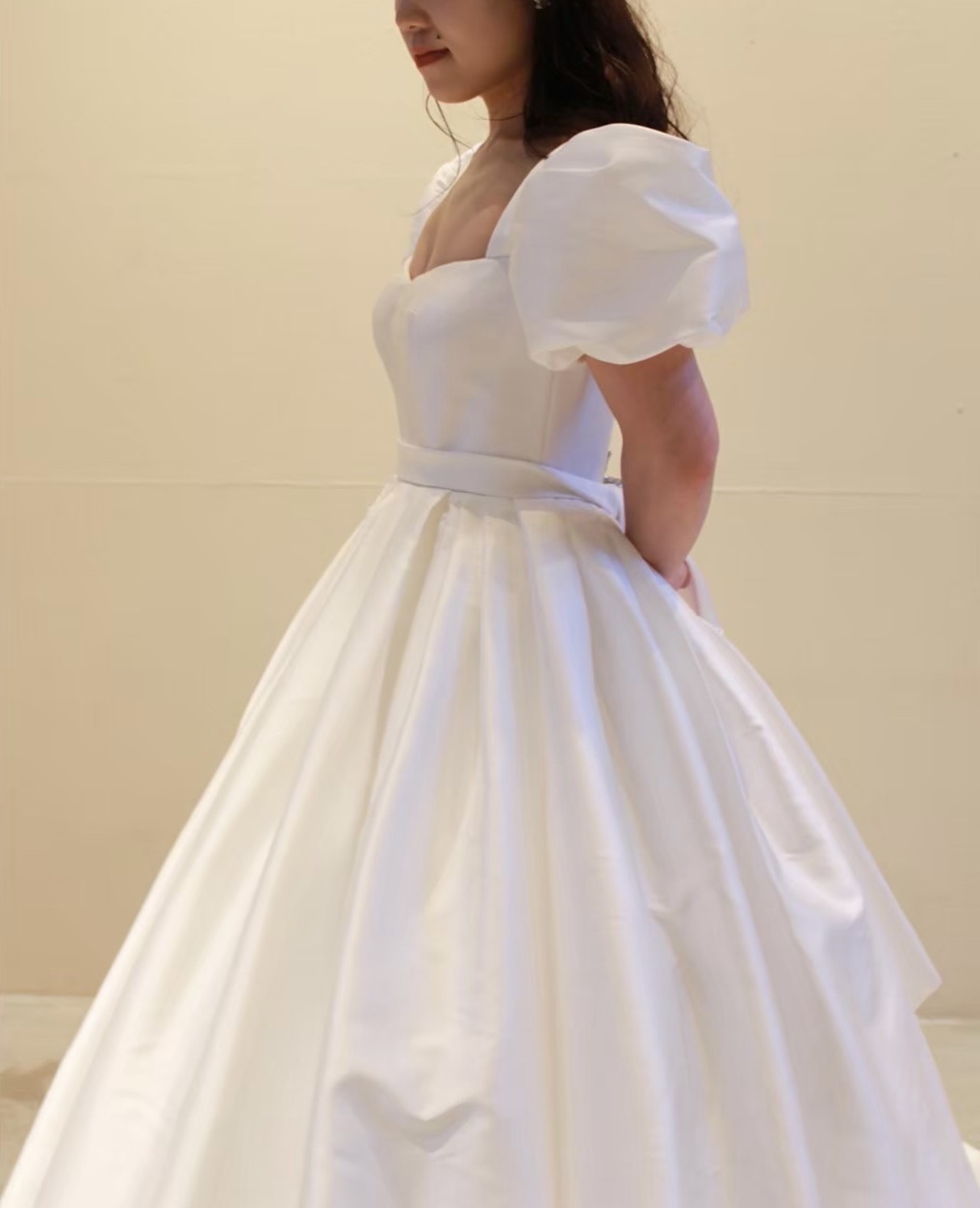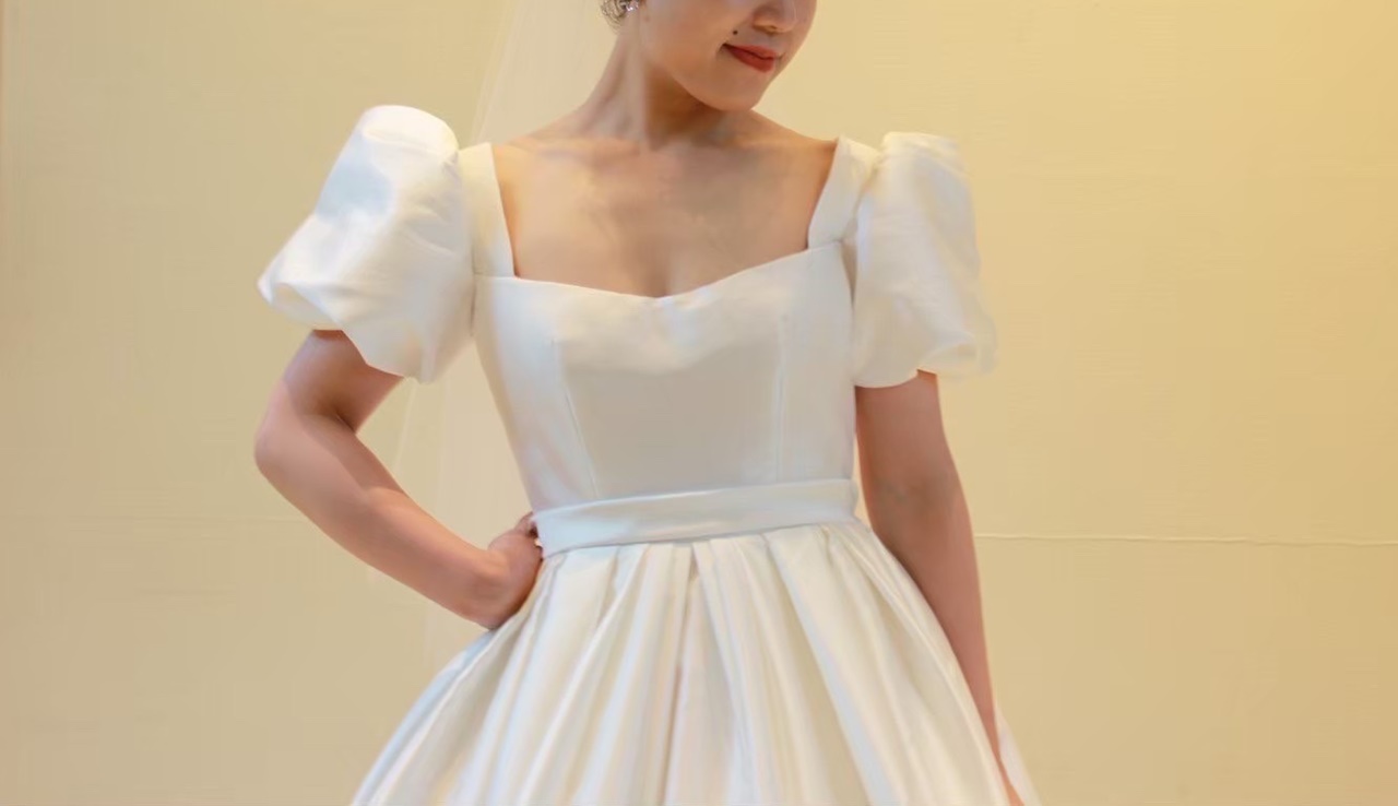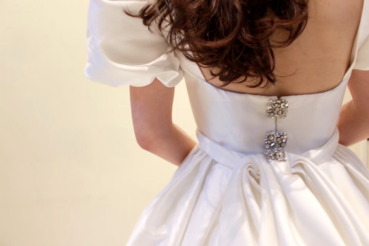 トレンドのビッグパフスリーブが目を惹く「MING(=明)」と名付けられたウェディングドレス。どの時代でも憧れられるようなプリンセスラインのデザインは、袖を通すだけで自然と背筋が伸びるようなそんな特別感を感じさせてくれます。光沢感のあるミカドシルクと相まって、腰回りの内側にハードチュールをあしらうことによりパニエを入れずともプリンセスラインのボリュームを叶えて主役感を引き立たせます。お顔まわりのビッグパフスリーブはフェイスラインを華奢で美しく見せ、リーム アクラのアイコニックである胸元のスクエアカットはデコルテラインをすっきりと綺麗に見せてくれます。計算し尽くされた胸元のデザインによりフェミニンな印象になりすぎず、女性らしい洗練された印象に。バックスタイルには華やかさを添えるシルバービジューが施され、花嫁の美しさをより際立たせる洗練されたシンプルさと考え抜かれたクチュールデザインに心がときめきます。