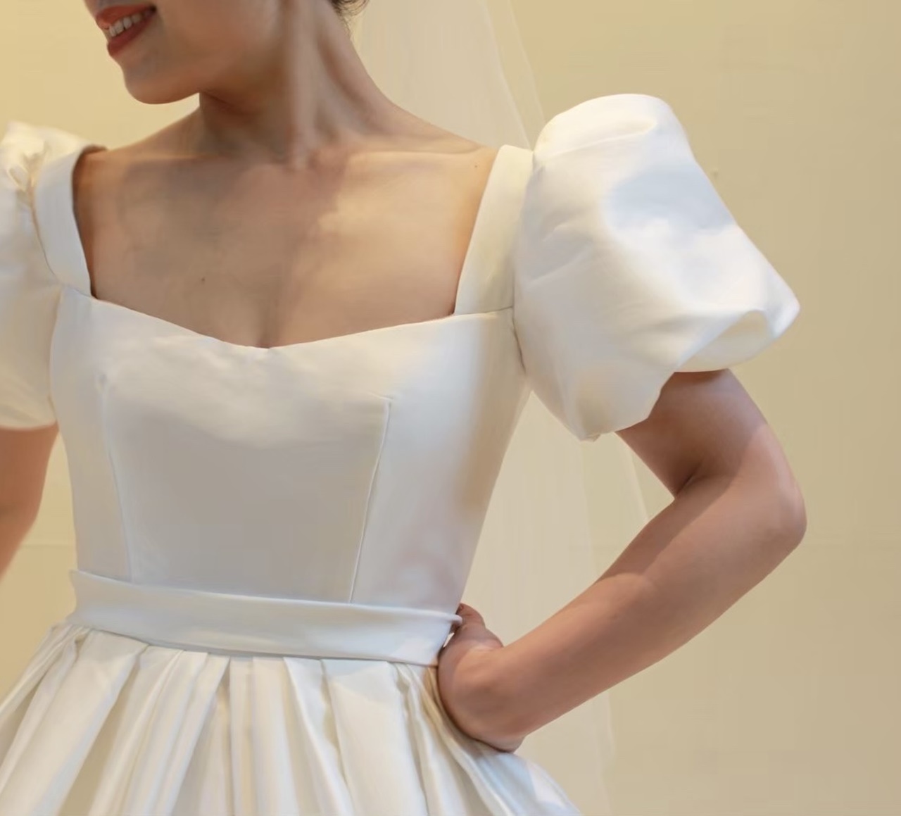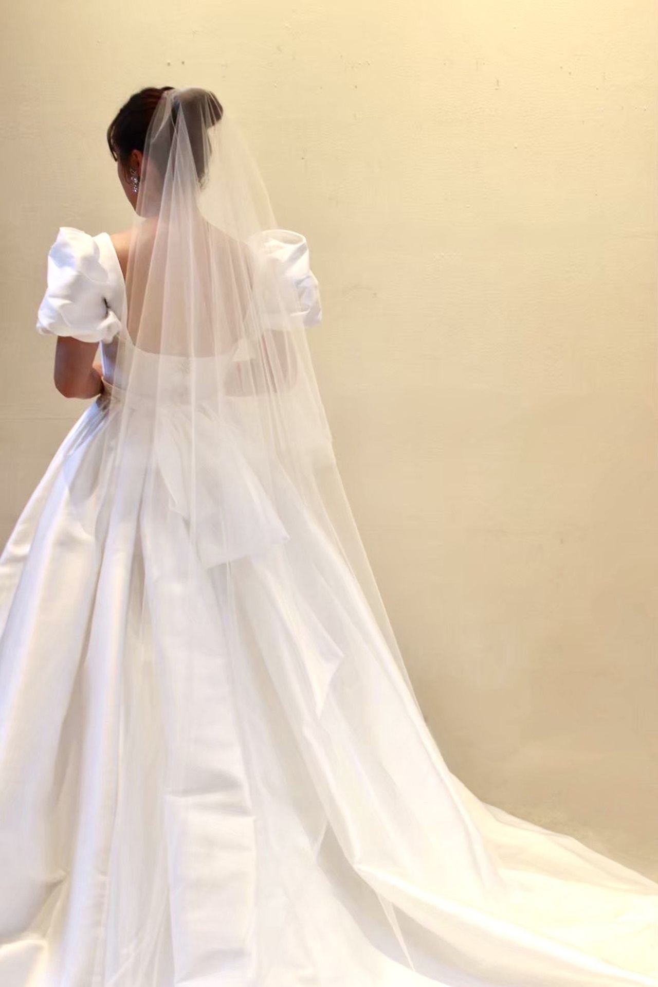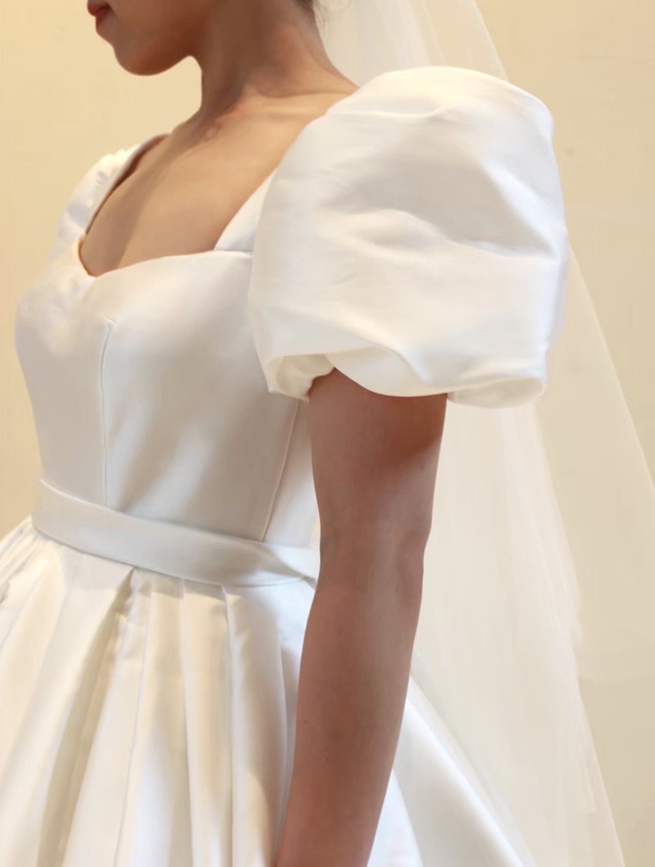 トレンドのビッグパフスリーブが目を惹く「MING(=明)」と名付けられたウェディングドレス。どの時代でも憧れられるようなプリンセスラインのデザインは、袖を通すだけで自然と背筋が伸びるようなそんな特別感を感じさせてくれます。光沢感のあるミカドシルクと相まって、腰回りの内側にハードチュールをあしらうことによりパニエを入れずともプリンセスラインのボリュームを叶えて主役感を引き立たせます。お顔まわりのビッグパフスリーブはフェイスラインを華奢で美しく見せ、リーム アクラのアイコニックである胸元のスクエアカットはデコルテラインをすっきりと綺麗に見せてくれます。計算し尽くされた胸元のデザインによりフェミニンな印象になりすぎず、女性らしい洗練された印象に。バックスタイルには華やかさを添えるシルバービジューが施され、花嫁の美しさをより際立たせる洗練されたシンプルさと考え抜かれたクチュールデザインに心がときめきます。