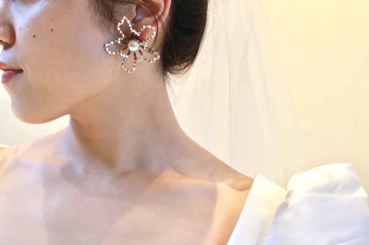 リーム アクラの上品で圧倒的な存在感のあるドレスに合わせて、シーンによって表情が変わるコーディネートを。挙式スタイルは高い位置でラフにまとめた緩やかなシニヨンに、大ぶりなフラワーモチーフのイヤリングをあわせ、シンプルではありながら女性らしくロマンティックなコーディネートに。どこか圧倒的なオーラが漂うのはリーム アクラのドレスだからこそ。気品漂うシンプルなドレスに、大ぶりながら柔らかな煌めきのイヤリングがコーディネートに華やぎを添えます。花嫁だけの特別なアイテムであるベールには、お二人の晴れの日を祝福するかのように広がるレースを施すことで、より一層バックスタイルの美しさを引き立てます。ミカドシルクでしか表現することのできない艷やかな光沢あるドレスに透明度の高いロングベールを合わせた神秘的で洗練されたスタイルは、息をのむほどの美しさを放ち、ゲストの皆様の隣をゆったりと歩むそのお姿に誰もが心を奪われることでしょう。披露宴からはふんわりとカールしたダウンスタイルに華奢なイヤリングを合わせ、余裕のあるリラックス感を醸し出すコーディネートへとチェンジ。ゲストとぐっと距離が近づくパーティーシーンでは挙式のスタイルとは印象を変え、優雅な上品さを感じるような大人な雰囲気を纏い、ゲストの皆様を魅了します。