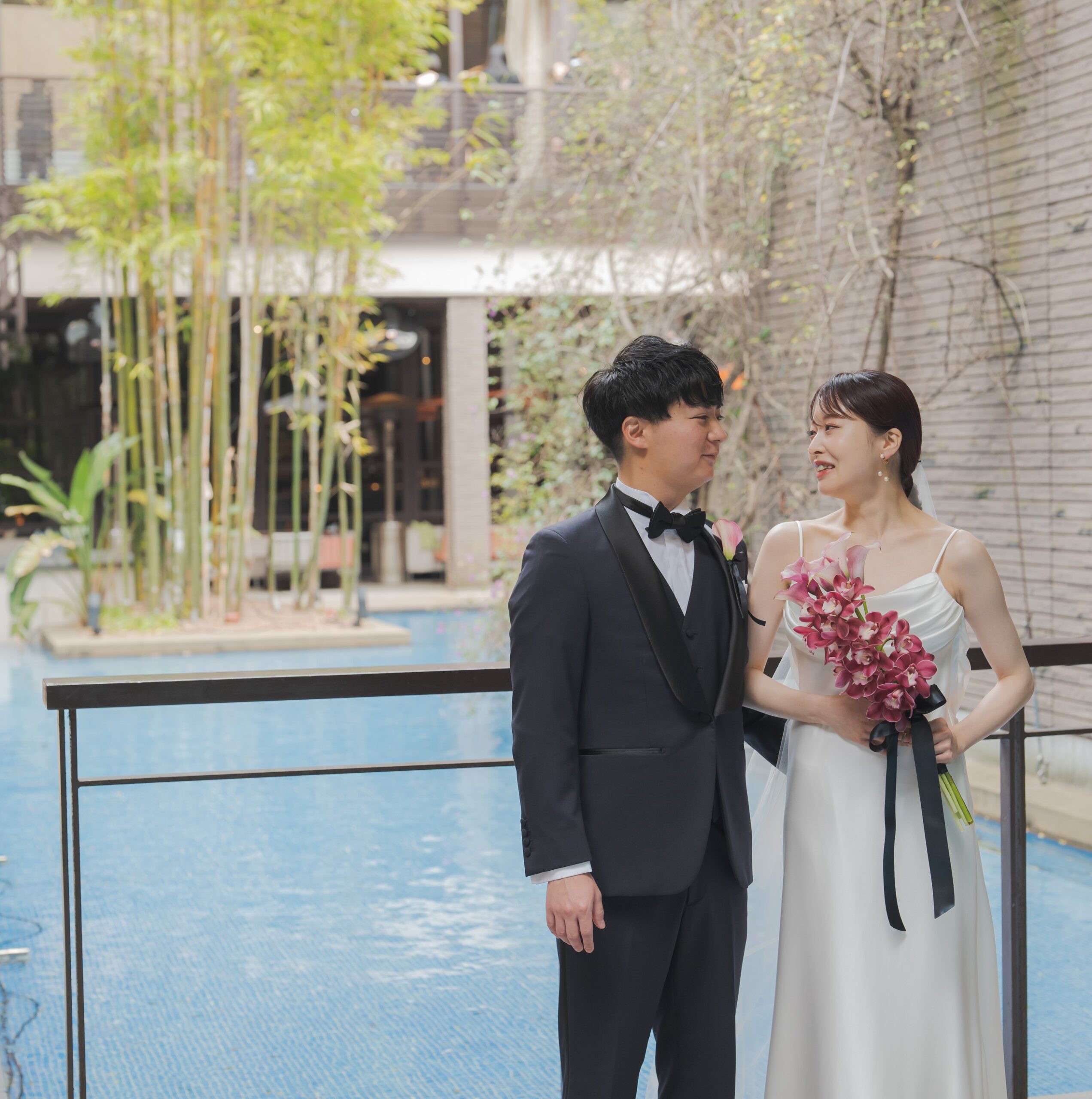 アムサーラのスレンダーラインのウェディングドレスと、ネイビーのタキシードで並んだコーディネートは流行りに流されないクラシカルなスタイルです