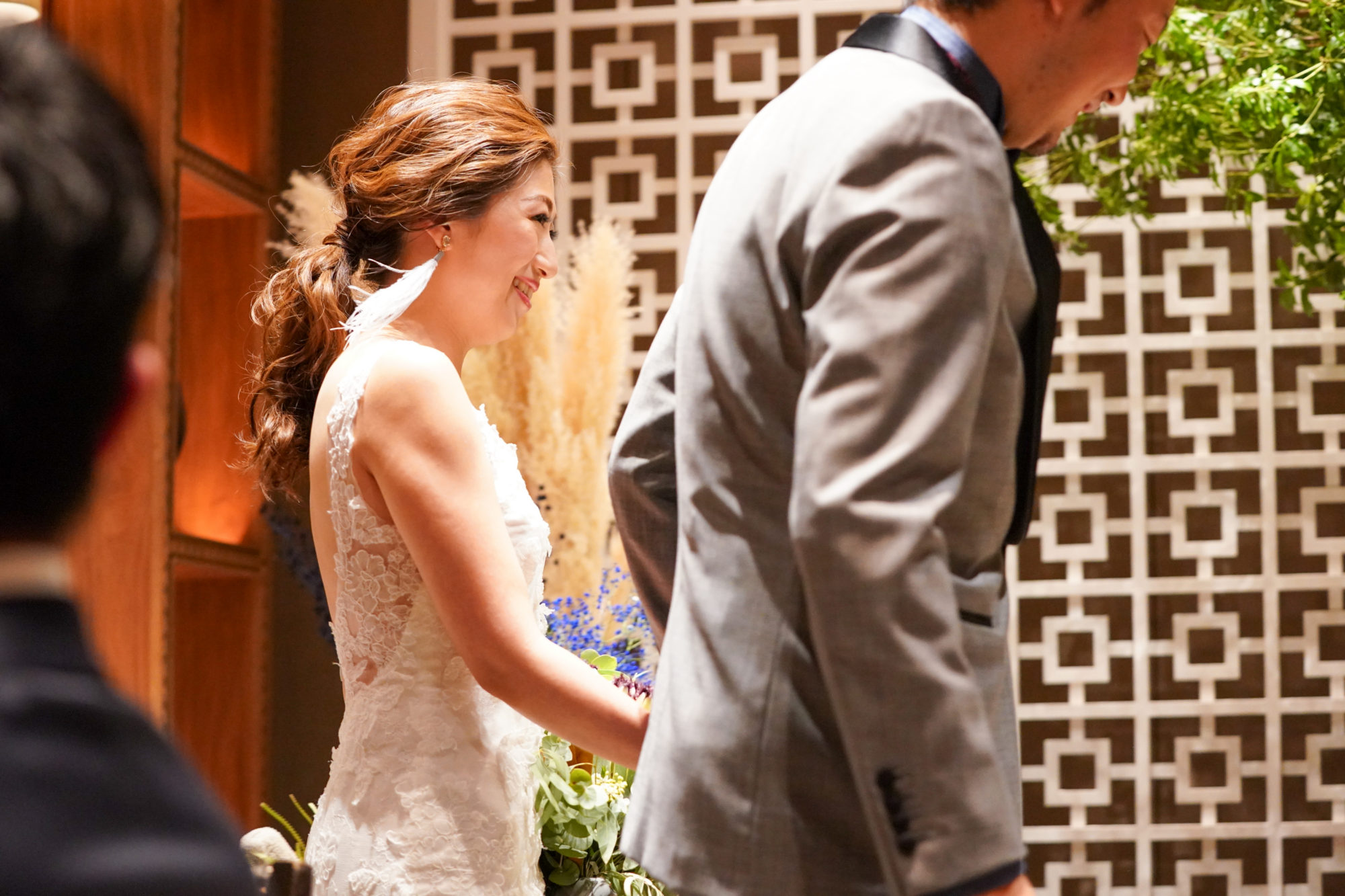 ご新婦様の動きに合わせてなびくフェザーのイヤリングが