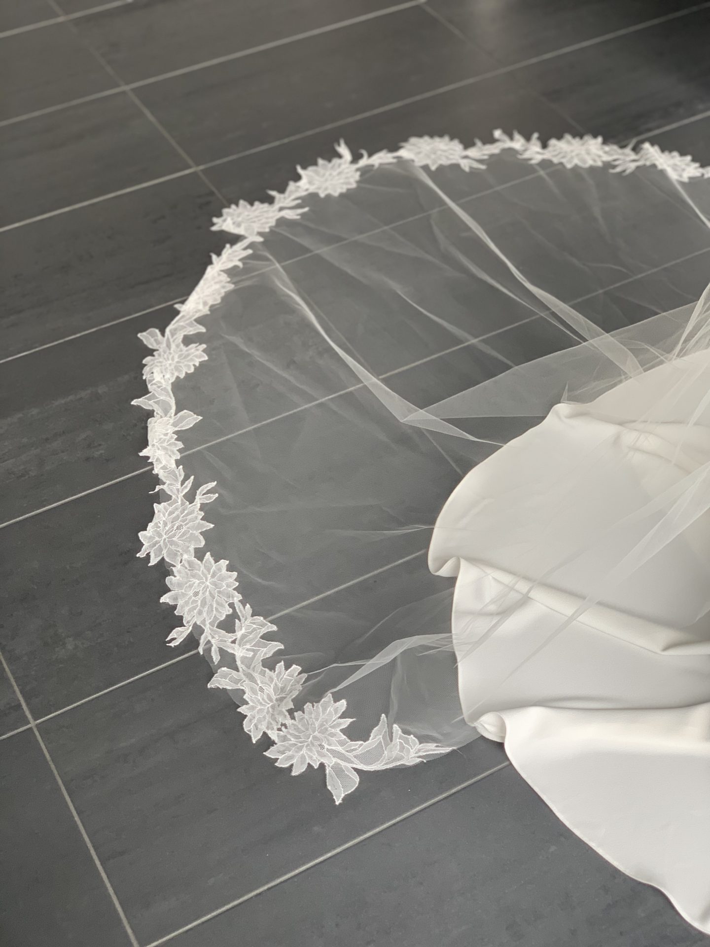 バージンロードにレースが浮かび上がる新作のベールが入荷しました
