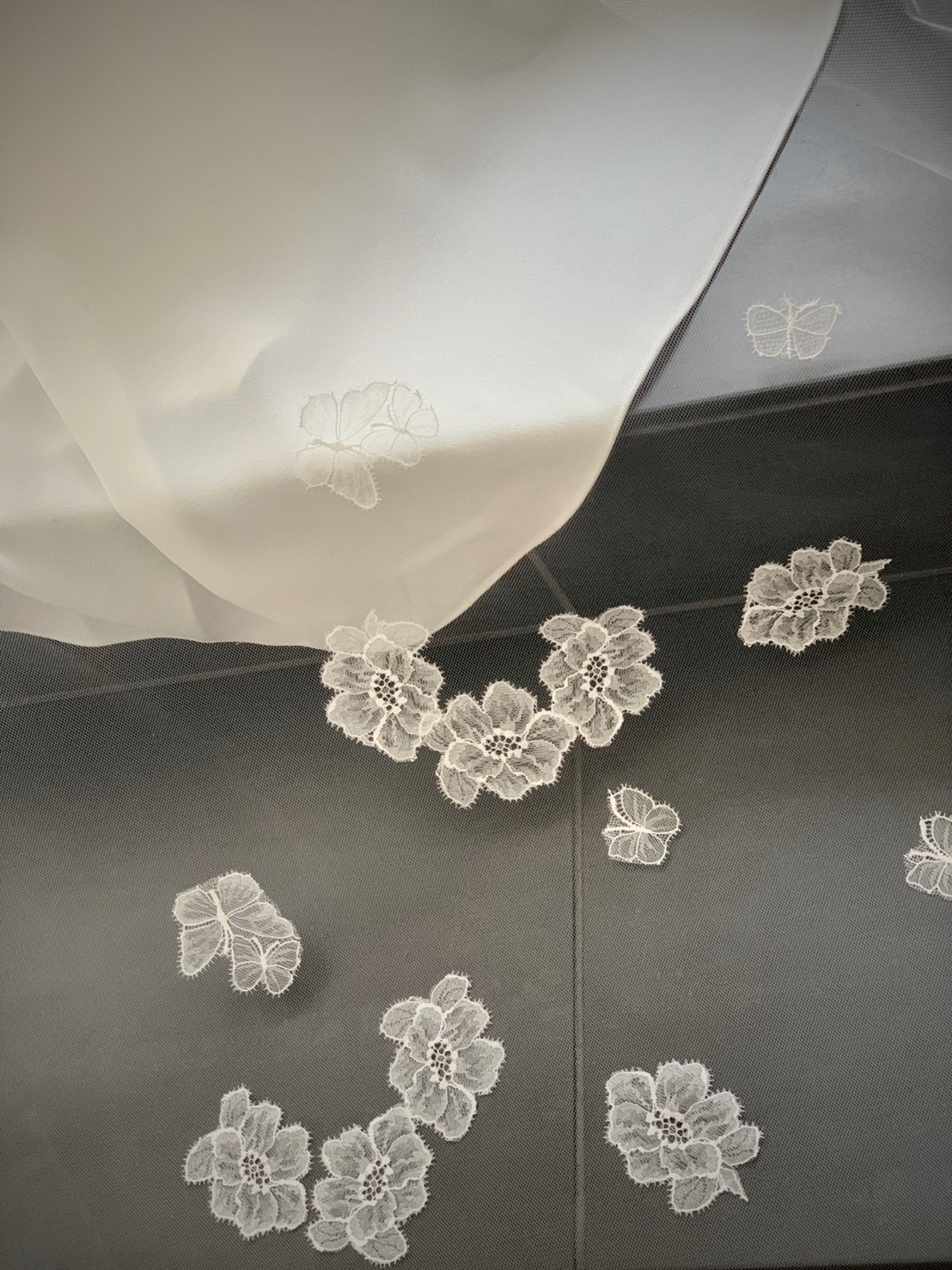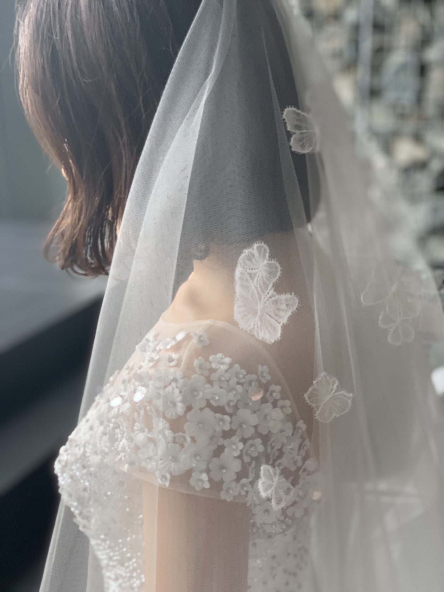 裾元だけでなく、フェイスにもお花と蝶々のレースがあしらわれたこちらのベール。