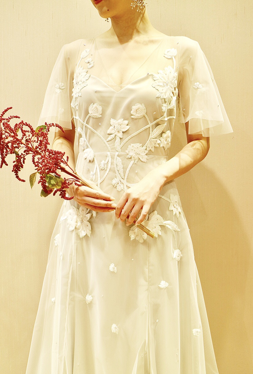 淡く柔らかなモスグリーンのお色味に、リーフとフラワーの刺繍が贅沢に施された1着。