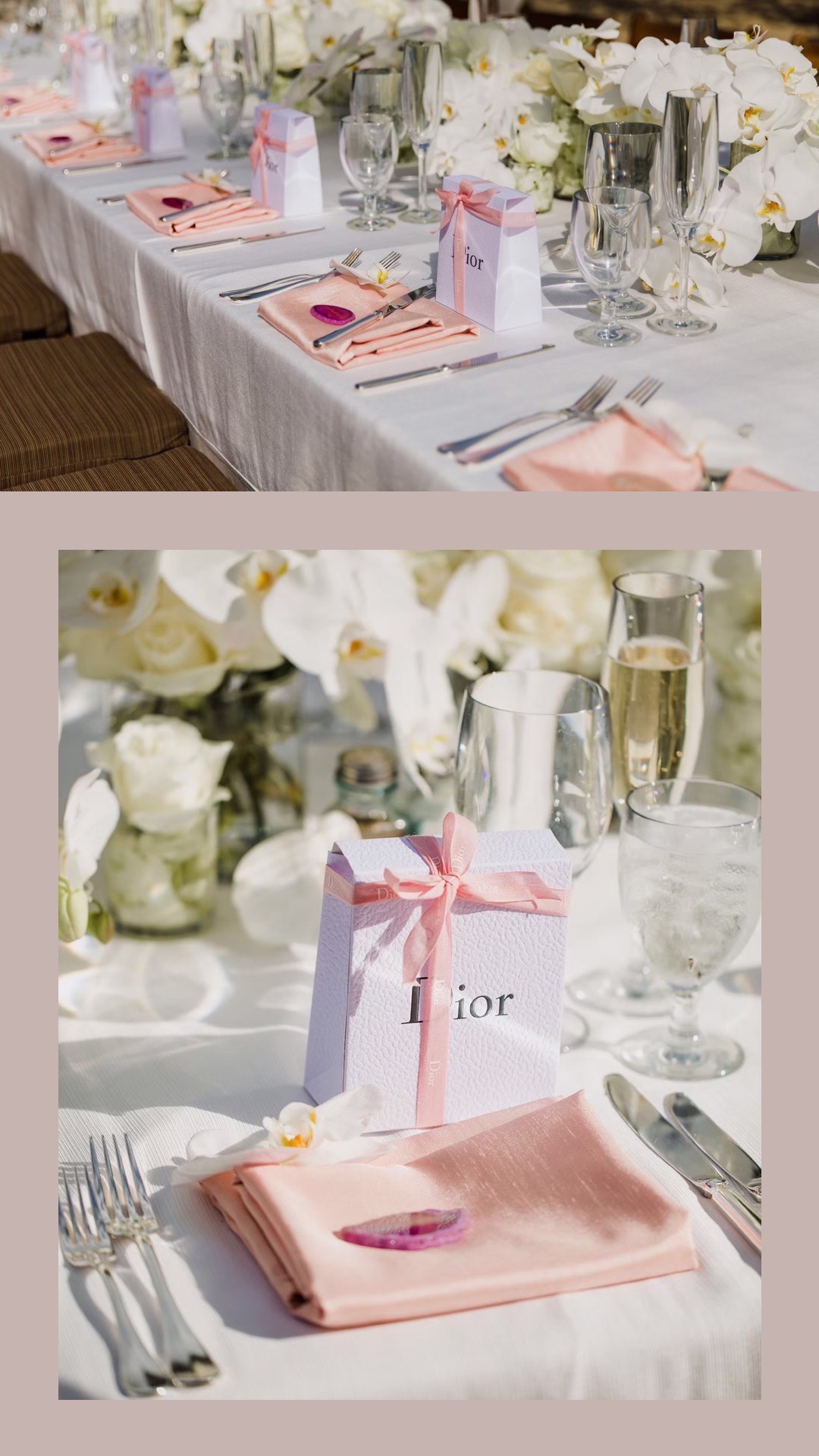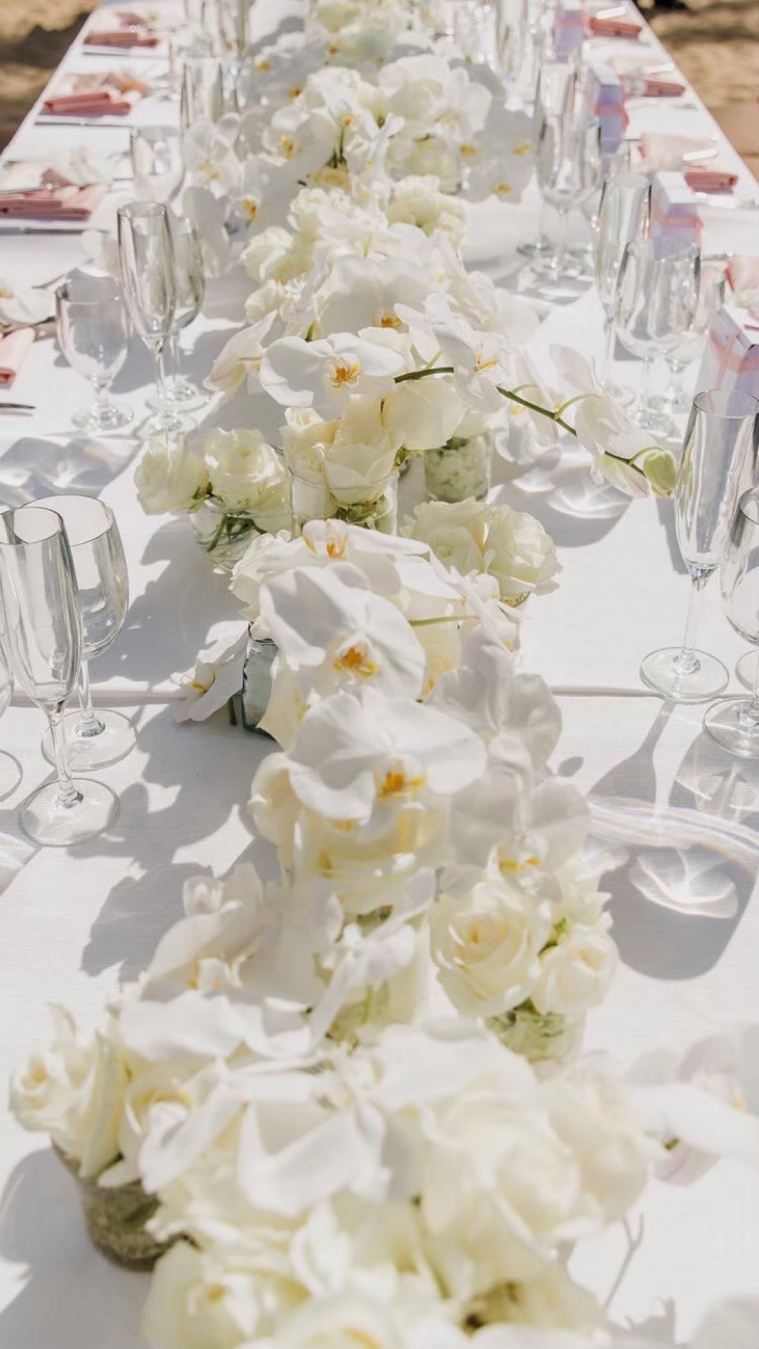 真っ白なテーブルクロスに白を基調とする胡蝶蘭とバラを組み合わせ、パステルピンクの小物をポイントで。