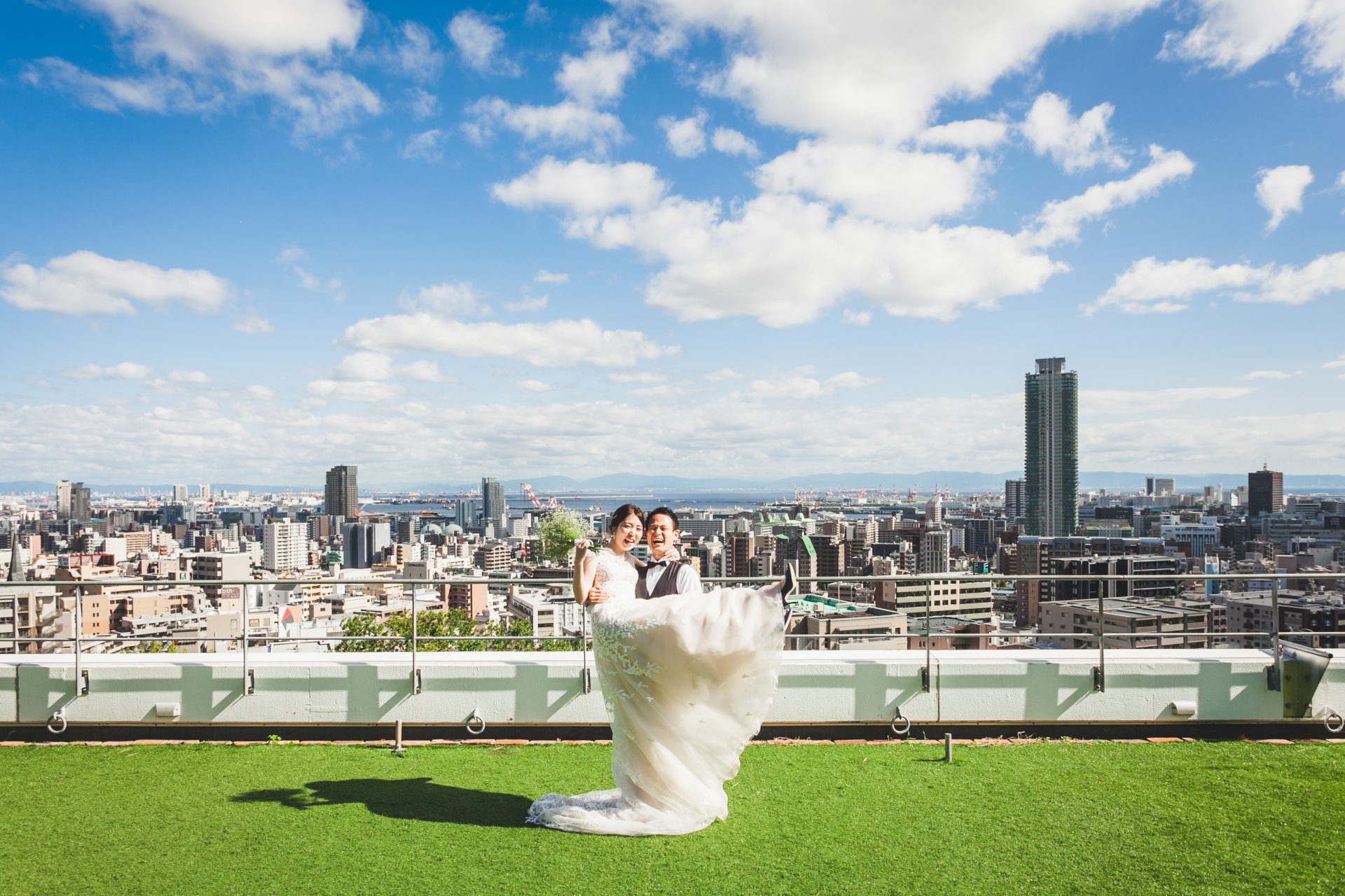 六甲の山々に囲まれ、美しい街と海が一望できる北野の高台に佇むKITANO CLUB sola(北野クラブソラ)。秋晴れの心地よい日に、数ある提携ショップの中からTHE TREAT DRESSING 神戸店の衣装を身に纏い、ゆったりと流れゆく空と共に前撮りを行ったお二人をご紹介いたします。