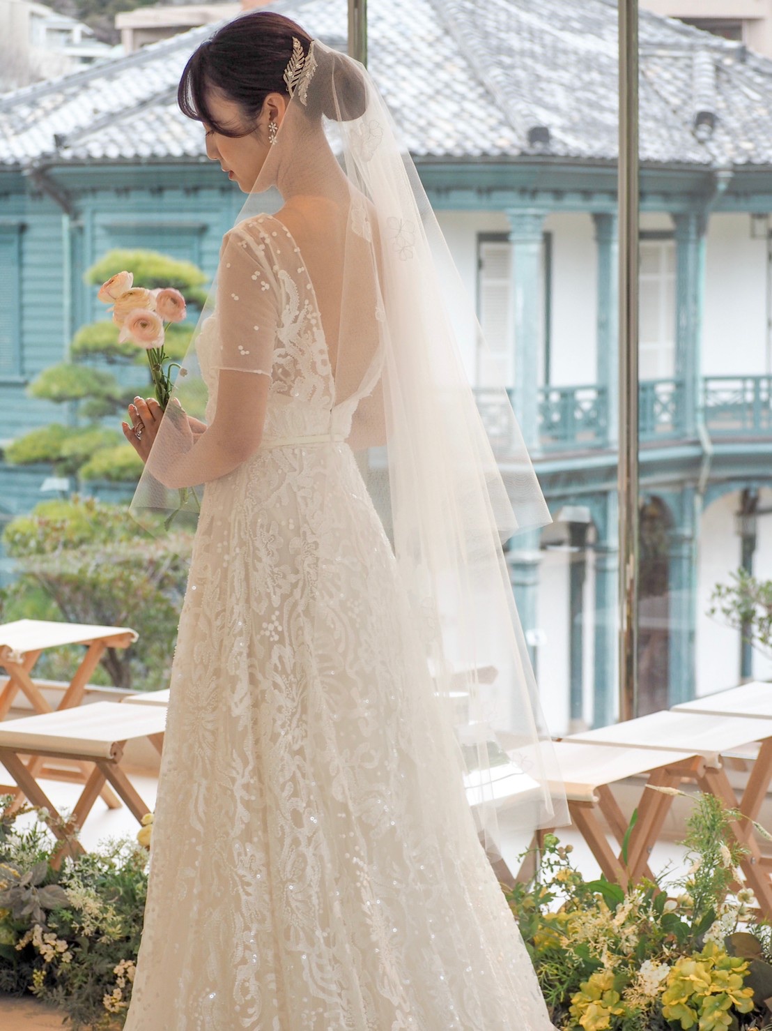 チャペルから差し込む柔らかな光を浴びながら、繊細なチュールとシークインレースならではのスパンコールの上品な煌めきを身に纏ったご新婦様には、TREAT MAISONオリジナルベールがおすすめです。コーディネートをする上でも欠かせないのがウェディングベール。お仕度の最後に合わせるだけで、そのコーディネートが仕上がるほどドレスとのバランスを計算し作られた、蝶々の刺繍が舞うロマンティックなベールを合わせ、幸福感に満ち溢れたコーディネートに。TREAT MAISONでは、レースの位置にこだわりながら、一針一針アトリエの職人が丁寧に縫い付けています。透明度の高いソフトチュールは、これから愛を誓われるご新婦様の決意と儚げな表情をより鮮明に映し出します。ドレスやベールのデザイン、ご新婦様の美しさがより一層際立つよう、ヘアスタイルはシンプルなシニヨンに。一歩一歩、バージンロードを歩んでいくセレモニーのシーンでは、繊細に輝き揺れ動く小ぶりなイヤリングを合わせるのはいかがでしょうか。