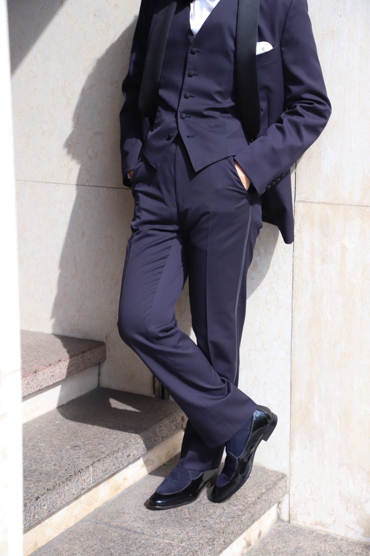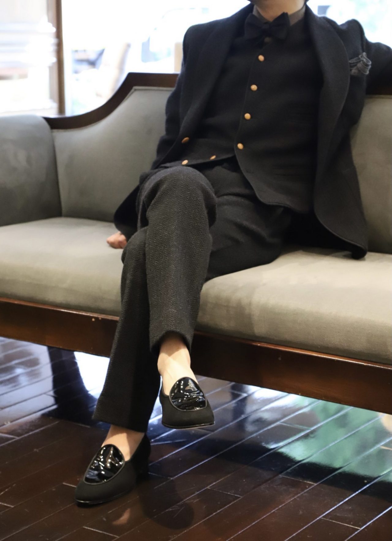 スリップオンは革靴と違い、靴のトップラインが浅く履き口は広いため程よいリラックス感を演出しどこか凛として気品ある風格がスリップオンの良さと言えます。また、合わせるシューズについては時間や場所、その場合に応じた相応しい服装の使い分けが出来ることも大切とされます。こちらのグレーのニット生地を使用したスリーピースにブラックカラーのスリッポンを合わせたカジュアルコーディネートは、ウール生地のスリーピースとシューズのスエードの素材が秋冬の季節感を演出し、新郎様のスタイリングをグッとモダンな印象にします。足元のコーディネートについては敢えて通常のソックスではなくショートソックスを合わせることにより秋冬の素材同士で重くなりすぎないよう適度な抜け感を演出してくれます。甲のパテントの切り替えも華やかさと特別感を醸し出しパーティスタイルに花を添えてくれます。