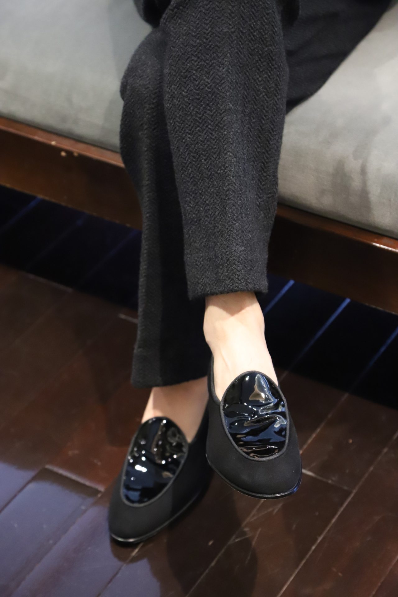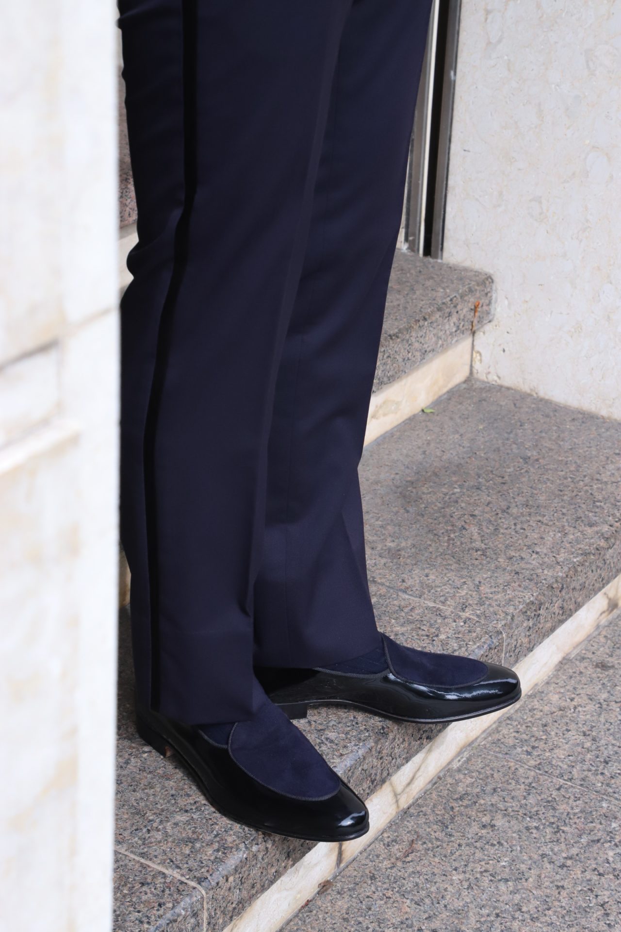 アッパー(上革)全体は隣に並ぶ女性ドレスの裾を靴墨で汚さぬようにとタキシードが生まれた際から使用されているパテント素材のものに、甲の部分は一つアクセントとなる様にネイビーのスエード素材を使用したこちらのスタイル。男性らしい無骨な印象をを与えてくれるシューズも素敵ですが、こちらのシューズはエレガント且つファッショナブル、発祥からの伝統と現代のトレンドを見事に融合させた一品に仕上がっております。通常のスリッポンではなかなかお目にかかる事がないパテント×スエードのコンビシューズなので女性の一歩前でスマートにエスコートする新郎様の足元をより艶っぽく演出してくれます。様々なスタイルの足元にもすんなりとなじむ汎用性もフェランテのシューズが人気な理由です。