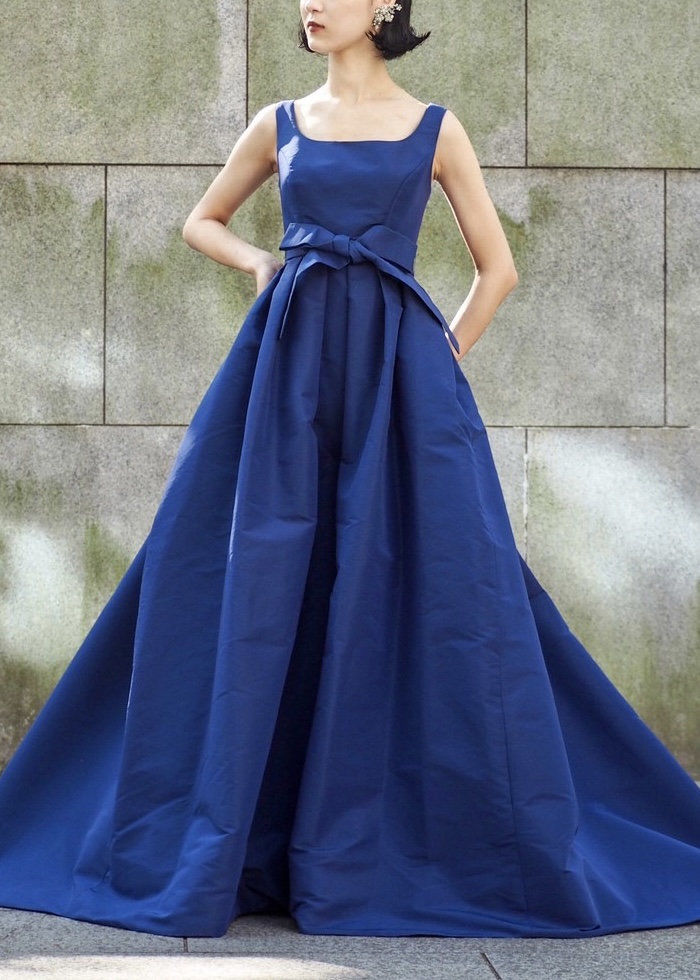 一目見た瞬間から心躍るような、鮮やかなコバルトブルーのカラードレス。ブルーと言えば爽やかで清涼感ある印象をイメージされる方も多いかと思いますが、深すぎず淡すぎない絶妙なカラーは不思議と凛とした雰囲気の中に大人の華やかさを演出します。首元はスコープネックラインというスクエアのカッティングになっていることで女性ならではのデコルテの美しさを魅せつつ、ぐっとモダンさとエフォートレスな雰囲気をプラス。タイトめにデザインされたトップスのウエストに施されているコンパクトなリボンと、ボックスプリーツが作り出すスカートの立体感ある広がりからは、ほんのり甘さを感じます。現代的でフェミニン、そして女性らしいエレガントさ。全てがほどよく融合されたドレスはまさにモニーク ルイリエの世界観でしか感じることのできない1着なのです。お召しになった花嫁様が振り返ると、贅沢に使用したシルクファイユのトレーンが広がり、ファイユの生み出すなめらかな光沢感とラグジュアリーさがより一層存在感を生み出します。そして背中の大胆なカッティングにより、バックスタイルですらもアイコニックなデザインはパーティーに集まったゲストの皆様の記憶にも強く残ることでしょう。都会的な雰囲気もありつつぱきっとした鮮やかな色使いだからこそ、温かみのあるブラウン調の会場にはもちろん緑たっぷりの自然の中や石畳のある街並みの中にもマッチします。これから迎える爽やかなシーズンでのガーデンパーティーや、前撮りでのロケーション撮影にもお勧めの1着です。