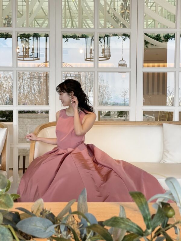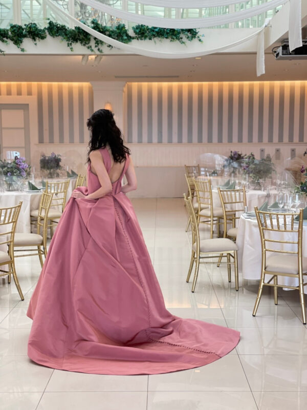 会場へ足を踏み入れた瞬間、吹き抜けるような天窓からたっぷりと贅沢に注ぎ込む自然光。緑や木の温もりを感じるノスタルジックなグレースヴィラでは、ゲストとのアットホームでナチュラルなパーティが叶います。そんな会場だからこそ、”FOREVER MODERN”をコンセプトにトレンドに左右されず女性が持つ本来の美しさを最大限に引き出し、時を経ても永遠に愛されるシンプルながら洗練されたデザインを生み出してきたAMSALE(アムサーラ)のカラードレスをお召しいただきたいのです。アムサーラが今回ザトリートドレッシングのために制作してくれたオリジナルデザインのカラードレス。長い月日をかけてブランドとのやり取りを重ね、納得のいくまで生地や色味を探してオリジナルで生地の色を染めるところからこだわり抜きました。そして私たちは、見たことのないスモーキーでモダンなくすみピンクに出会うことができたのです。ピンクと言えばフェミニンで愛らしいイメージをお持ちの方もいるかもしれませんが、その概念を覆すような絶妙な色味だからこそ大人可愛いお洒落なブライズスタイルをイメージする花嫁にお召しいただきたいカラードレスなのです。