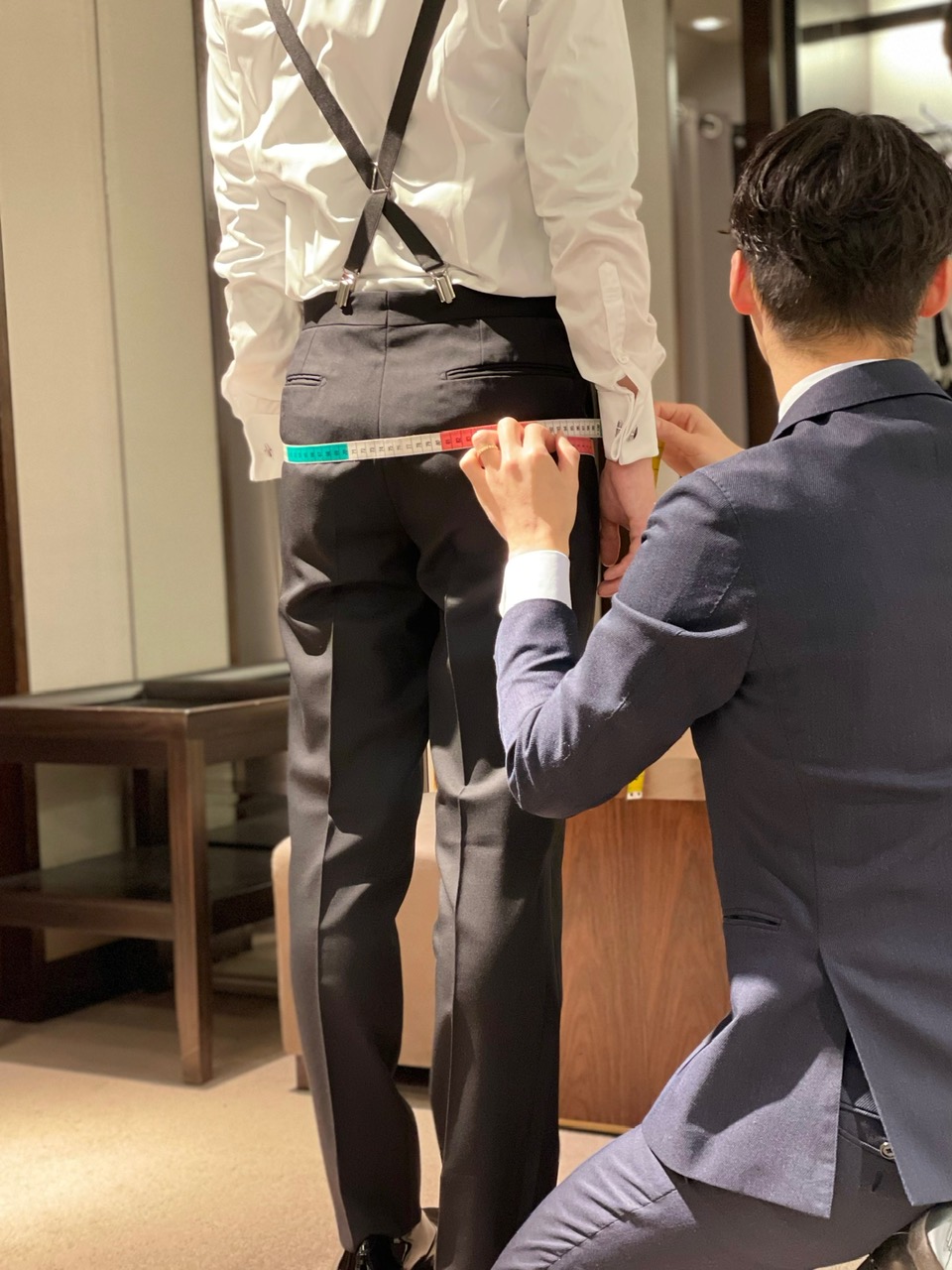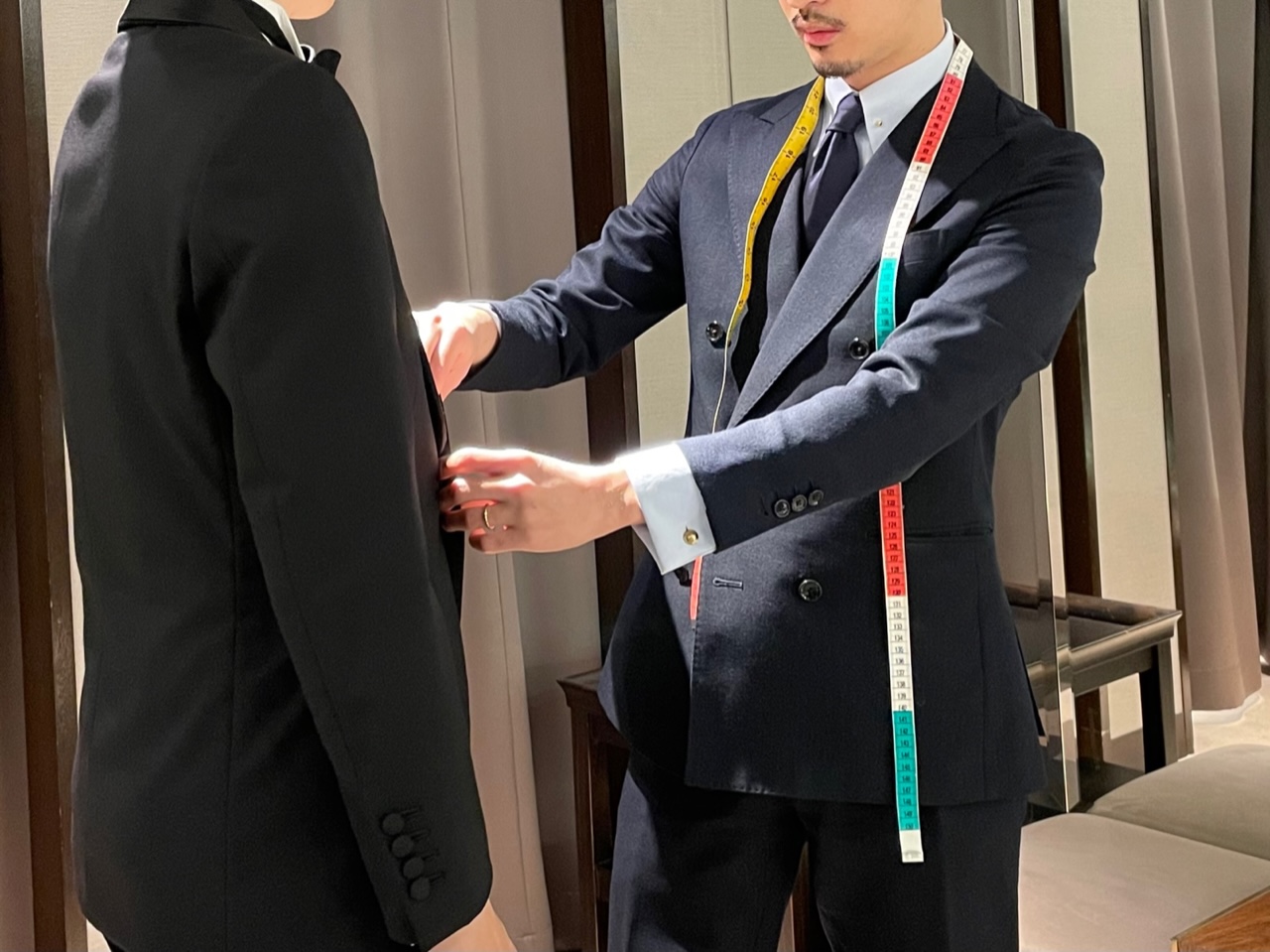 ザ トリートドレッシングでは、既存のレンタルのタキシードに加えて、ご自身の体型に合わせてお仕立ていただけるオーダーメイドのタキシードをご用意しております。ご新郎様のお身体に合わせてプロのコーディネーターより採寸をさせていただき、細部にわたるサイズ感の調整や、着心地、生地の選定なども行います。また、襟の形やフロント釦のつけ方などの細かなディティールもお選びいただけるので、よりご新郎様のお好みに合わせたタキシードを仕立てていただけます。お客様のお好みに寄り添い、プロとしてフォーマルウェアを仕立てることの大切さなども会話させていただきながら、ご新郎様の晴れの日の1着を採寸させていただきます。ご結婚式だけでなく、それ以降の喜びごとやお祝い事にも着用いただける、ご自身のフォーマルウェアをワードローブへ。今後のお二人のライフスタイルもより豊かにしてくれはずです。