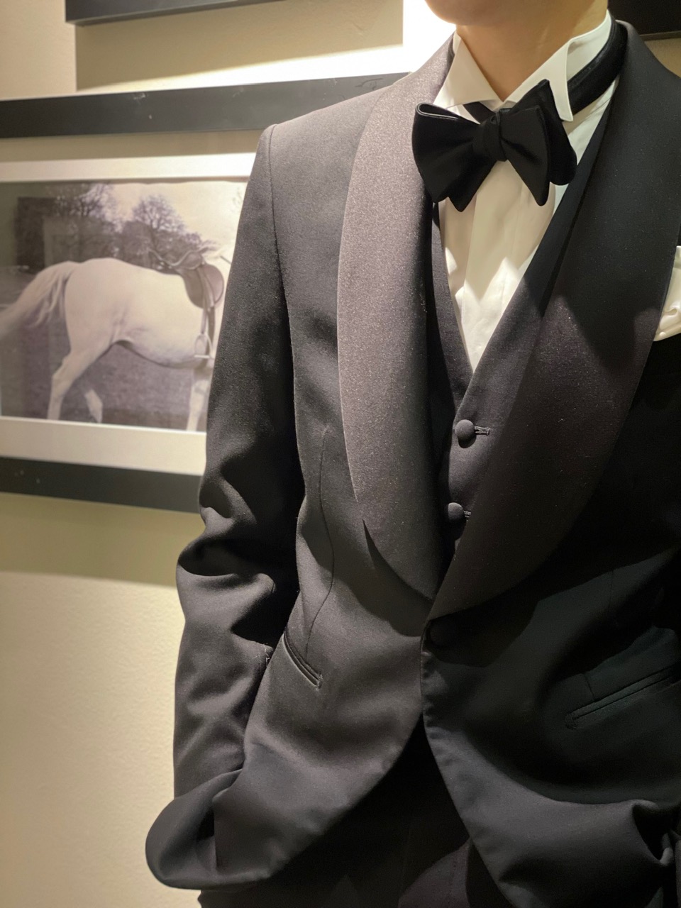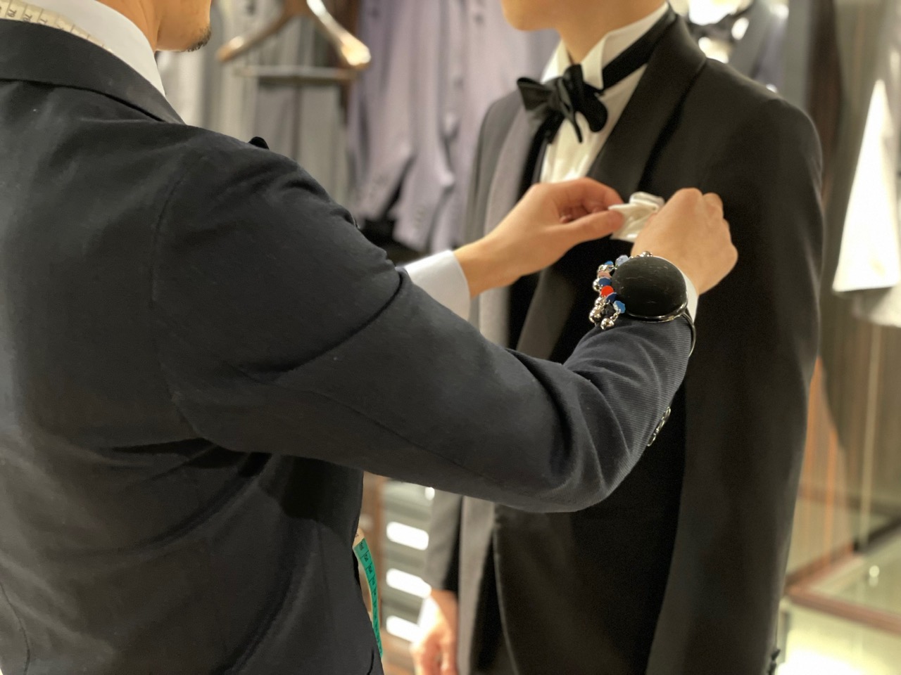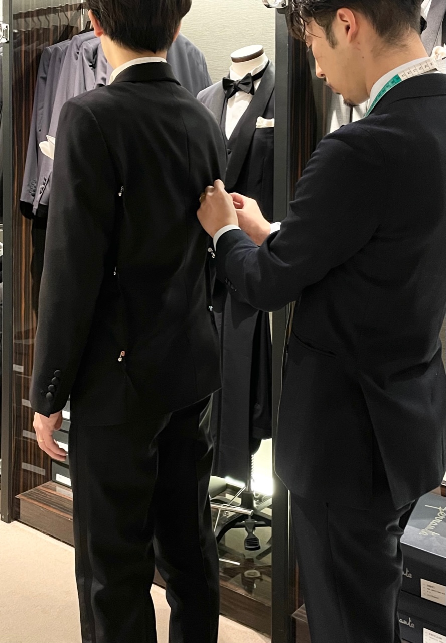 人生最良の一日に、ご自身だけの最高のタキシードを。ご新郎様の為に仕立てられたそのタキシードは新郎様は勿論、お二人で並ばれた際もより一層美しく、品のあるお姿でお式を過ごしていただけるでしょう。またお式が結んだあとには、ご新郎様だけの礼装として、ご結婚式の参列やフォーマルなパーティー、格式高いレストランでの食事に着用いただける。晴れの日用の1着として今後も一生をとも着用いただける礼装として。結婚式という大切な節目を機会にタキシードをオーダーする選択をしてみませんか。お二人のご来店を心よりお待ちしております。